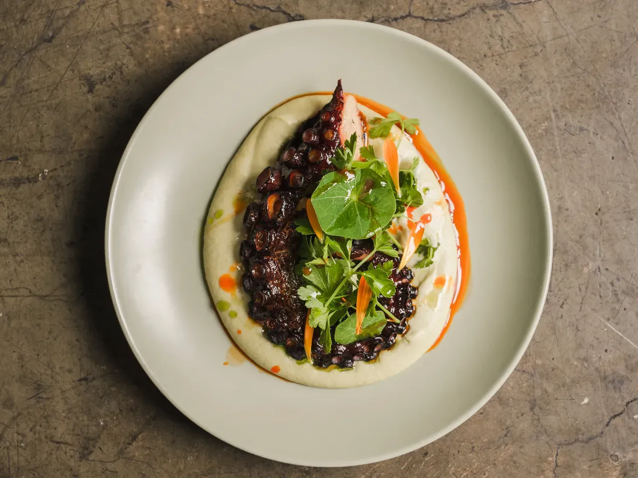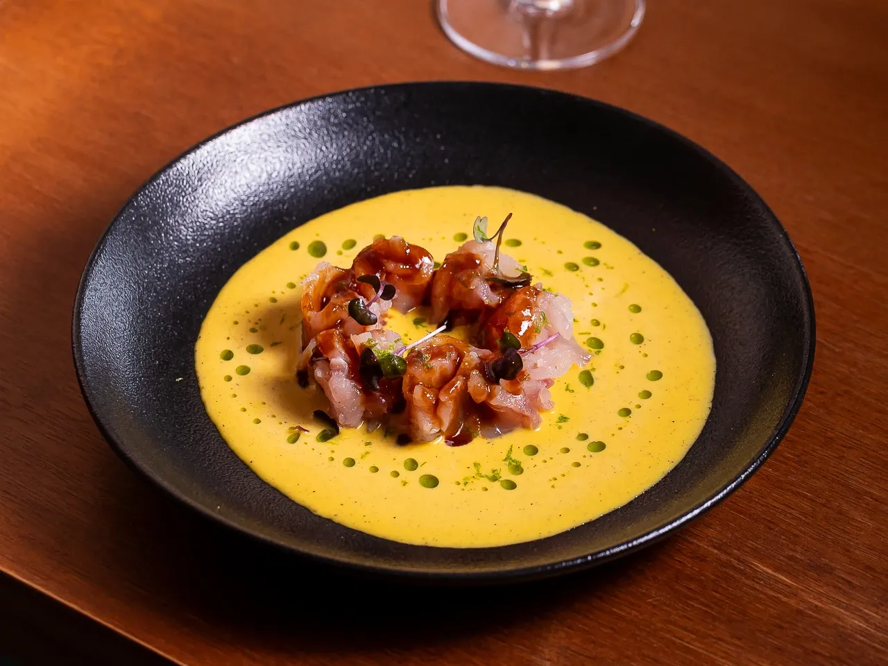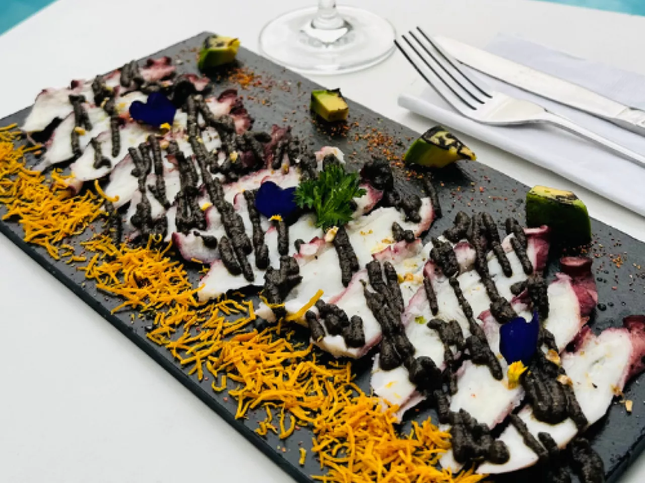 Finas láminas de pulpo acompañadas con crema de olivas negras, hilos de camote peruano con rocío de limas.