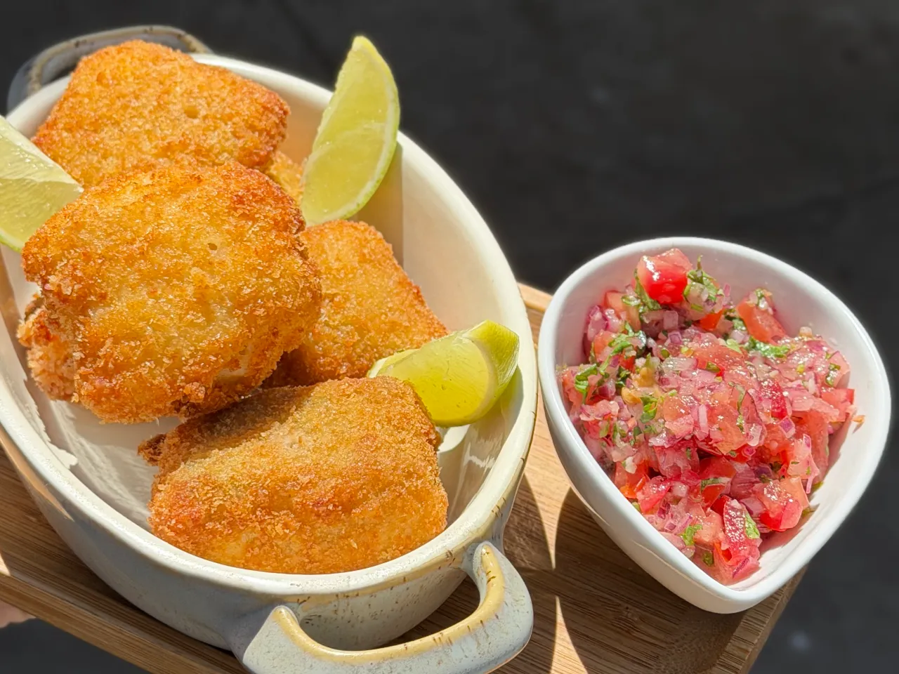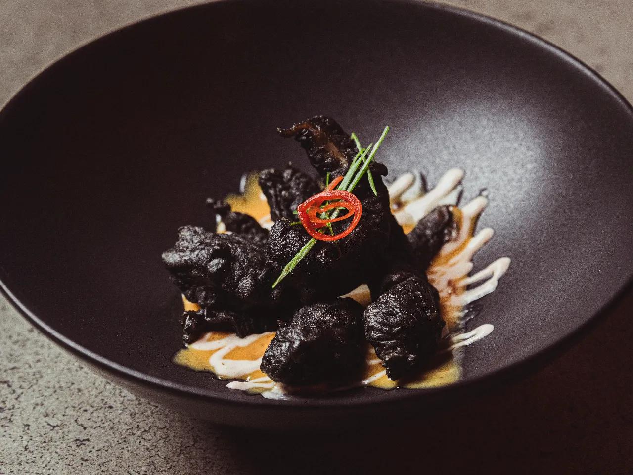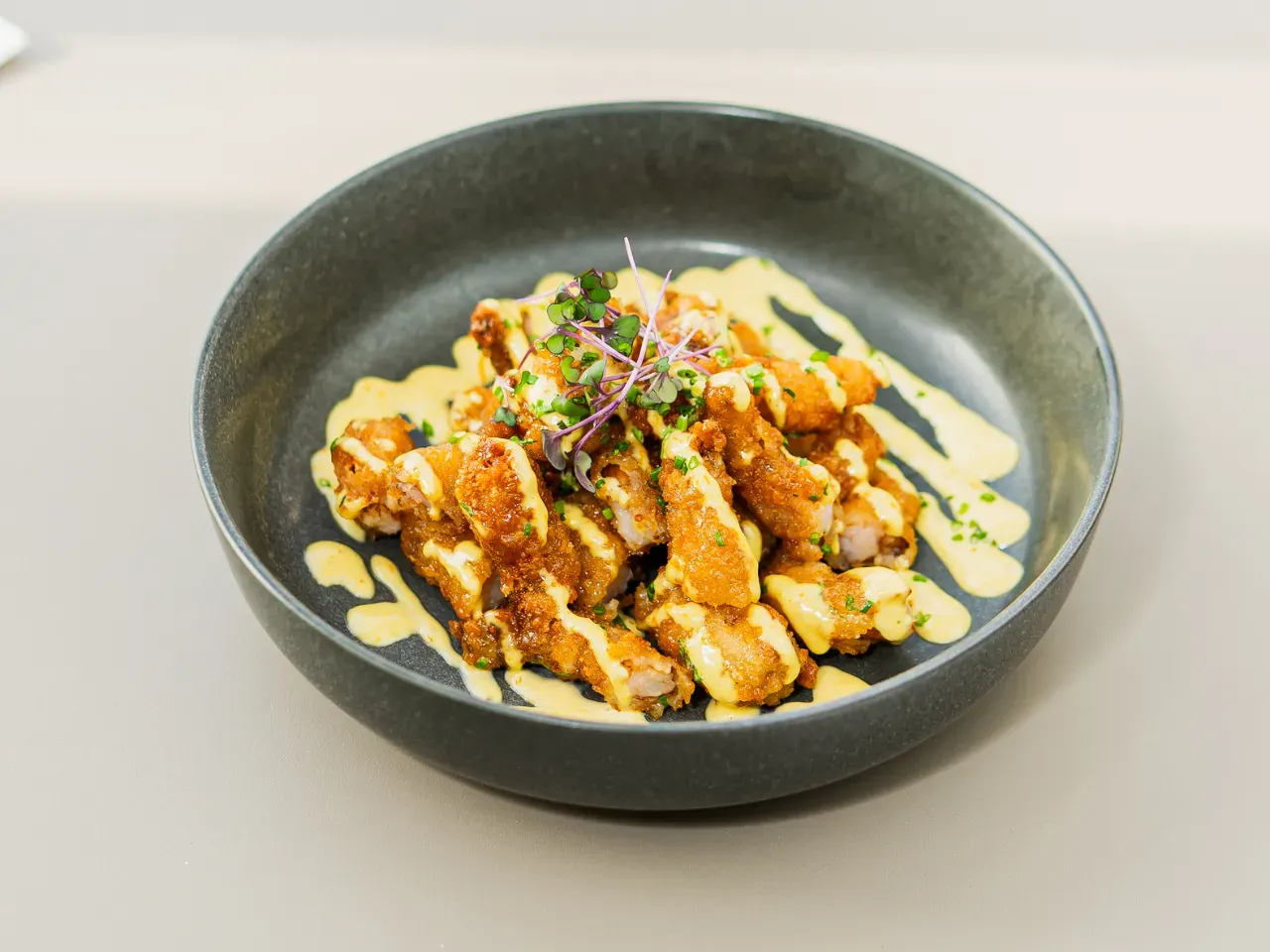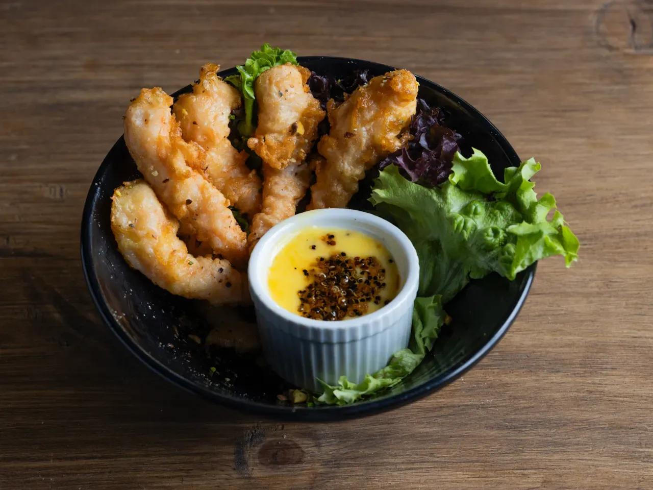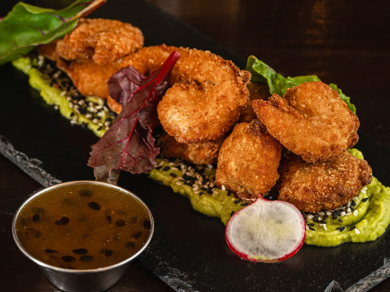 Apanados y envueltos en alioli de ajo negro. Se acompaña con arepitas de mix de semillas y pico de gallo de pepino encurtido.