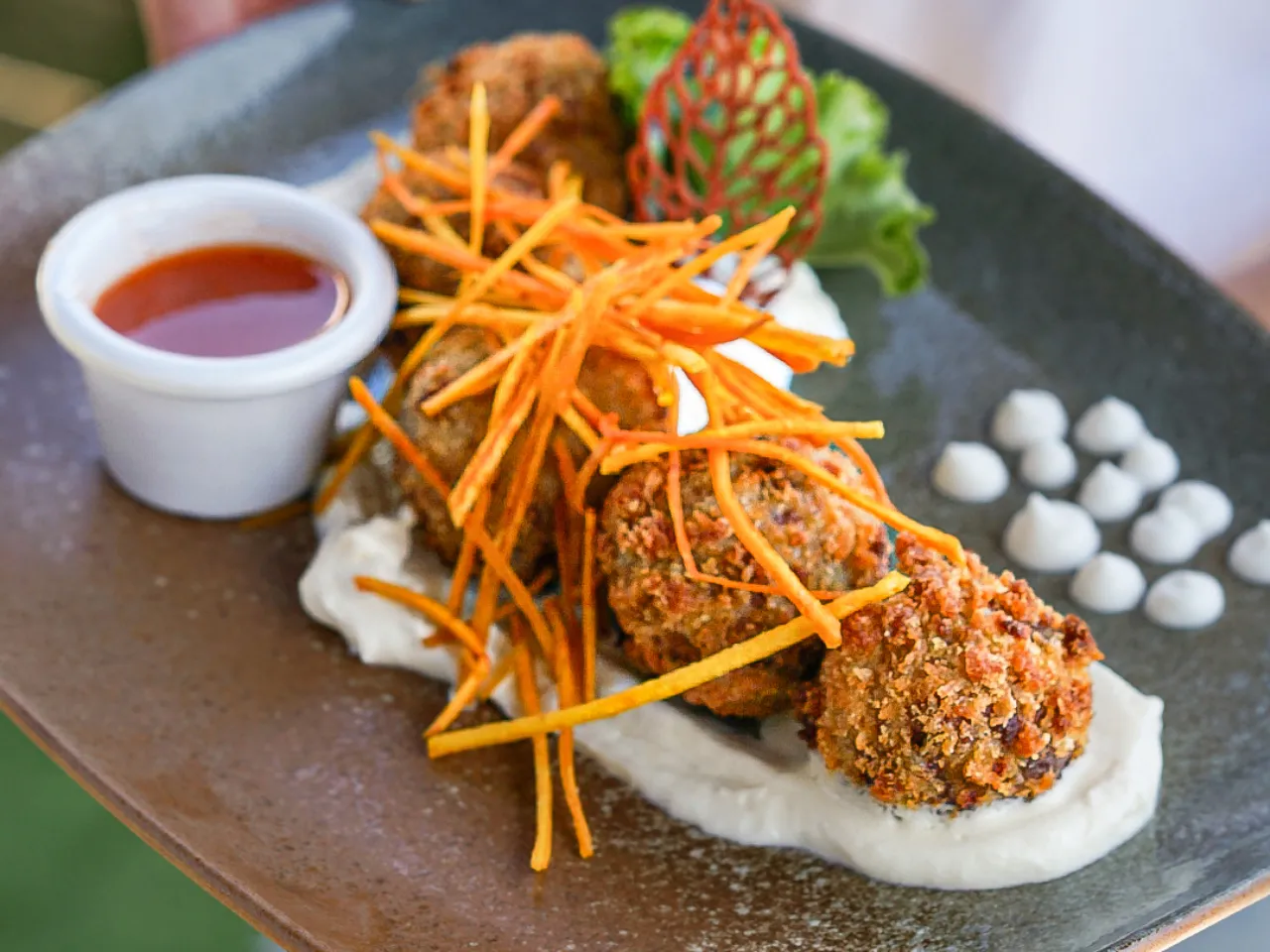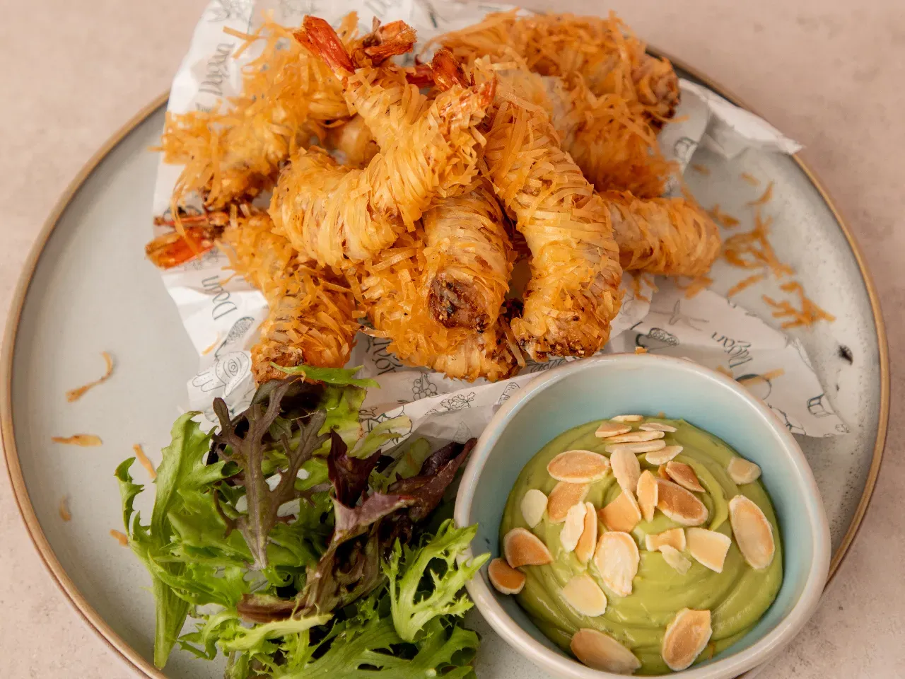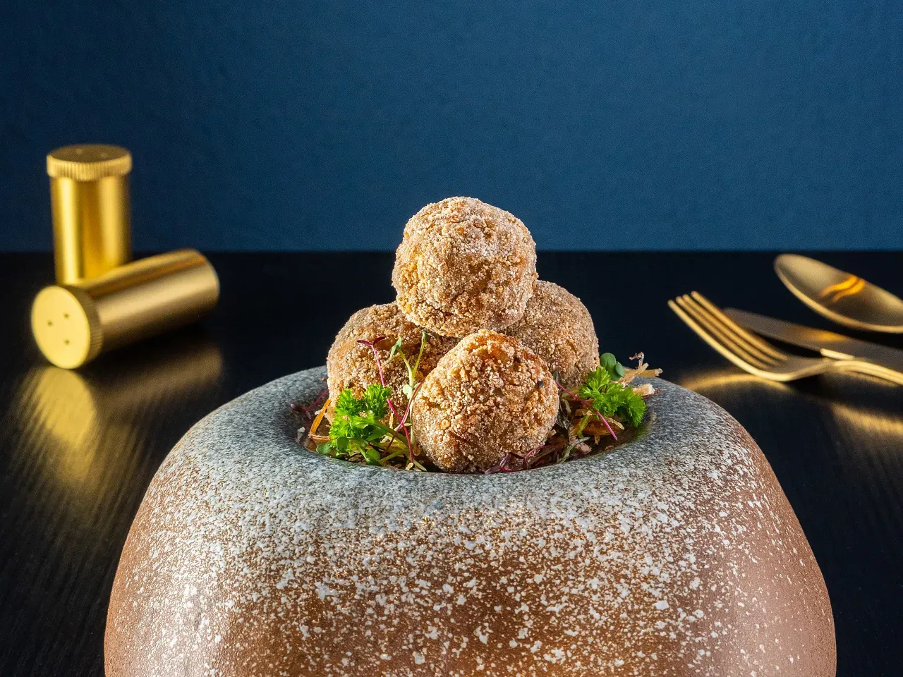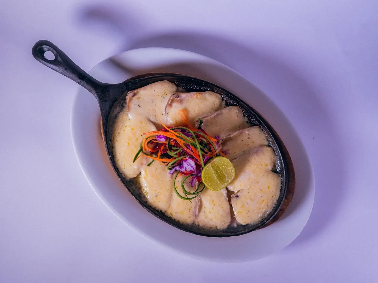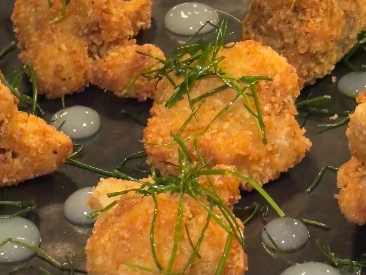 Apanados y envueltos en alioli de ajo negro. Se acompaña con arepitas de mix de semillas y pico de gallo de pepino encurtido.