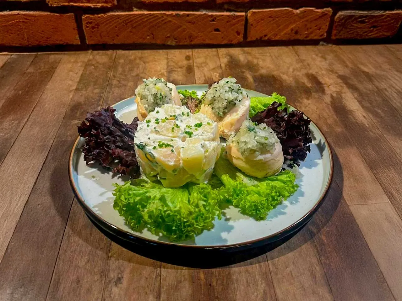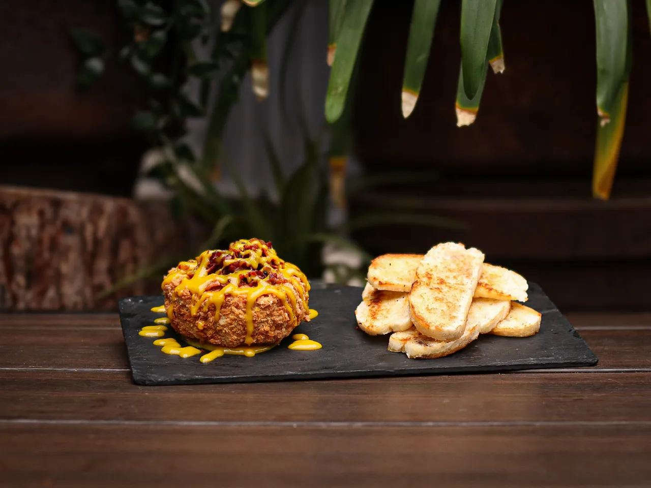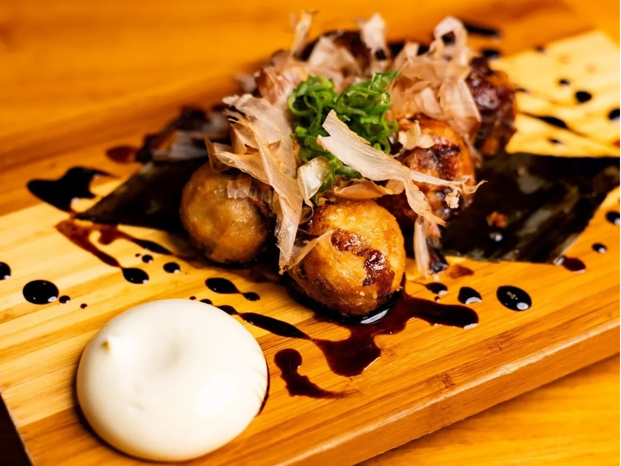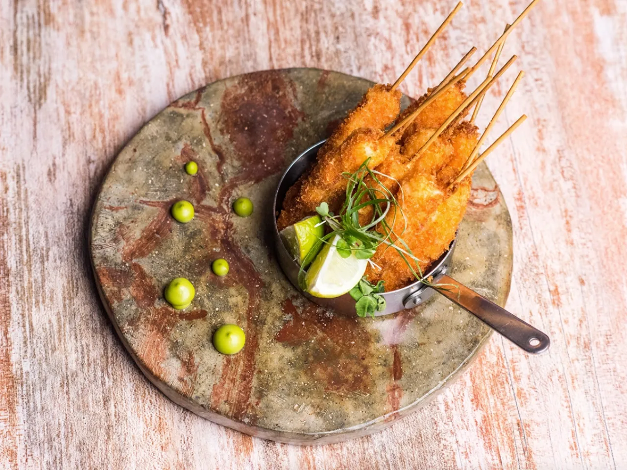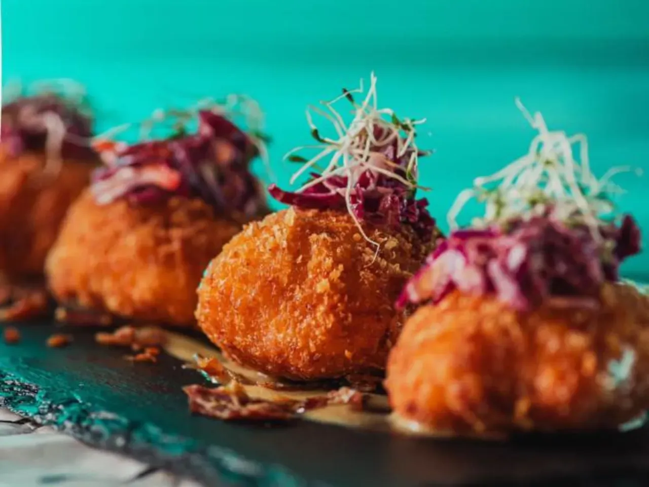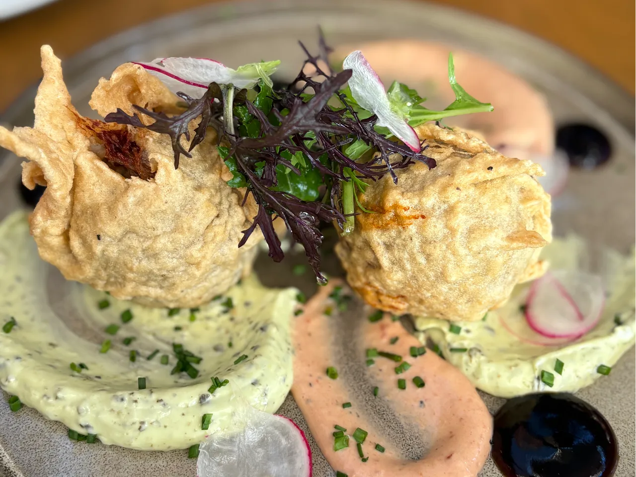 Apanados y envueltos en alioli de ajo negro. Se acompaña con arepitas de mix de semillas y pico de gallo de pepino encurtido.