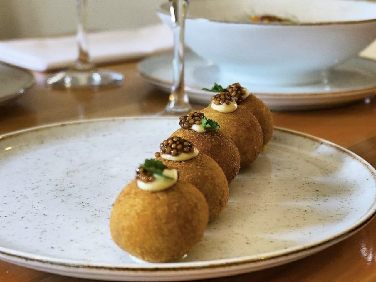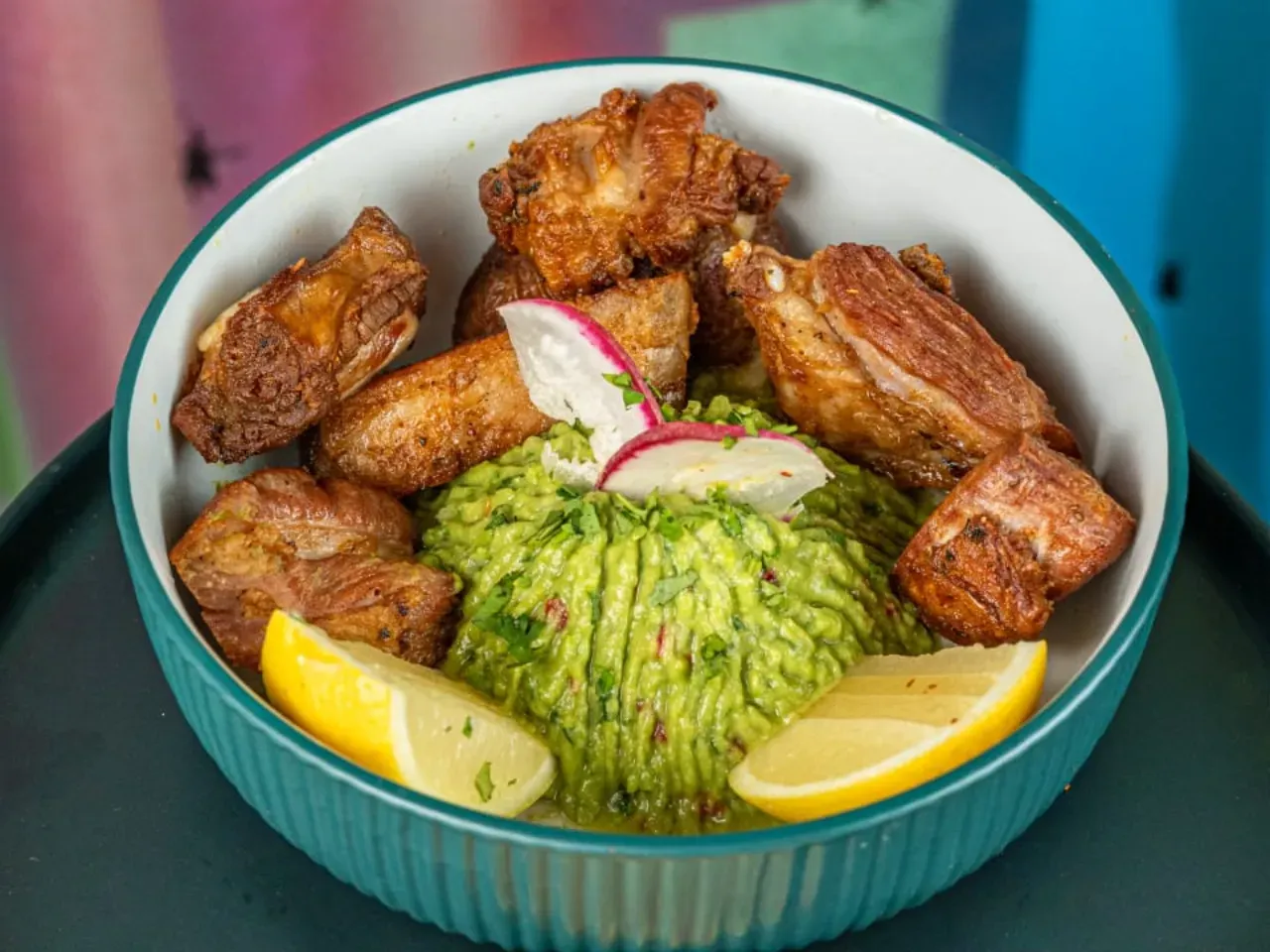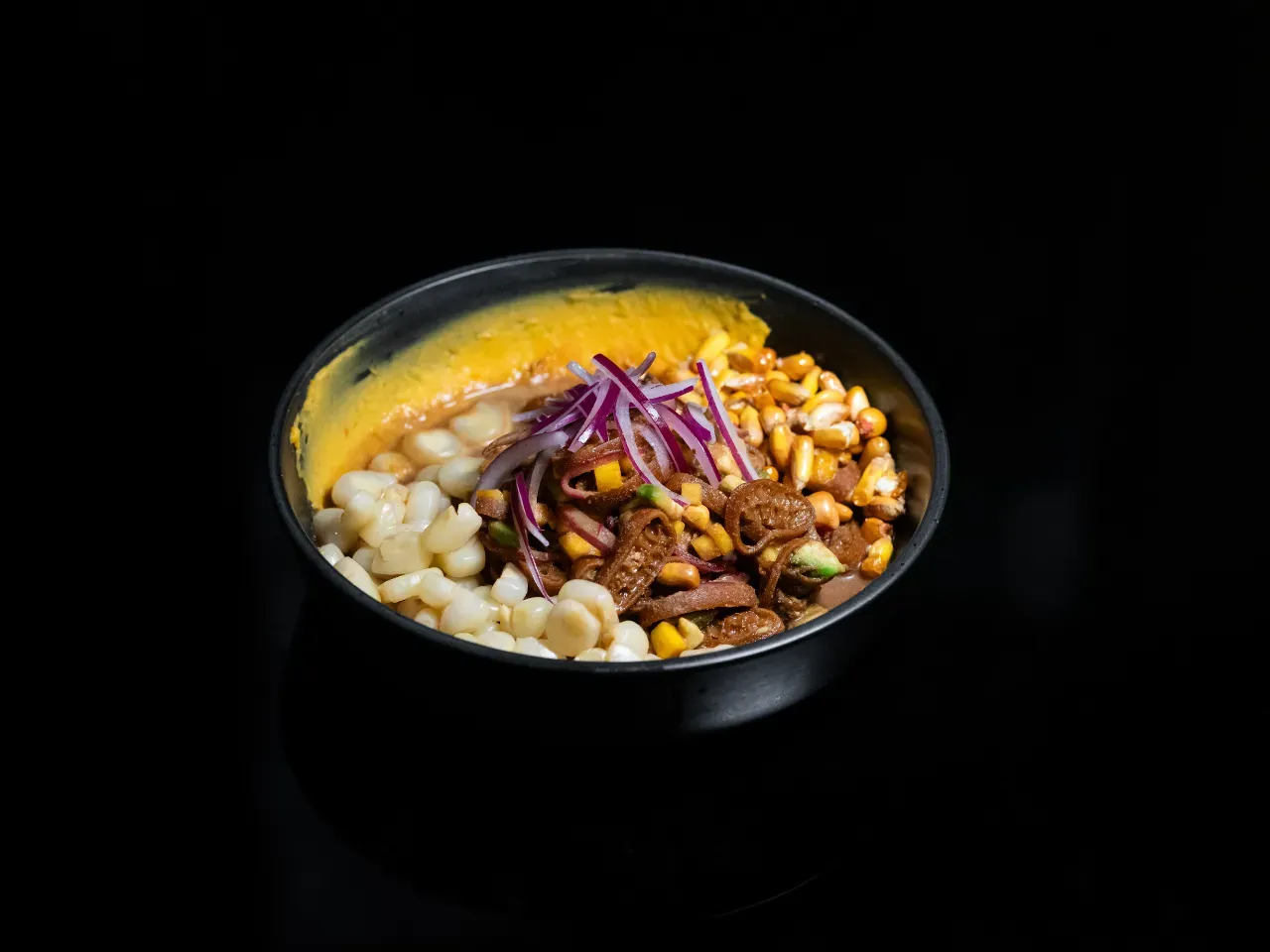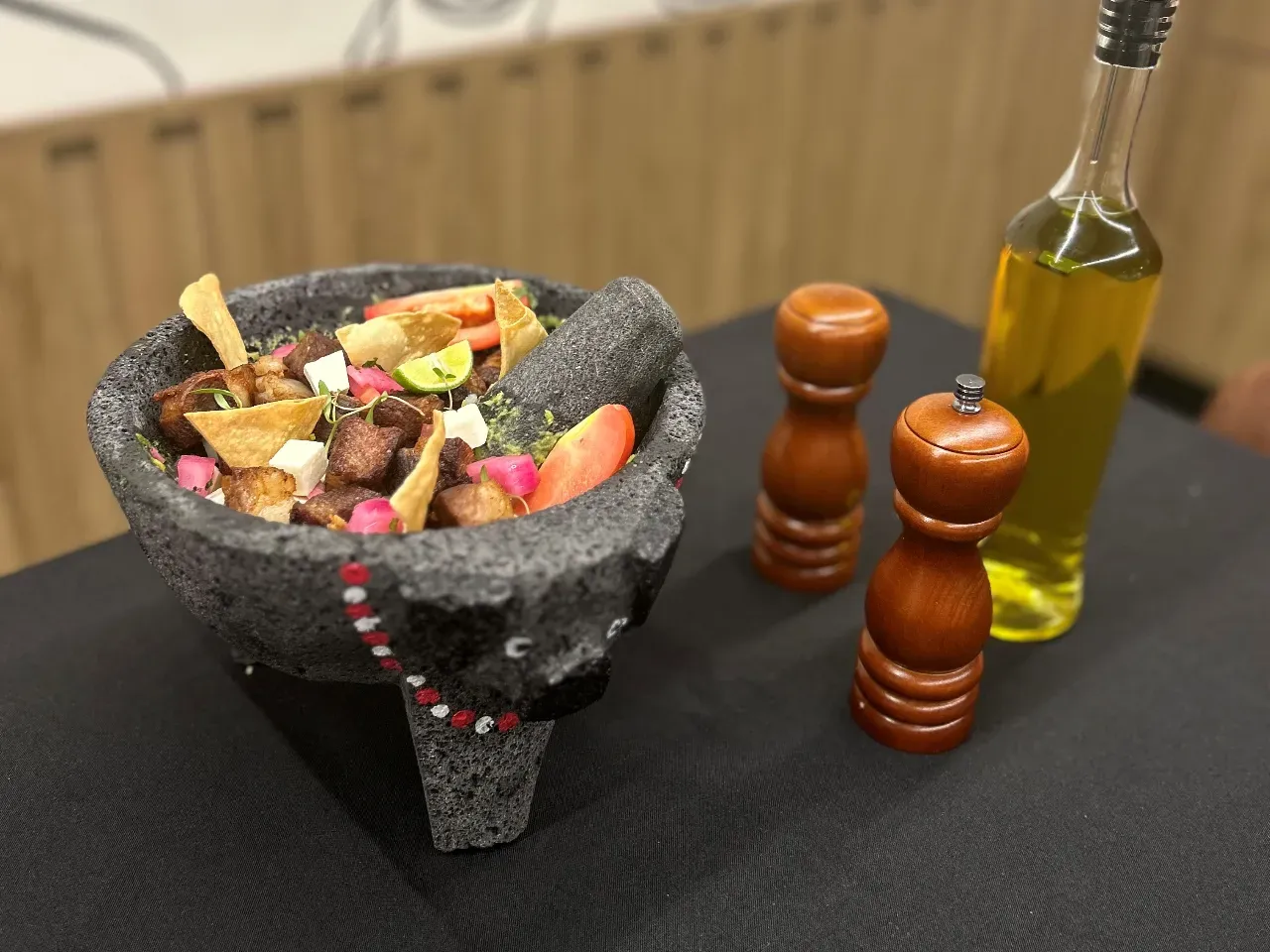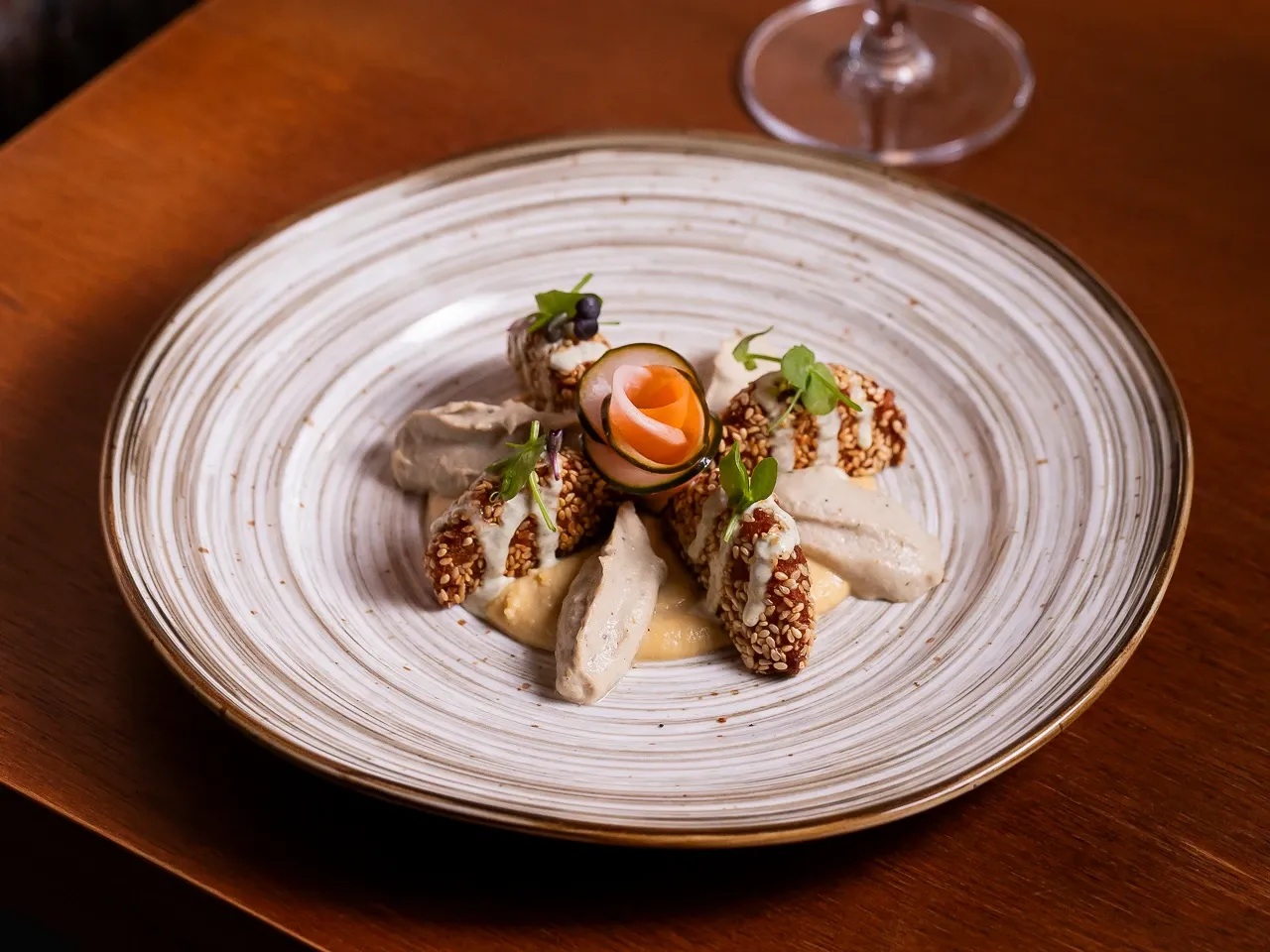 Apanados y envueltos en alioli de ajo negro. Se acompaña con arepitas de mix de semillas y pico de gallo de pepino encurtido.