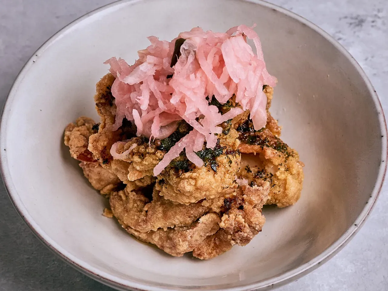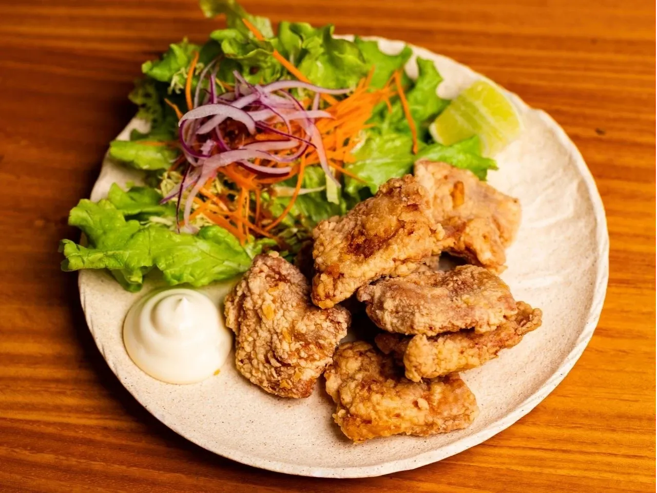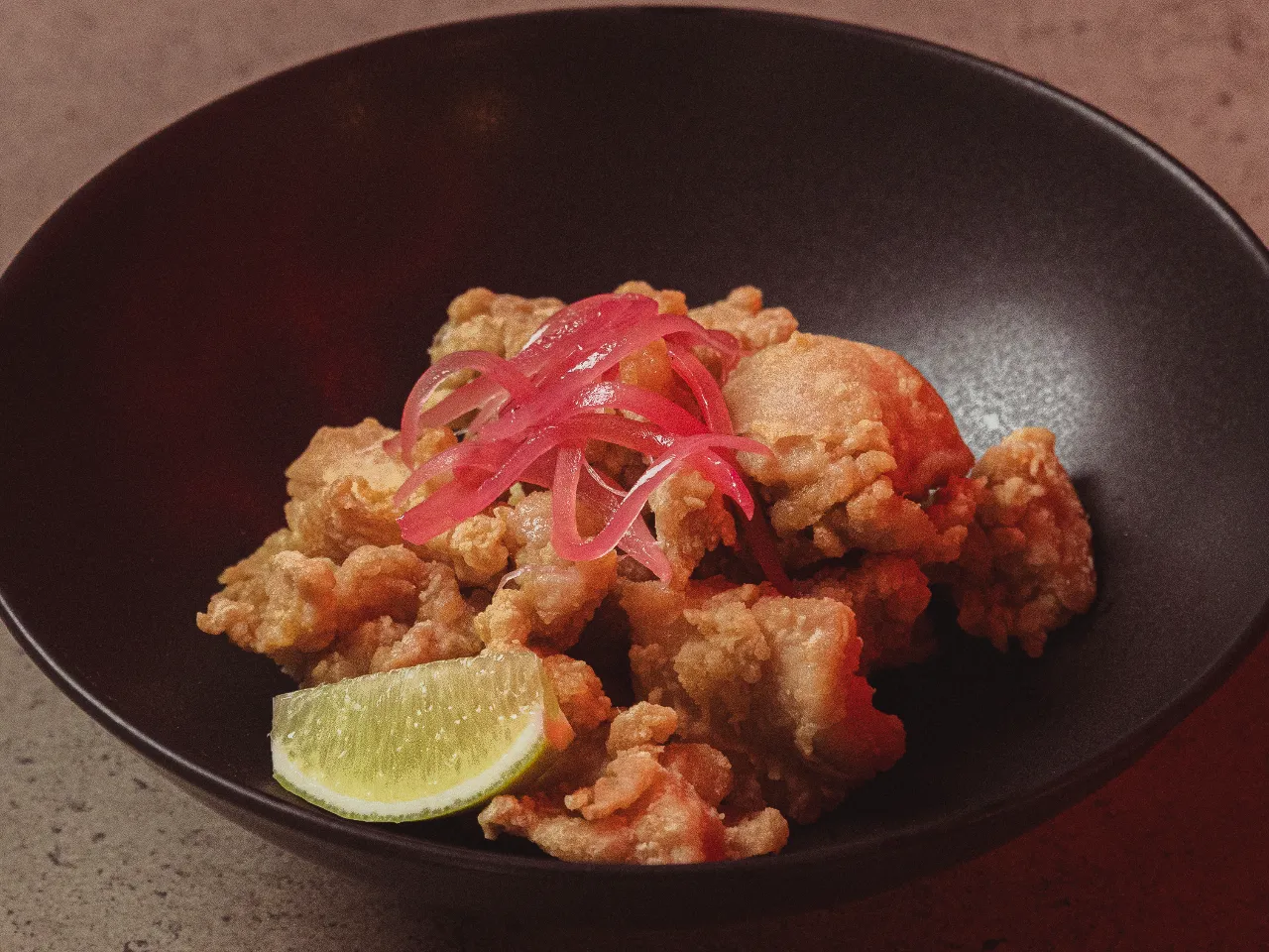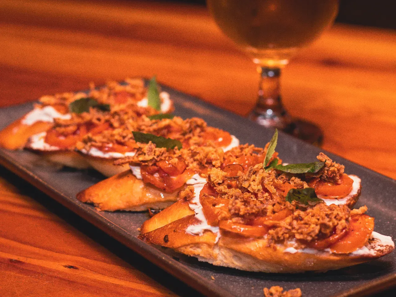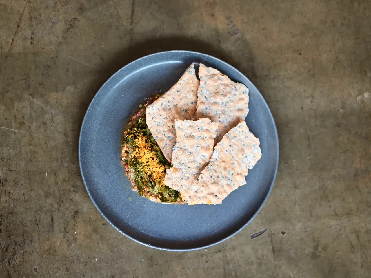 Apanados y envueltos en alioli de ajo negro. Se acompaña con arepitas de mix de semillas y pico de gallo de pepino encurtido.