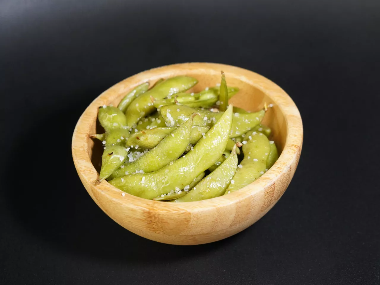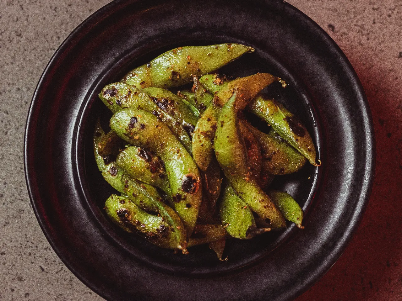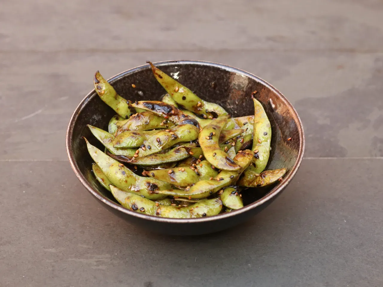 Vainas de frijol de soya al wok con aceite de sesamo, toques de soya y sal maldón