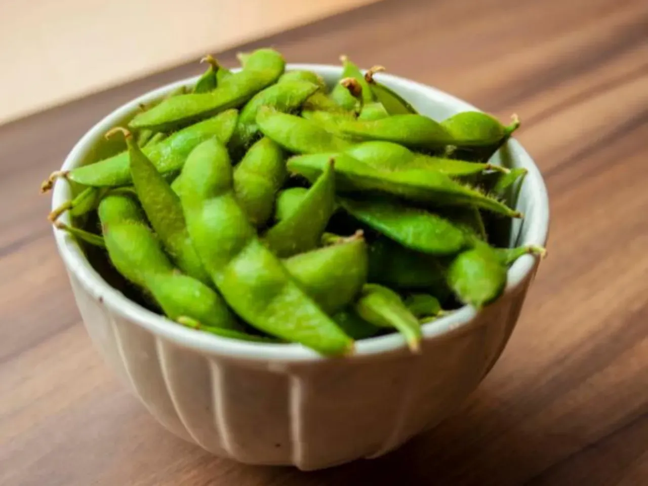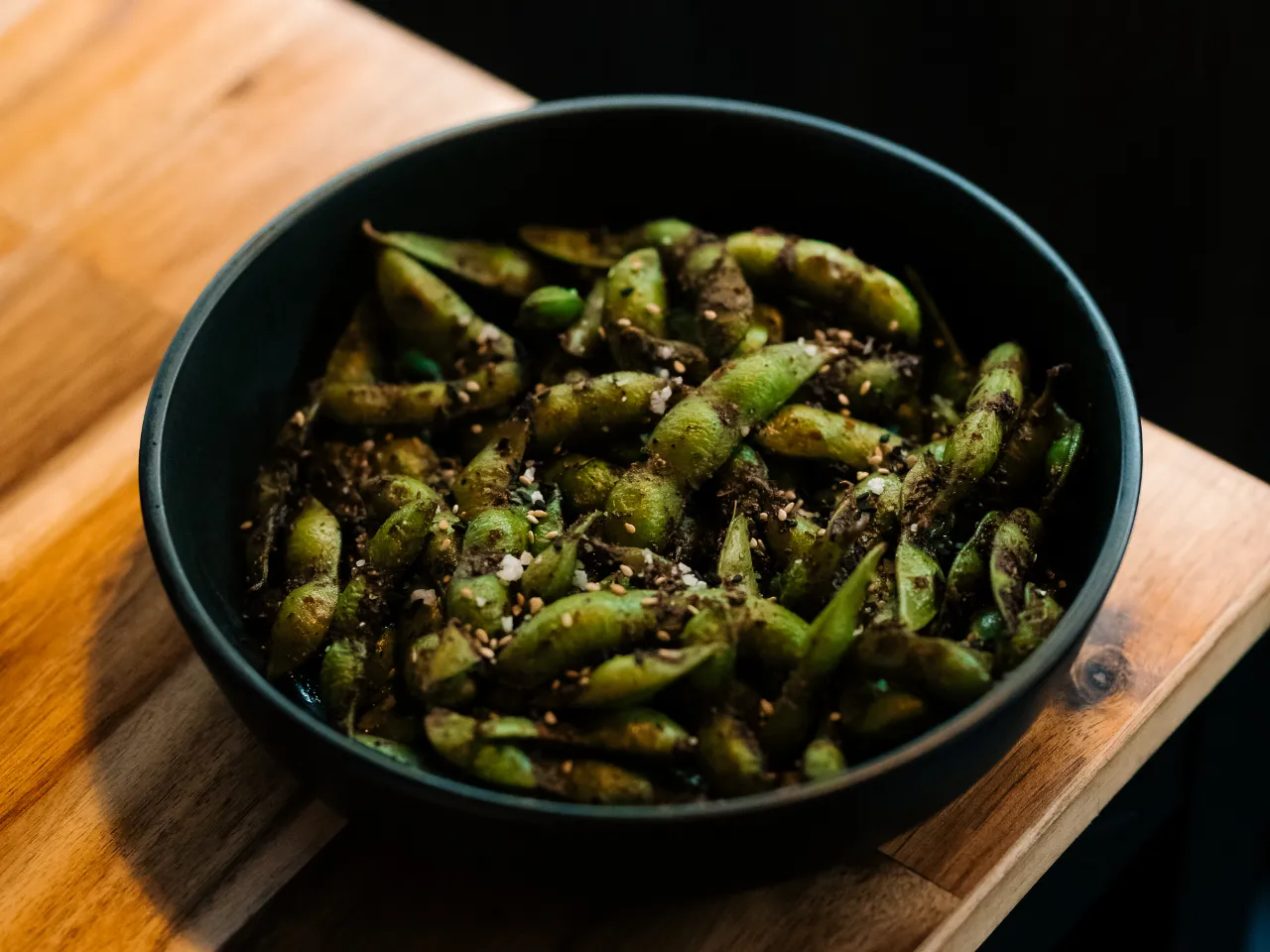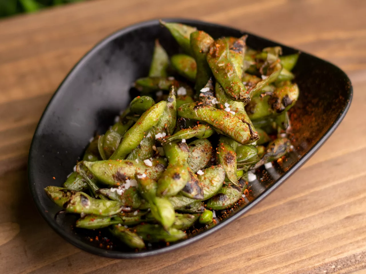 Vainas de frijol de soya al wok con aceite de sesamo, toques de soya y sal maldón