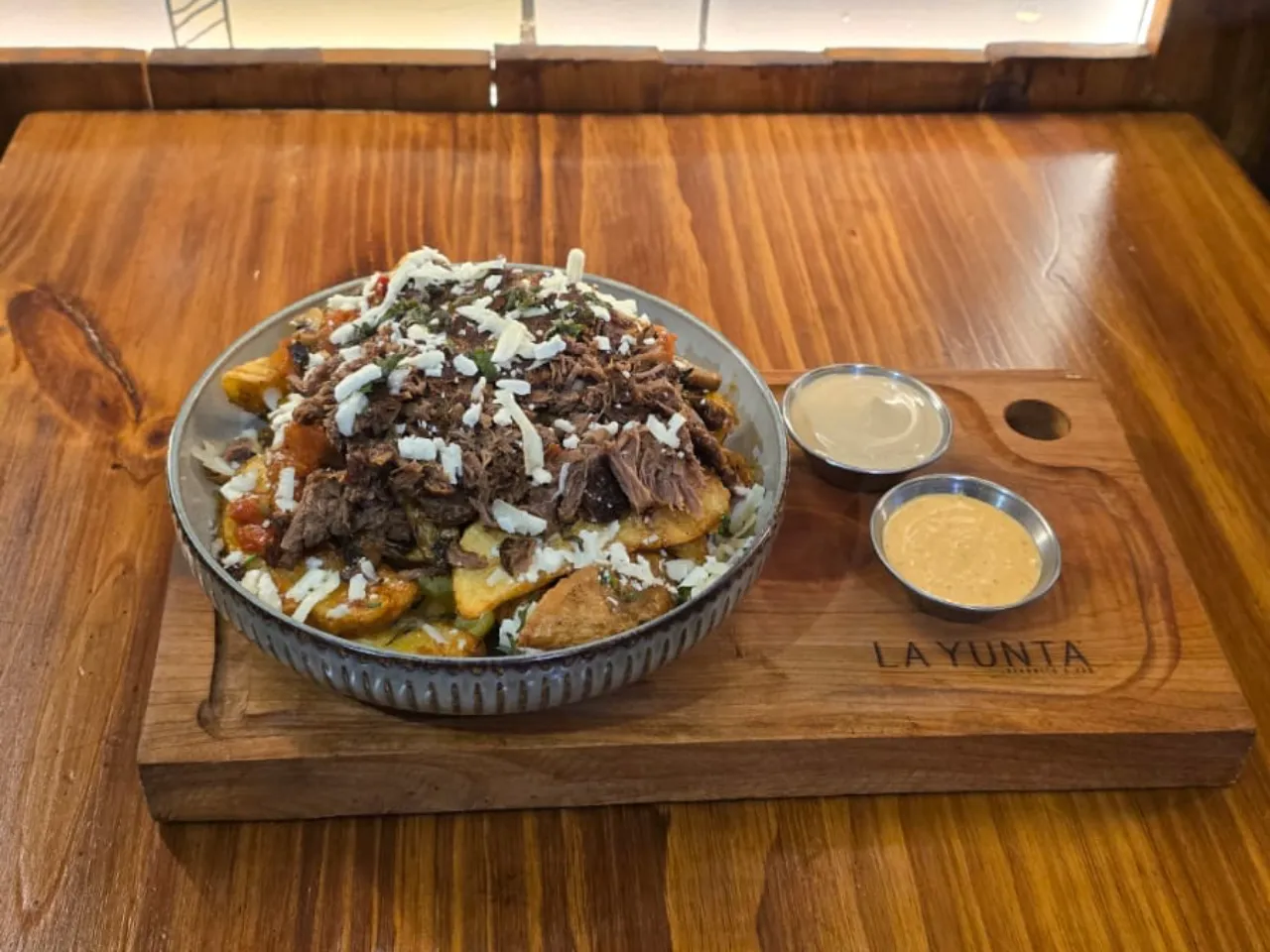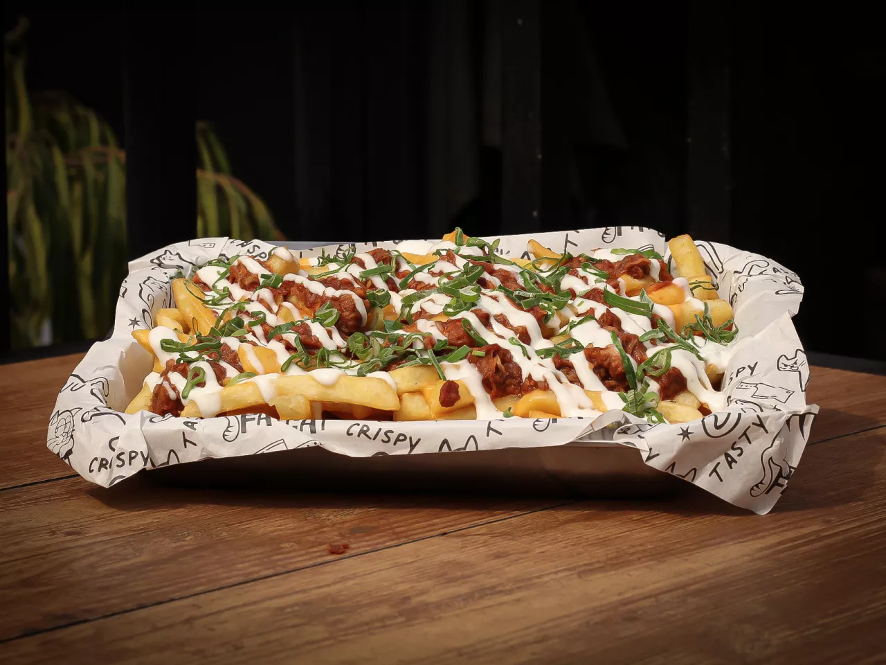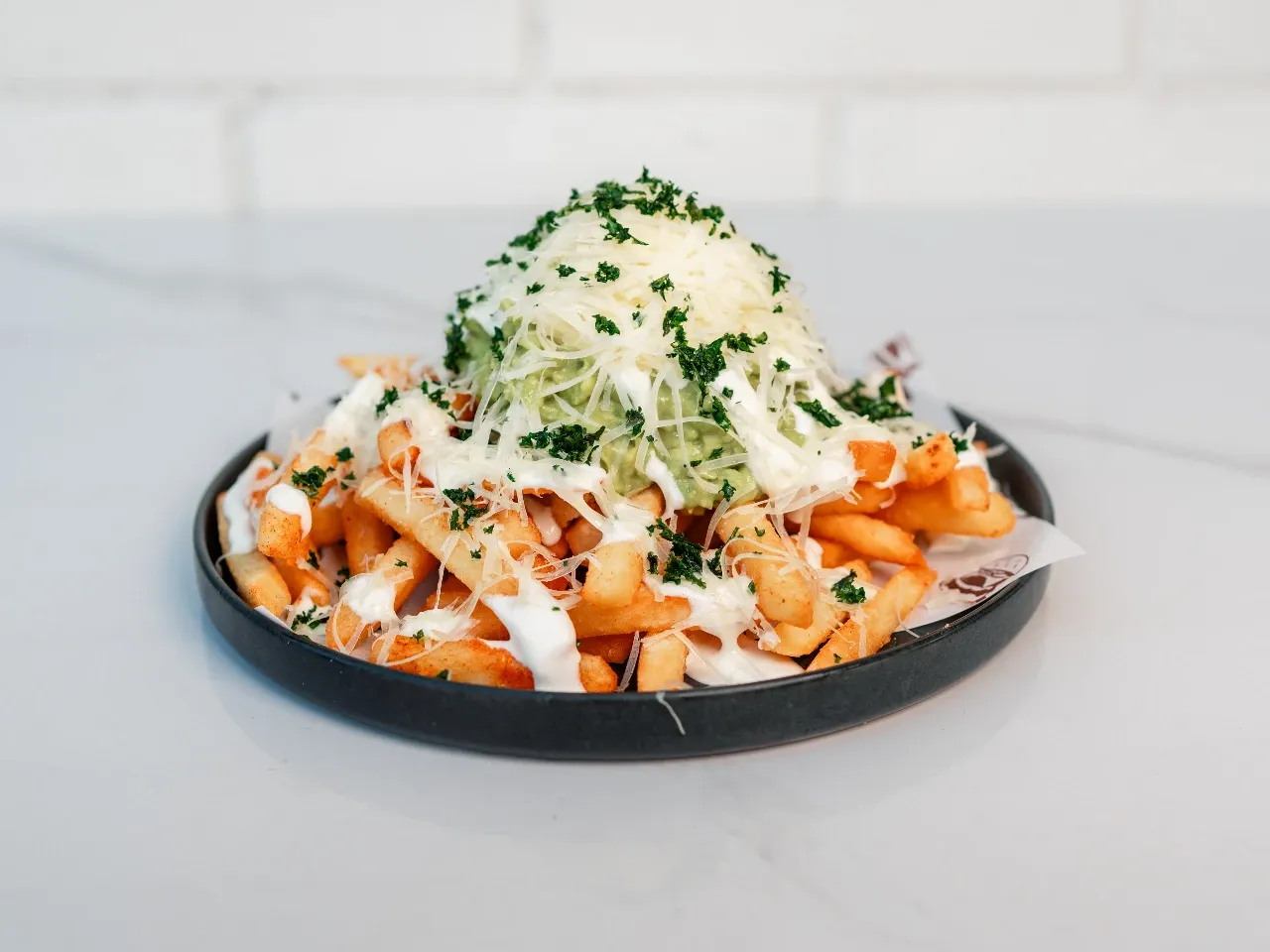 Papas super crispy bañadas en queso cheddar, longaniza ahumada, sour cream y cebollín. Acompañadas de una porción de pebre.