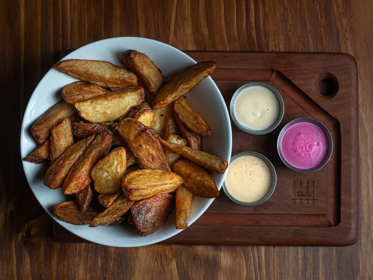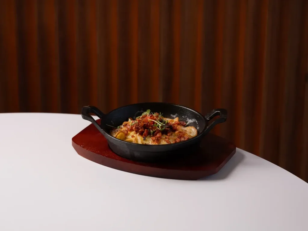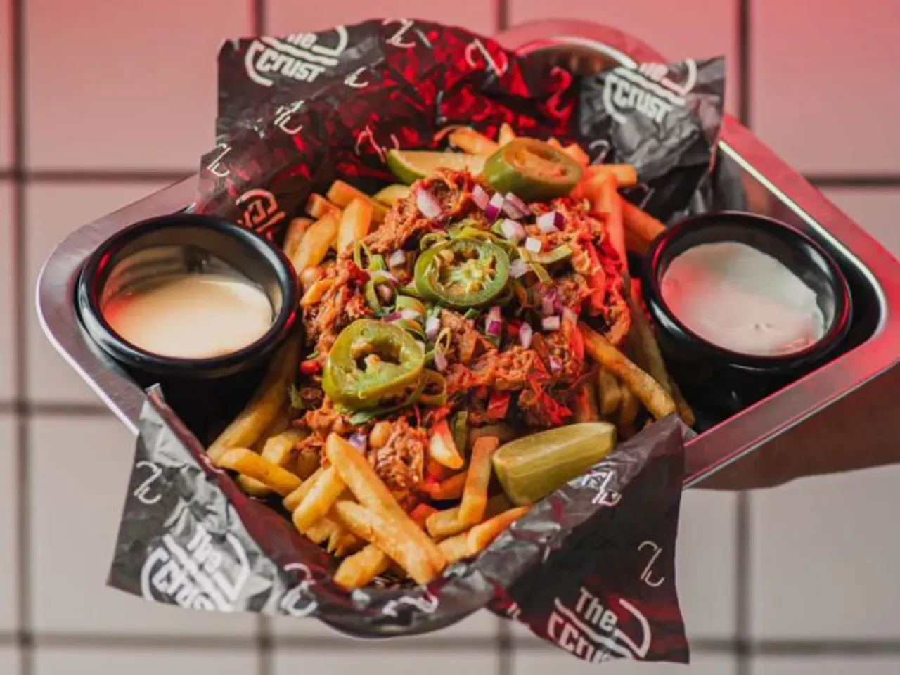 Papas super crispy bañadas en queso cheddar, longaniza ahumada, sour cream y cebollín. Acompañadas de una porción de pebre.