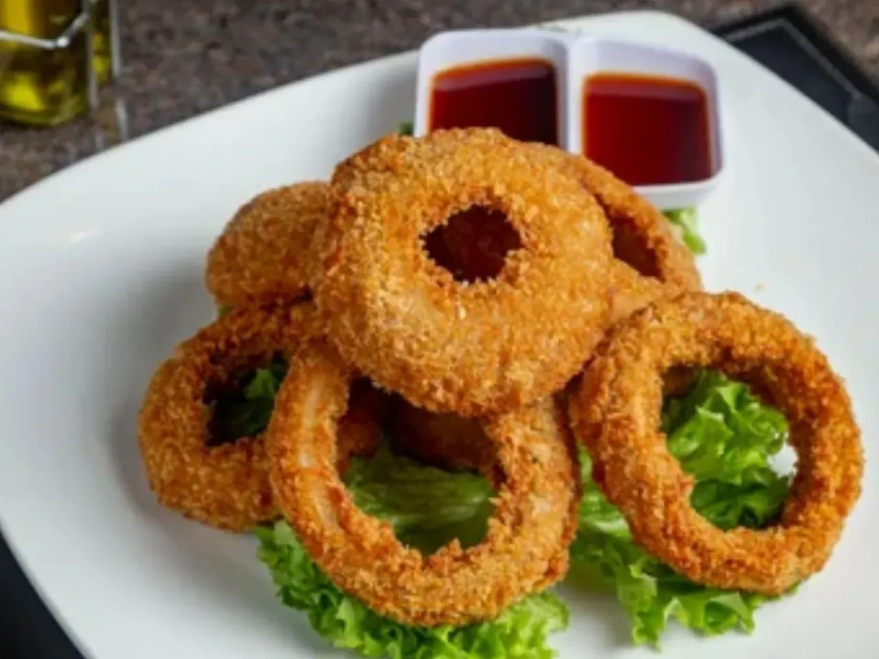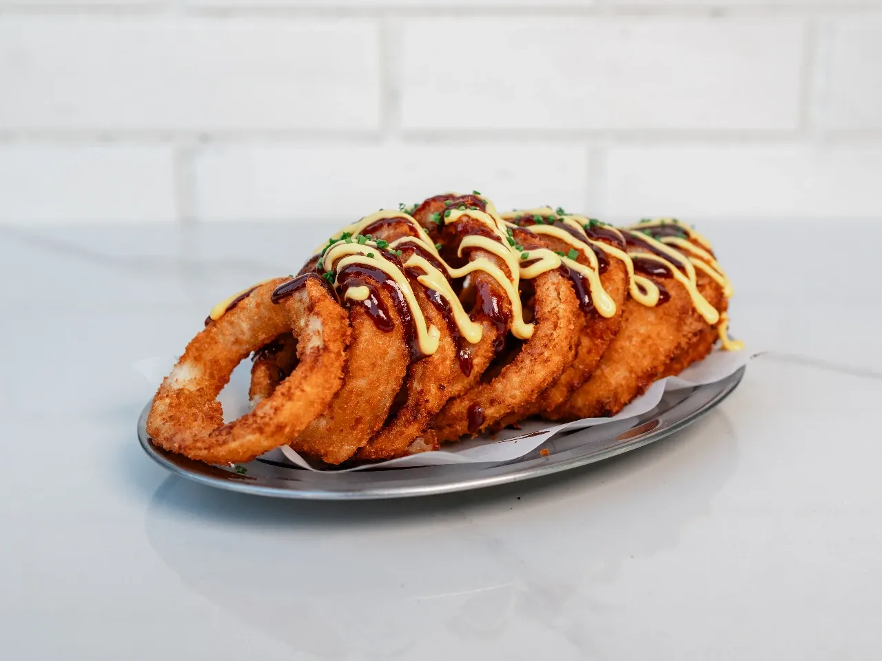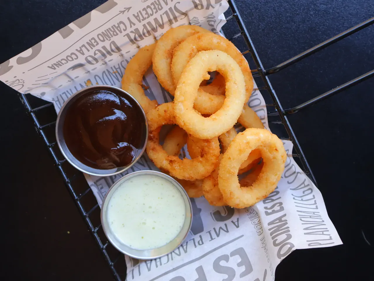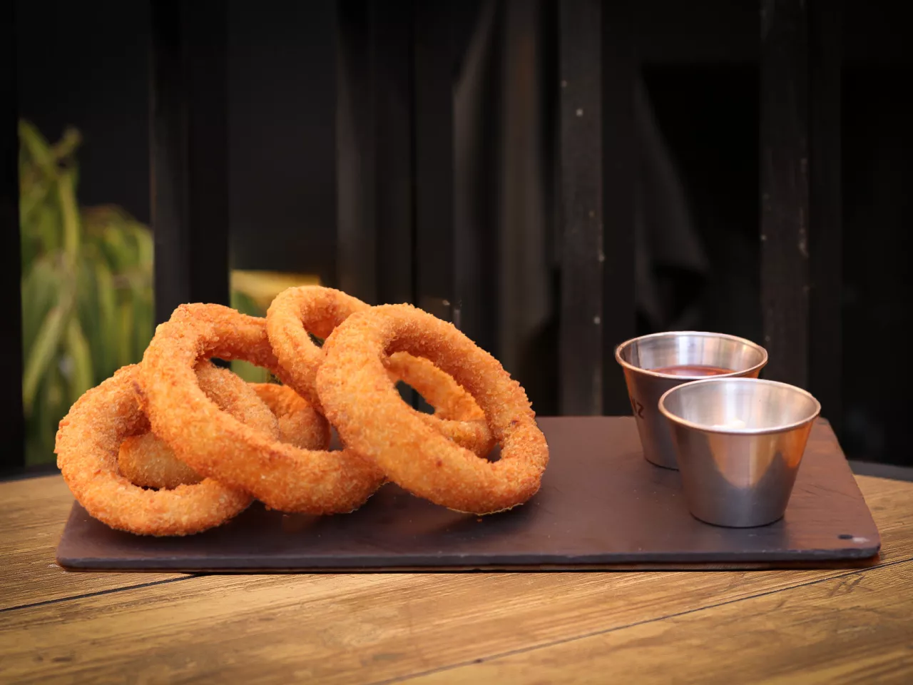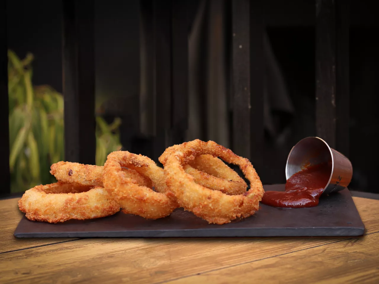 5 colosales aros de cebolla hechos a mano, apanados en panko acompañados de nuestra exquisita salsa agridulce Epicat y BBQ americano.