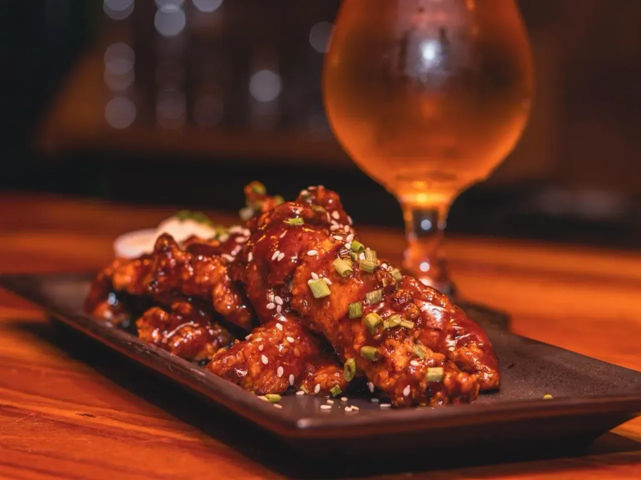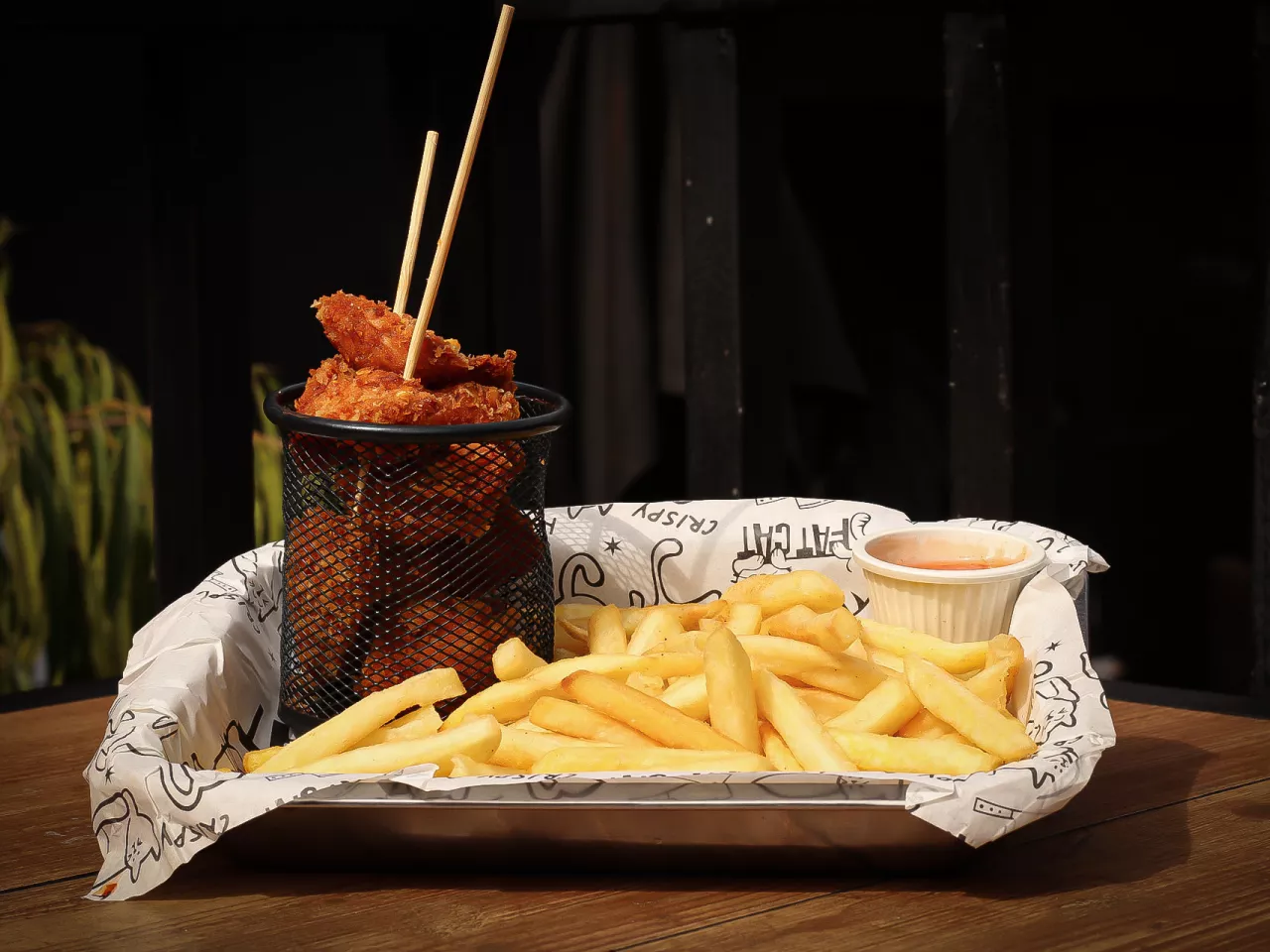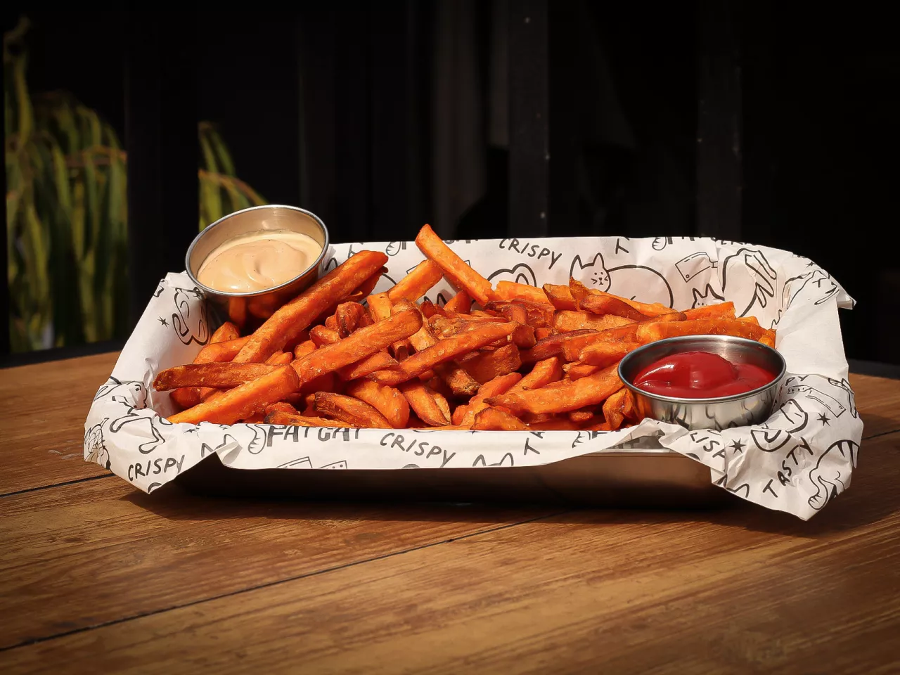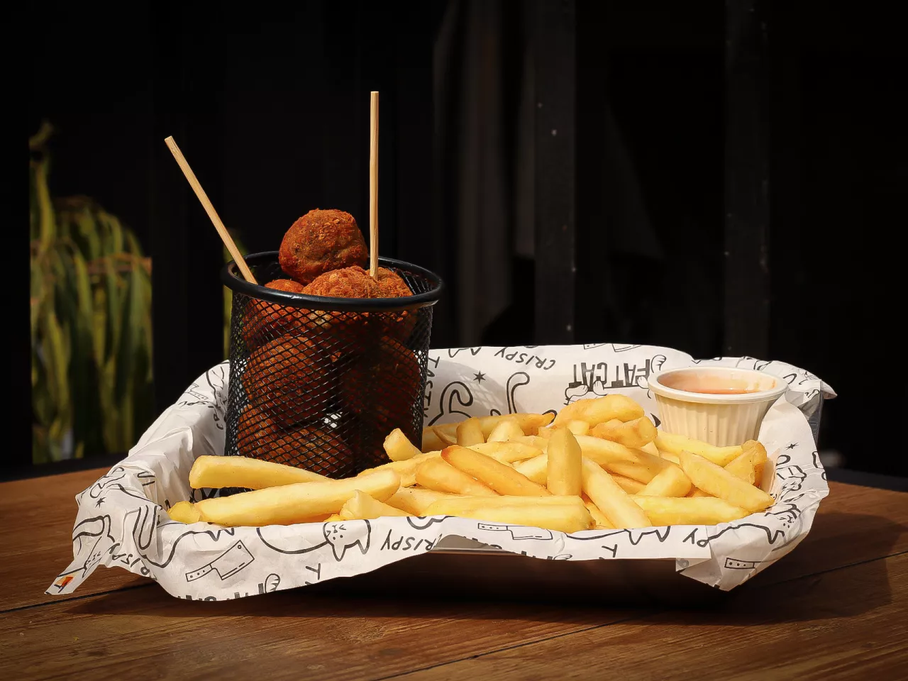 5 colosales aros de cebolla hechos a mano, apanados en panko acompañados de nuestra exquisita salsa agridulce Epicat y BBQ americano.