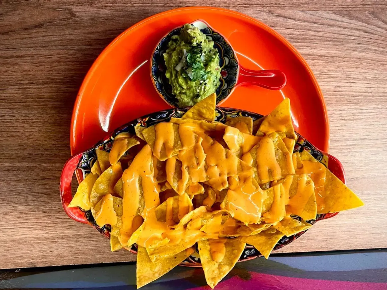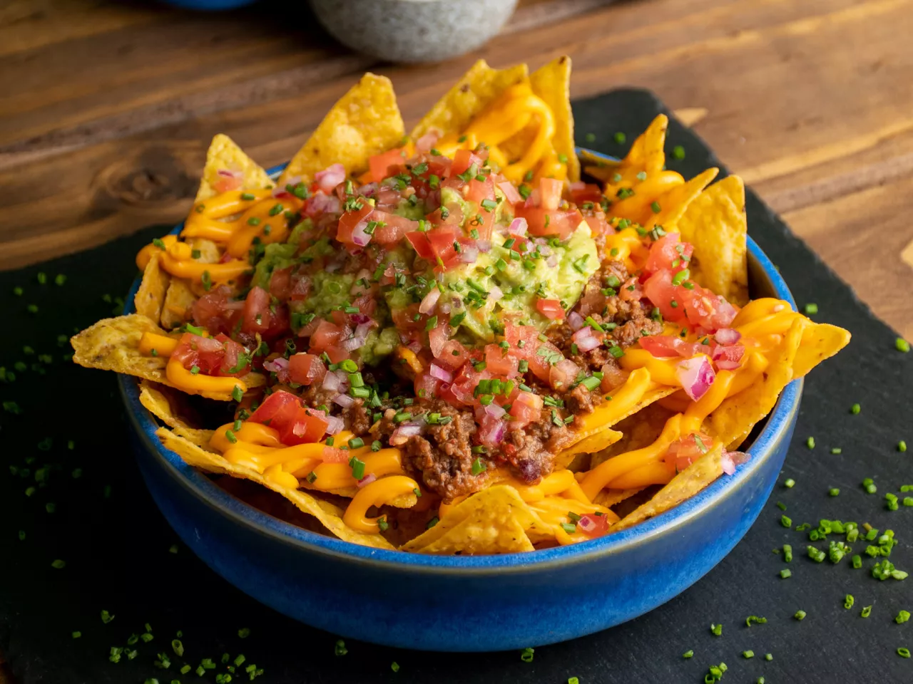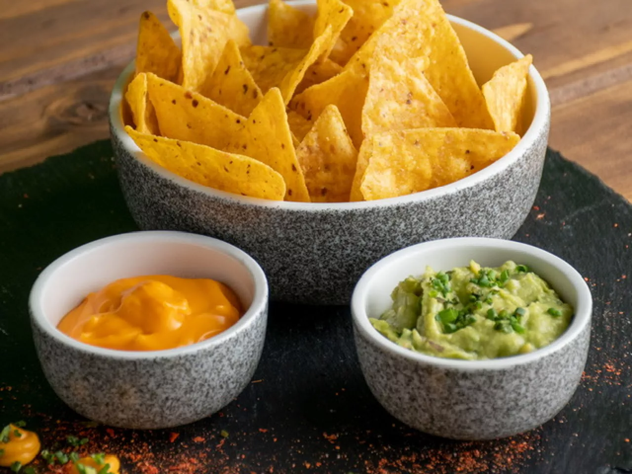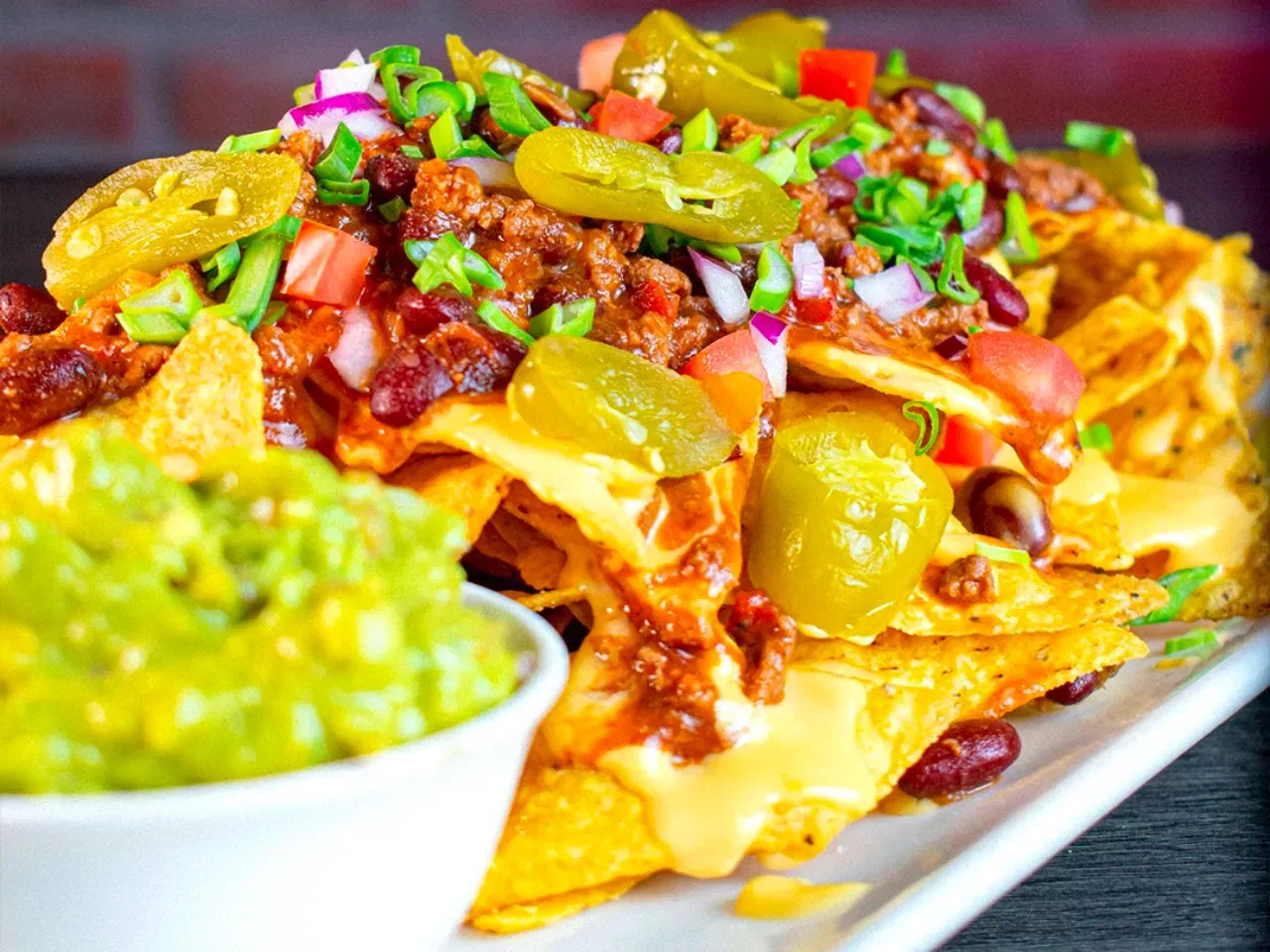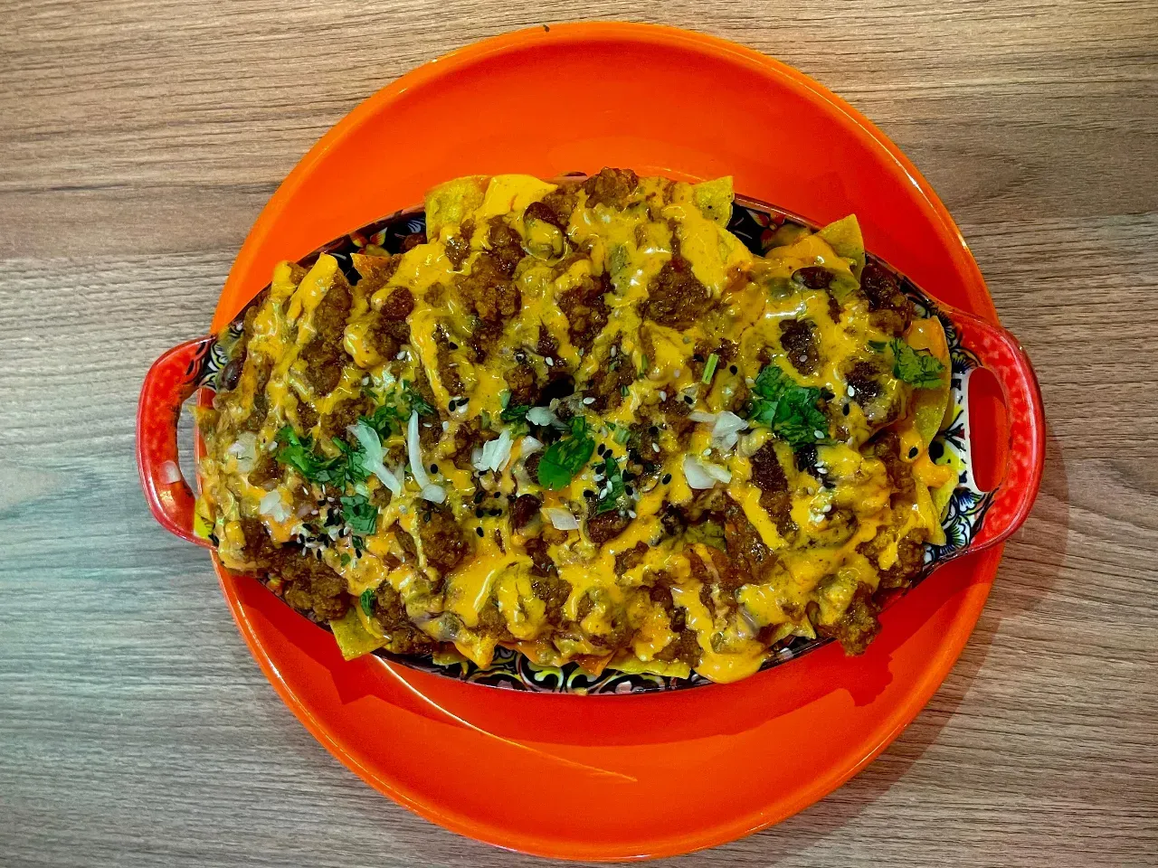 Nachos acompañados de queso cheddar, chili con carne, pico de gallo y guacamole. Ideal para compartir.