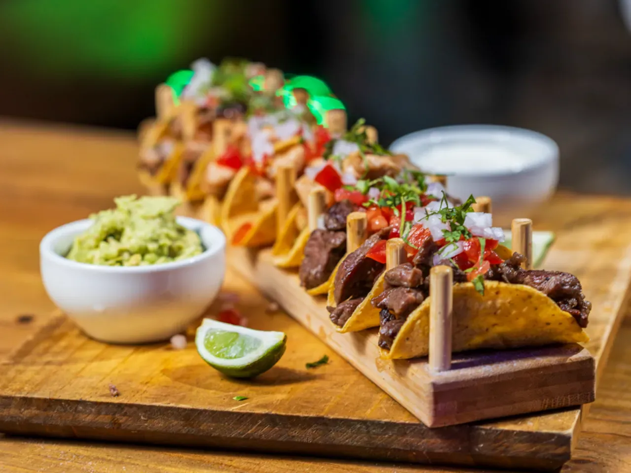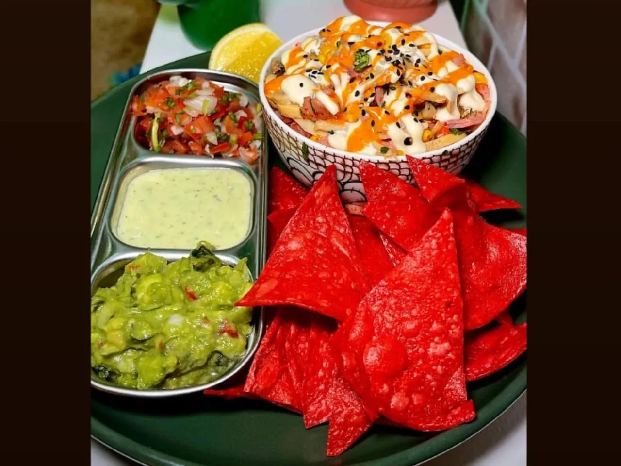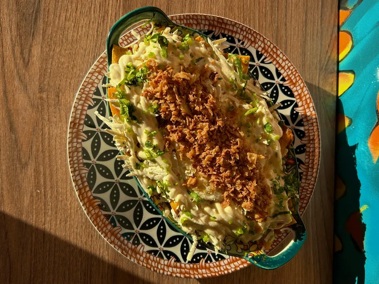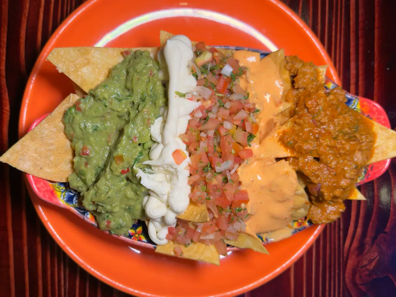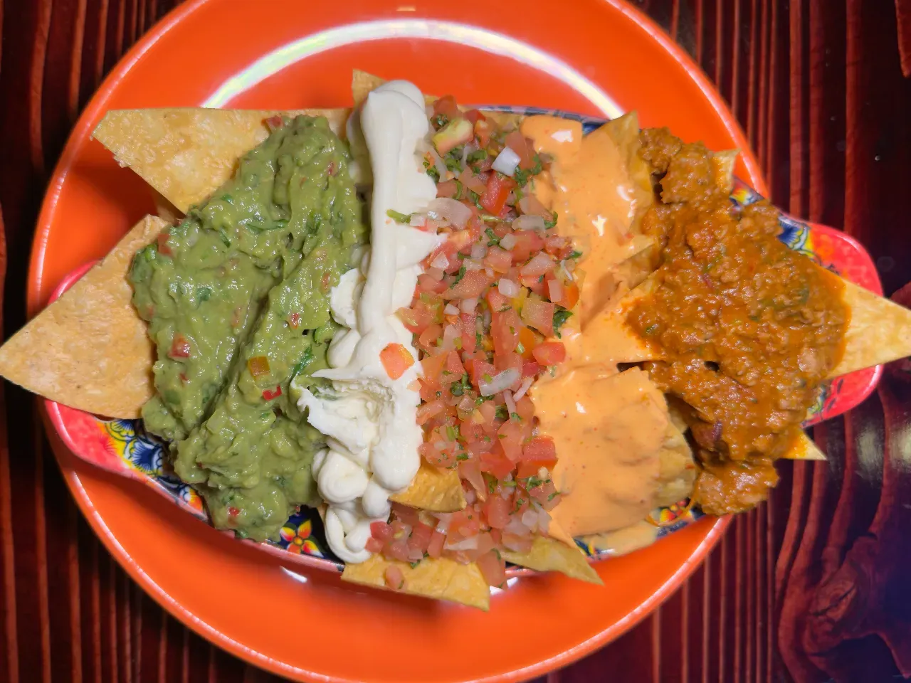 Nachos acompañados de queso cheddar, chili con carne, pico de gallo y guacamole. Ideal para compartir.