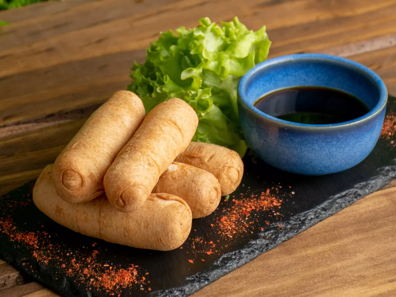 Vegetales frescos enrollados en papel de arroz, con salsa asiática y de maní