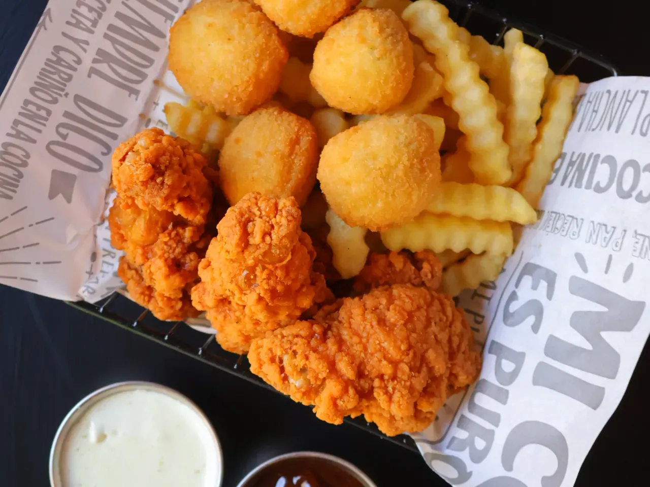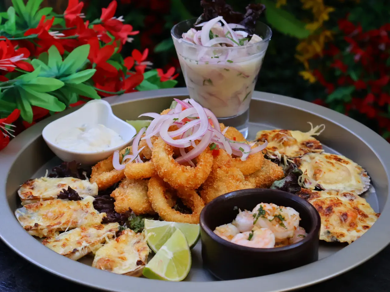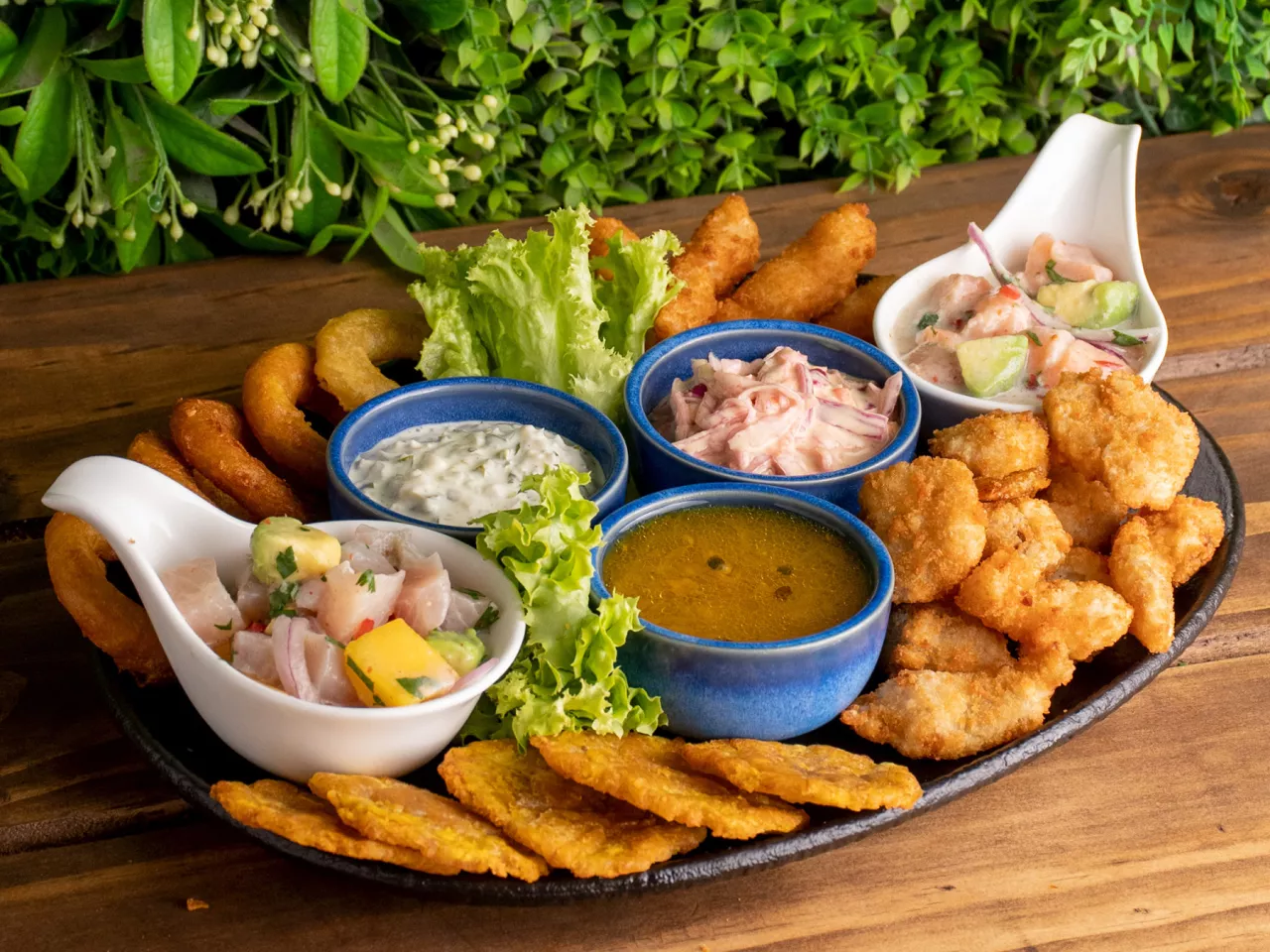 Pescado frito en cubos, medallones de tostones con coleslaw, mini ceviche de salmón, mini ceviche de pescado del día, anillos de calamar apanados y camarones ecuatorianos apanados. Salsas: vinagreta de maracuyá y tártara.