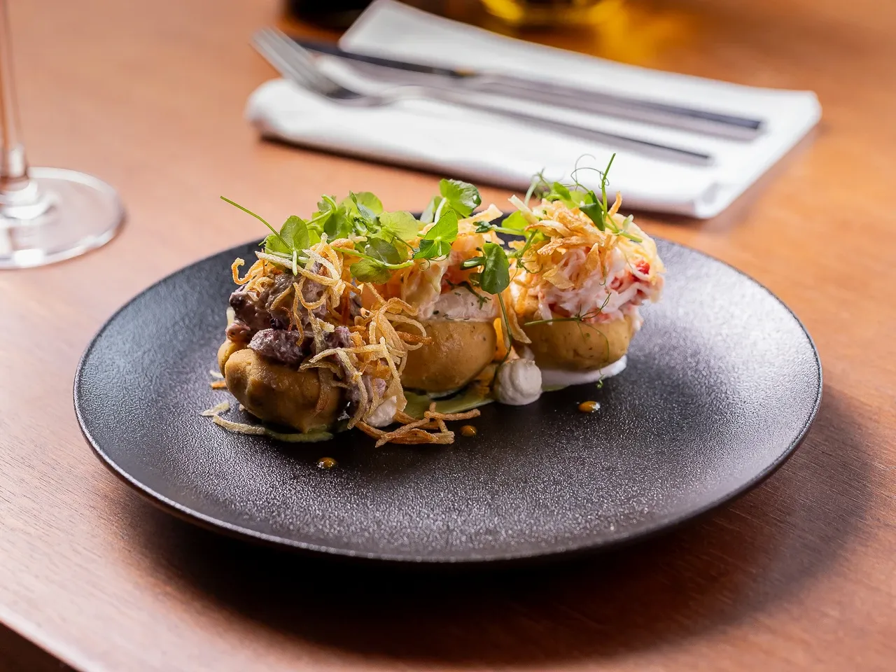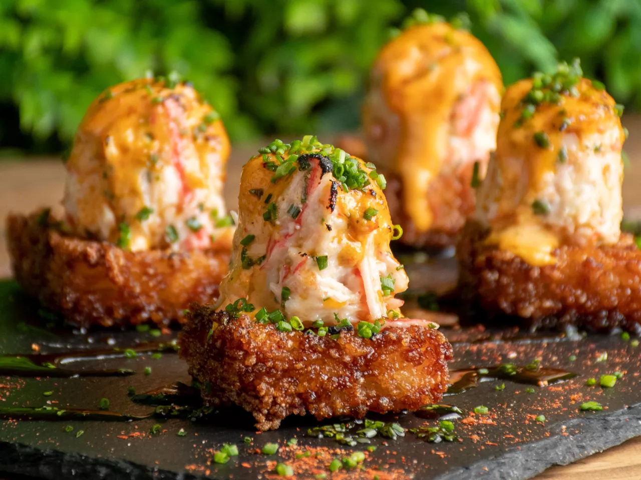 Relleno de langostino crocante y palta con topping de jaiba acevichada y aceite de cilantro.