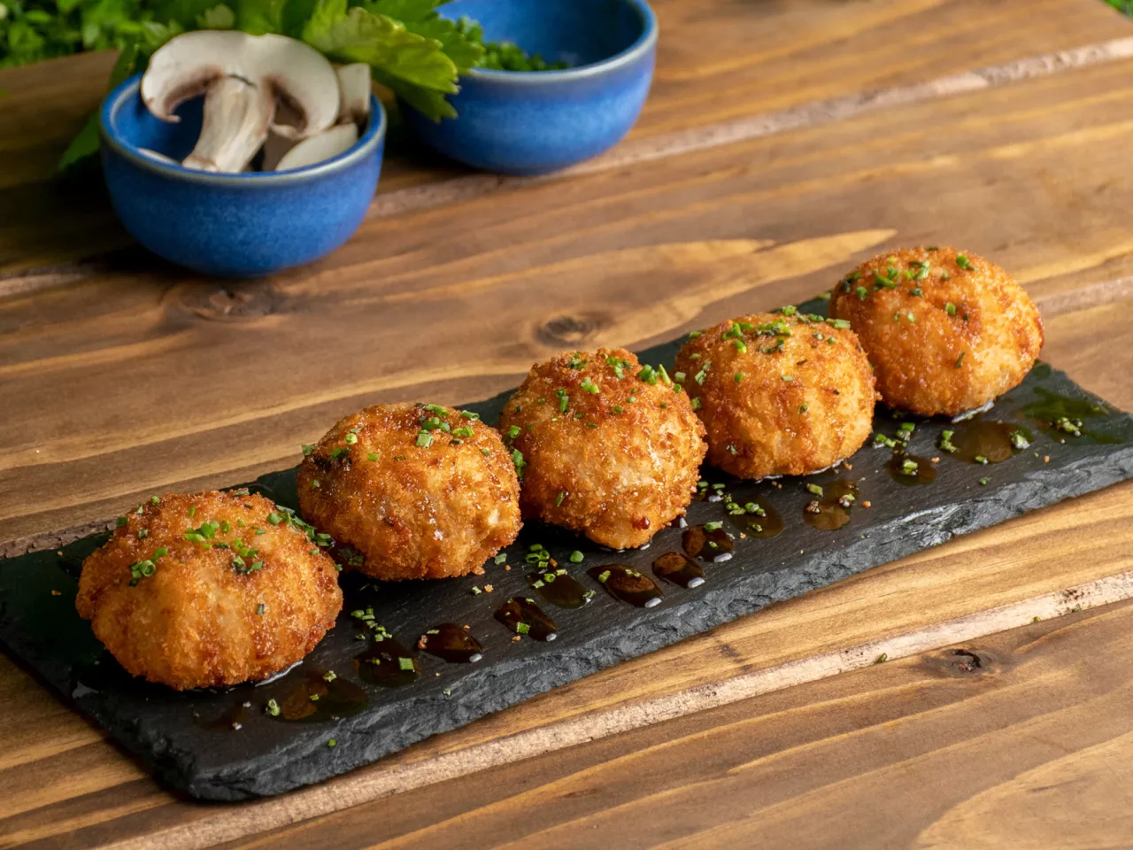 8 bolas de Champiñón apanadas en Panko acompañada de una porción de papas fritas junto a dos dips de la casa.