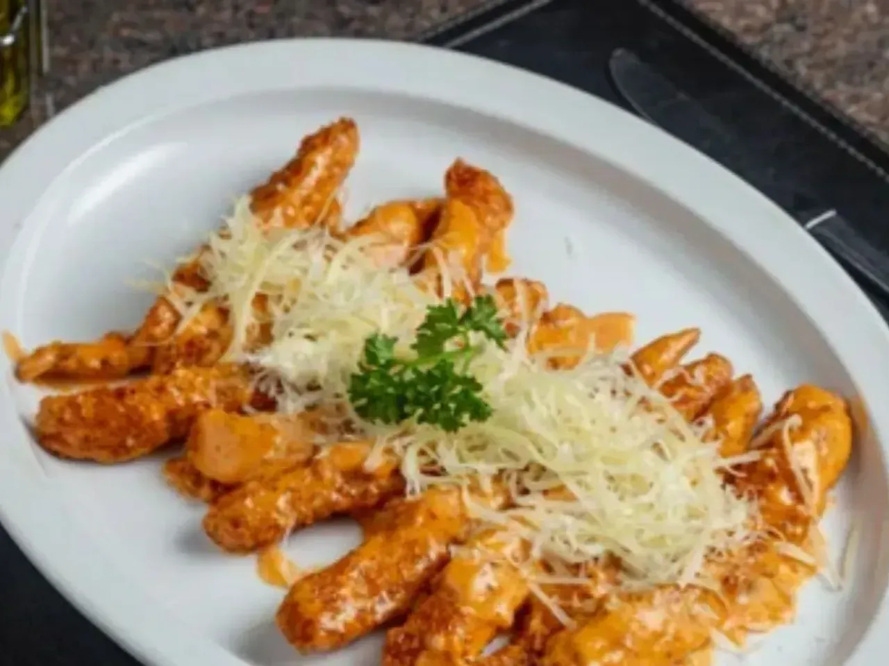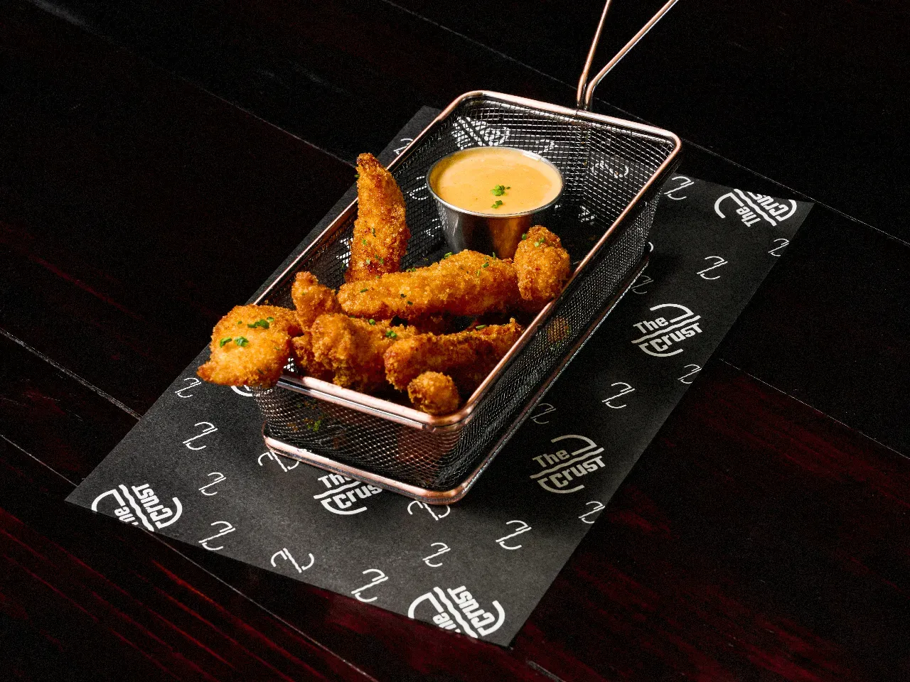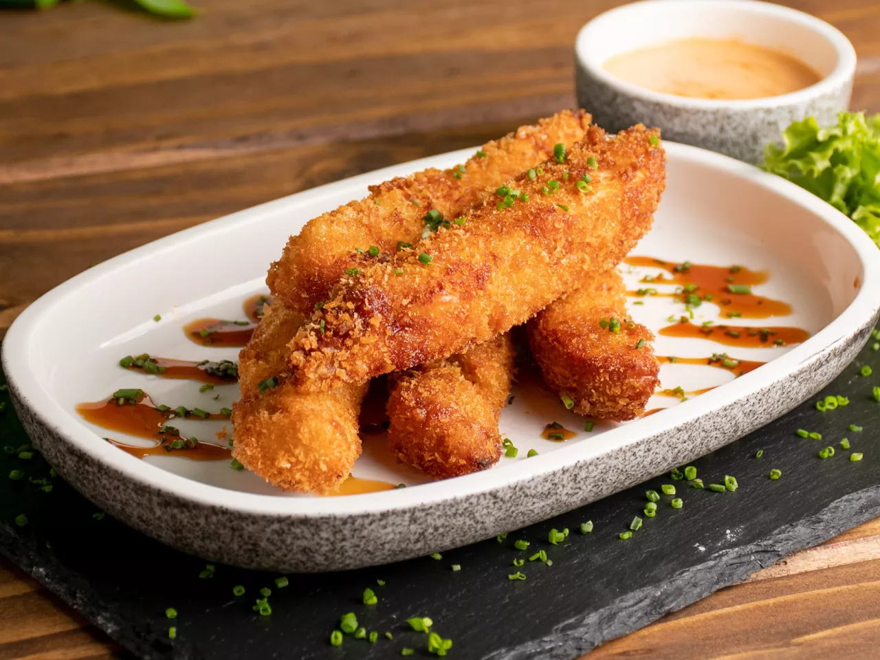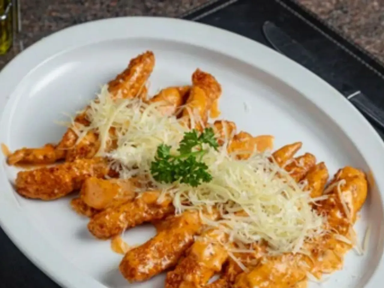 Sabrosas y crujientes tiritas de pollo apanadas cubiertas por nuestra salsa parmesana.