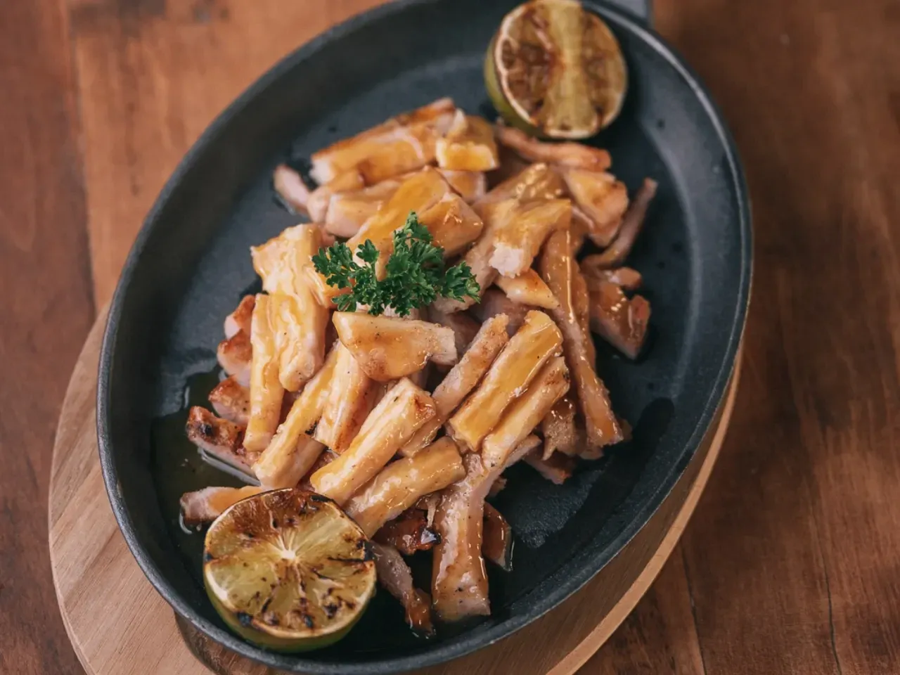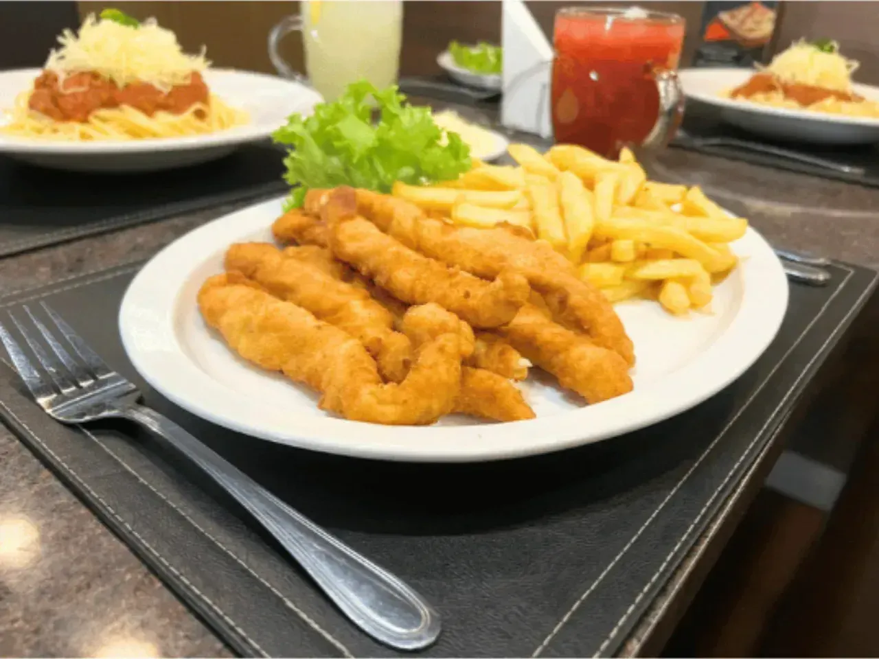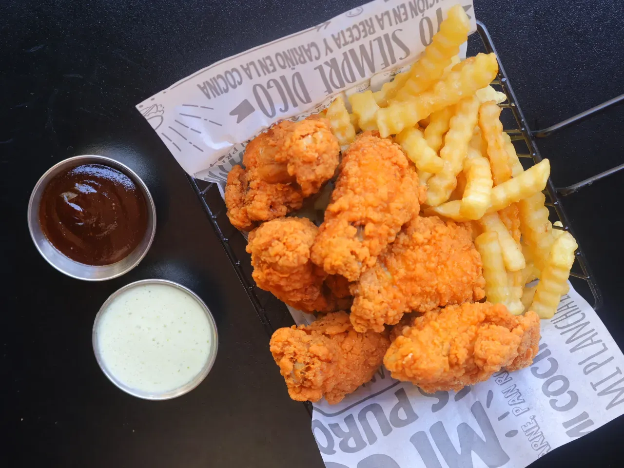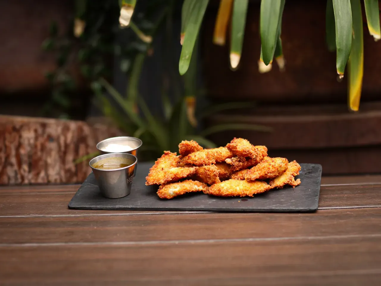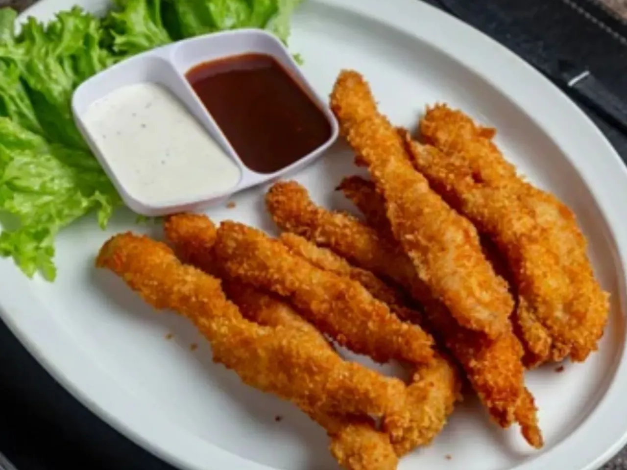 Sabrosas y crujientes tiritas de pollo apanadas cubiertas por nuestra salsa parmesana.