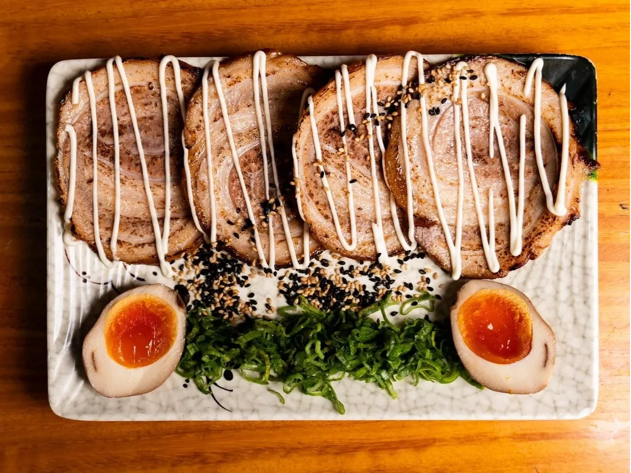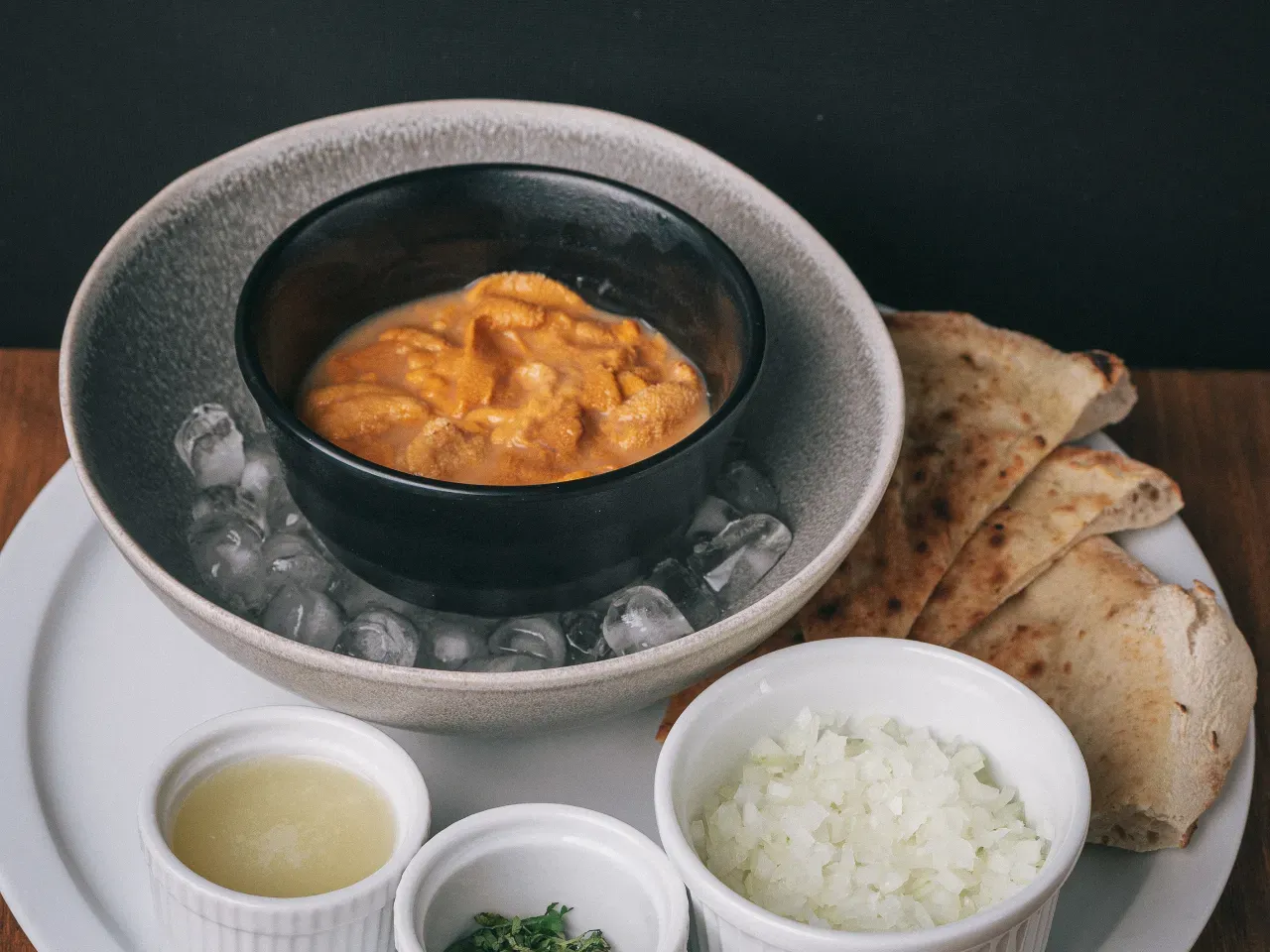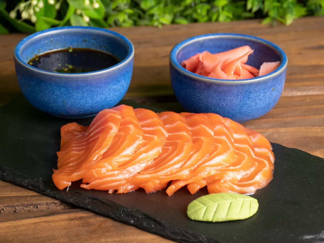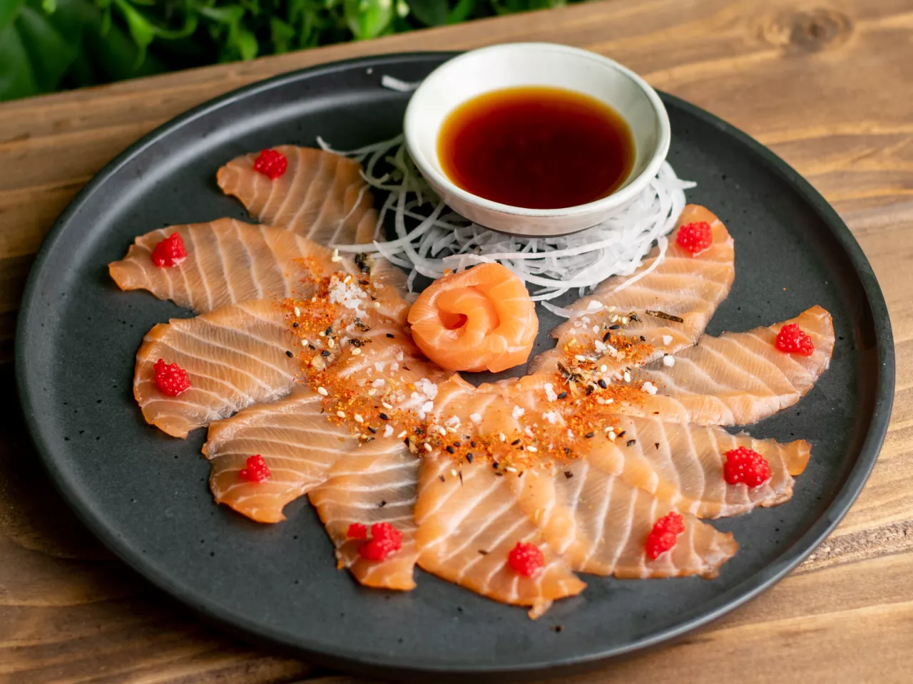 Láminas de salmón fresco, coronados con sal de cahuíl, shichimi, furikake y masago, acompañados de salsa ponzu.