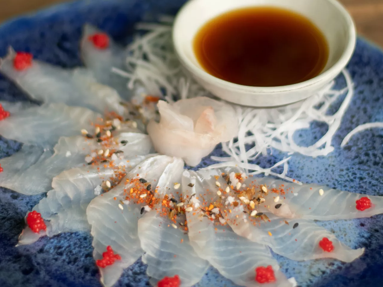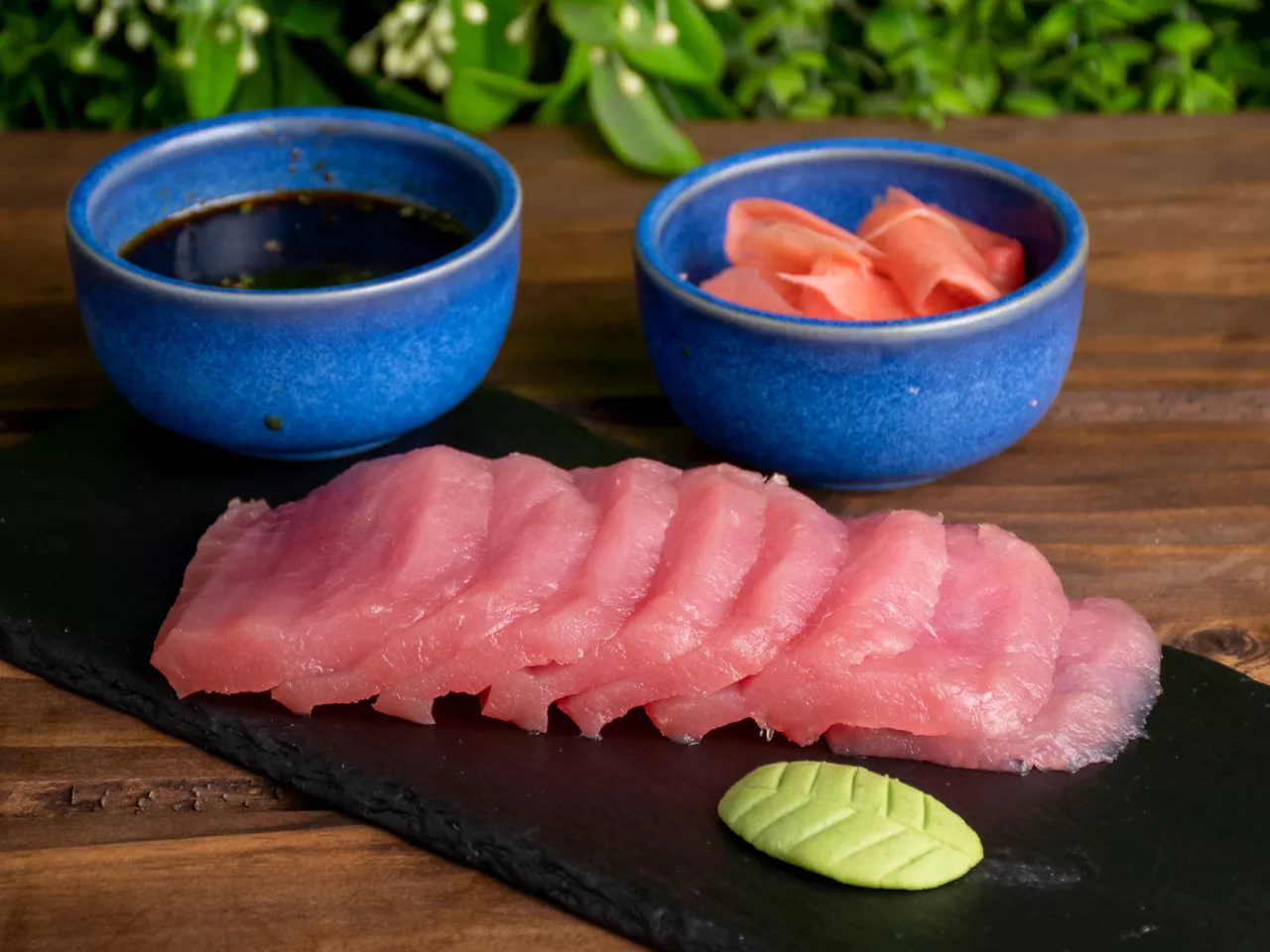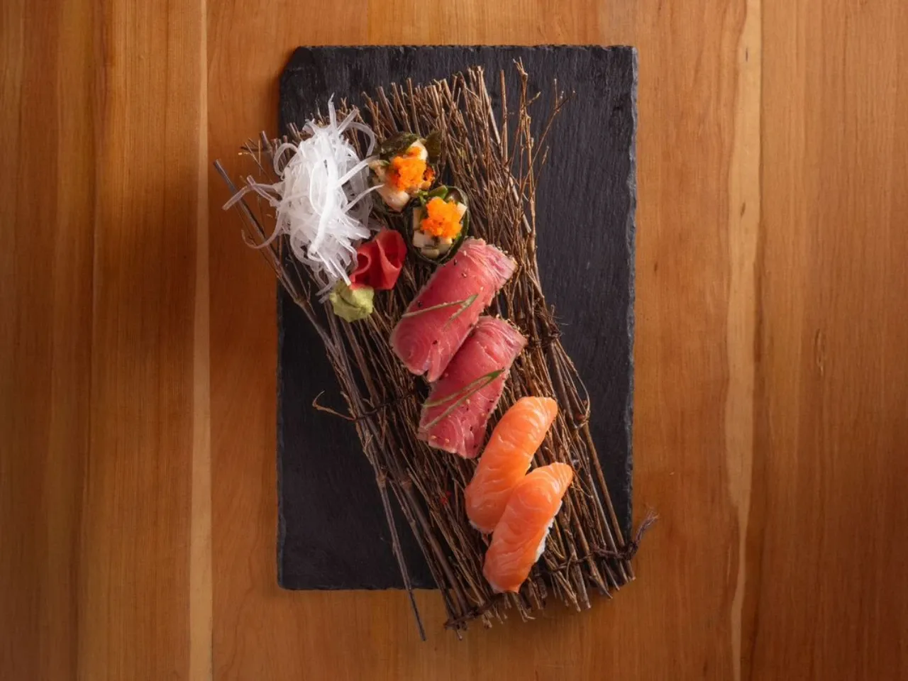 Láminas frescas de pesca del día, coronadas con sal de cahuíl, shichimi, furikake y masago, acompañados de salsa ponzu.