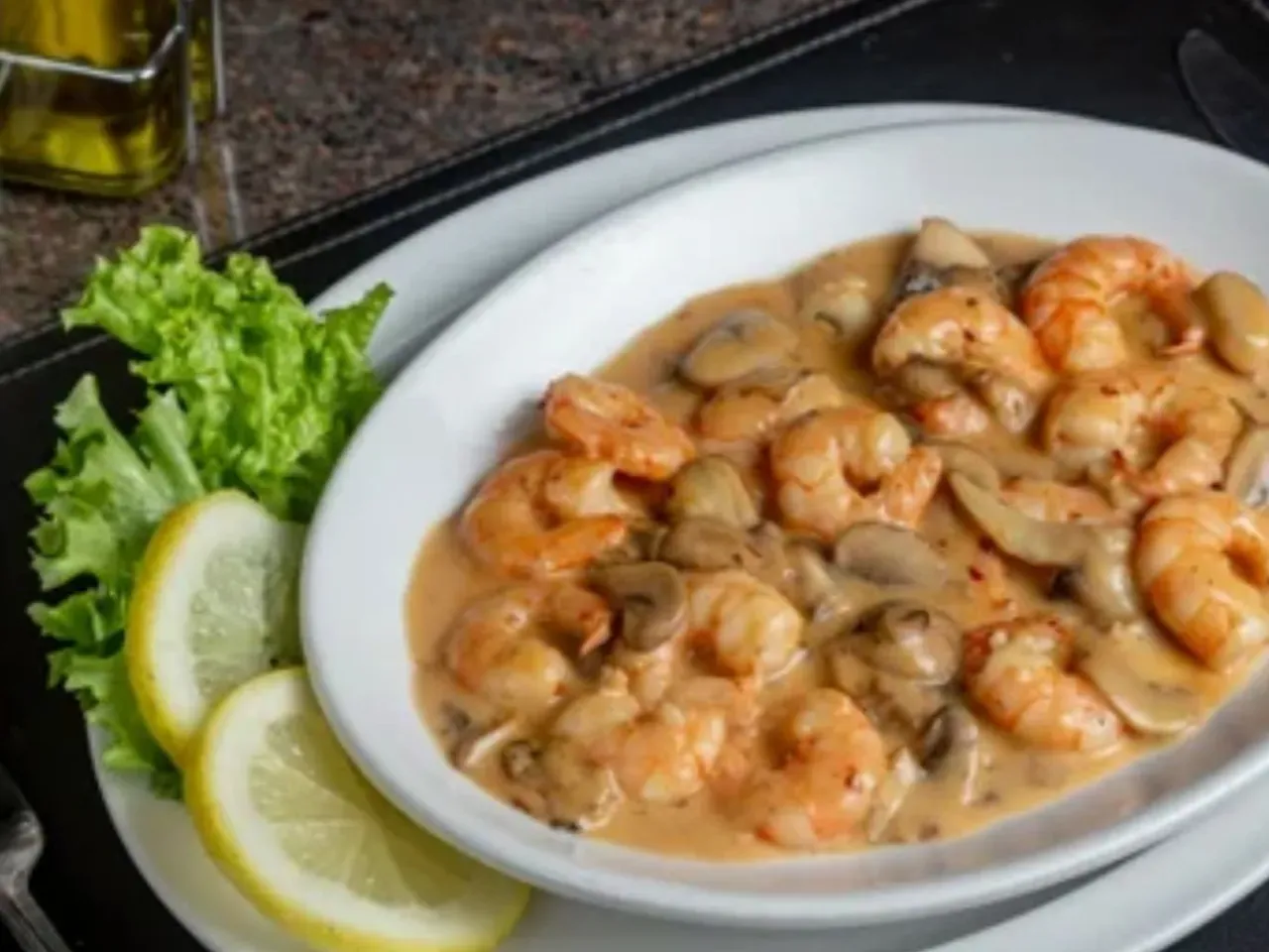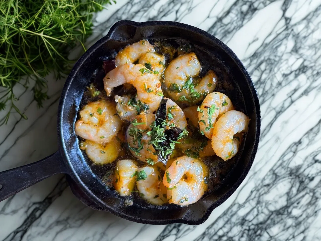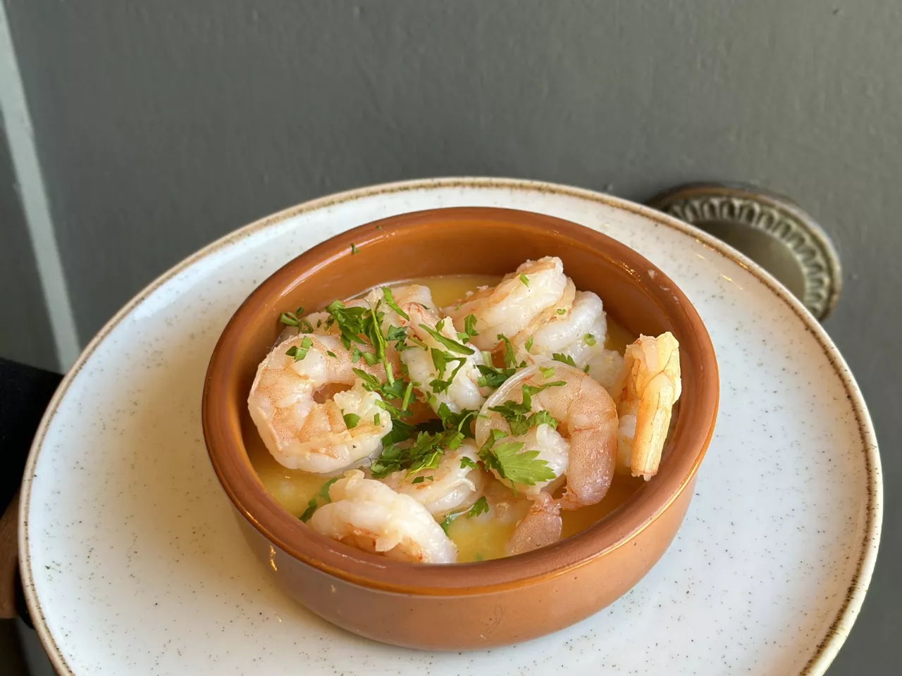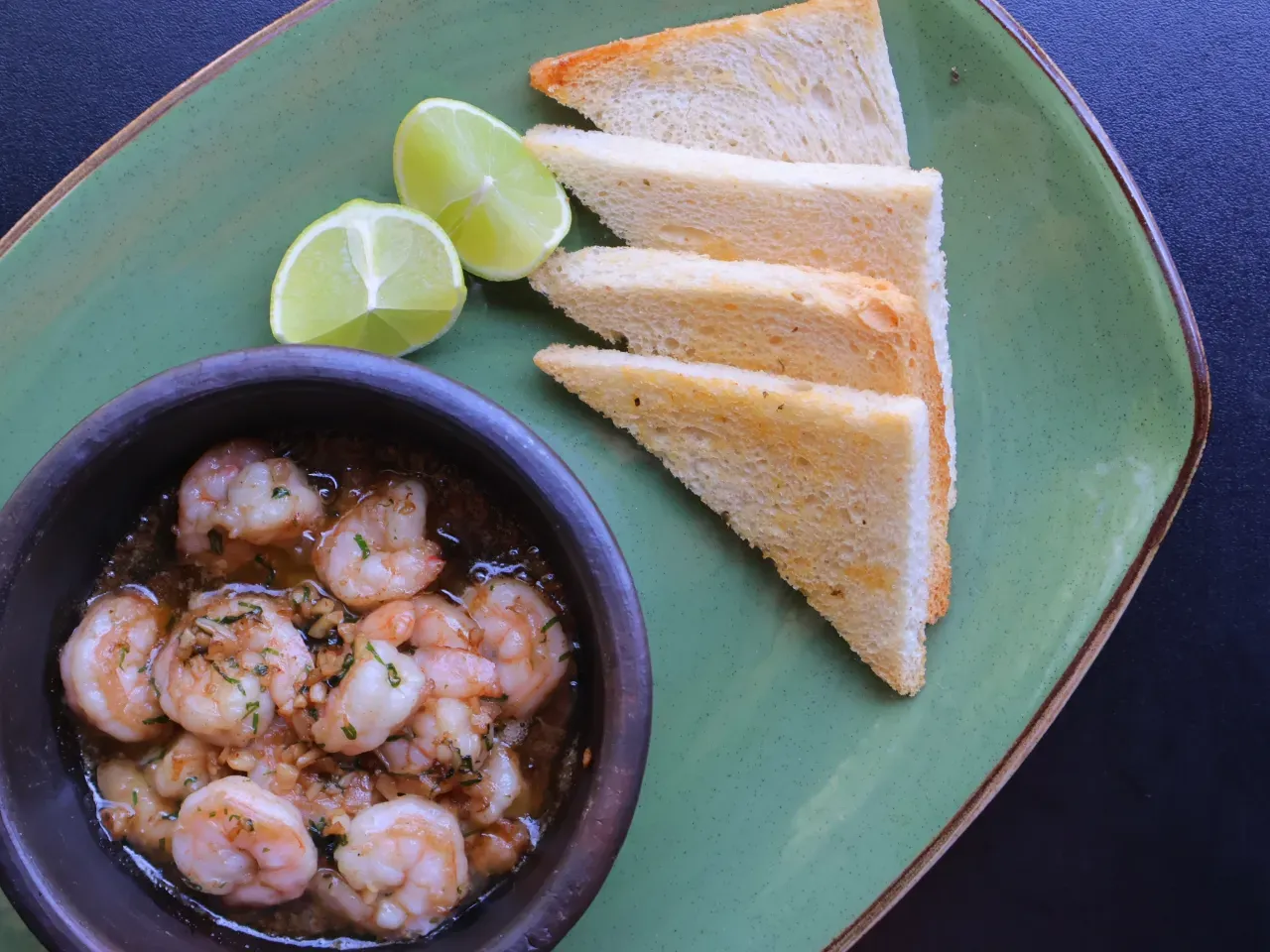 camaron ecuatoriano salteado en oliva, vino blanco mantequilla y terminado con merquen y cilantro