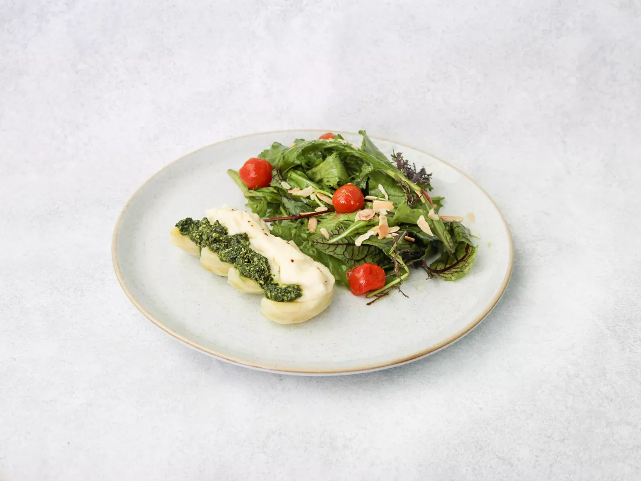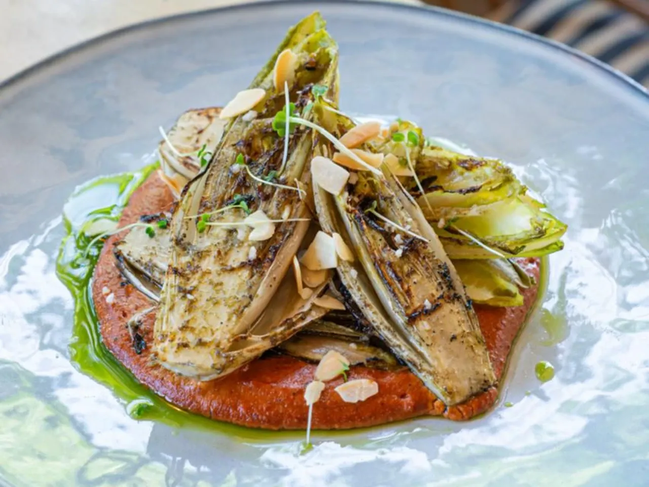 Fondos de alcachofa confitada con queso de cabra y pesto de albahaca acompañado de mix de hojas verdes.