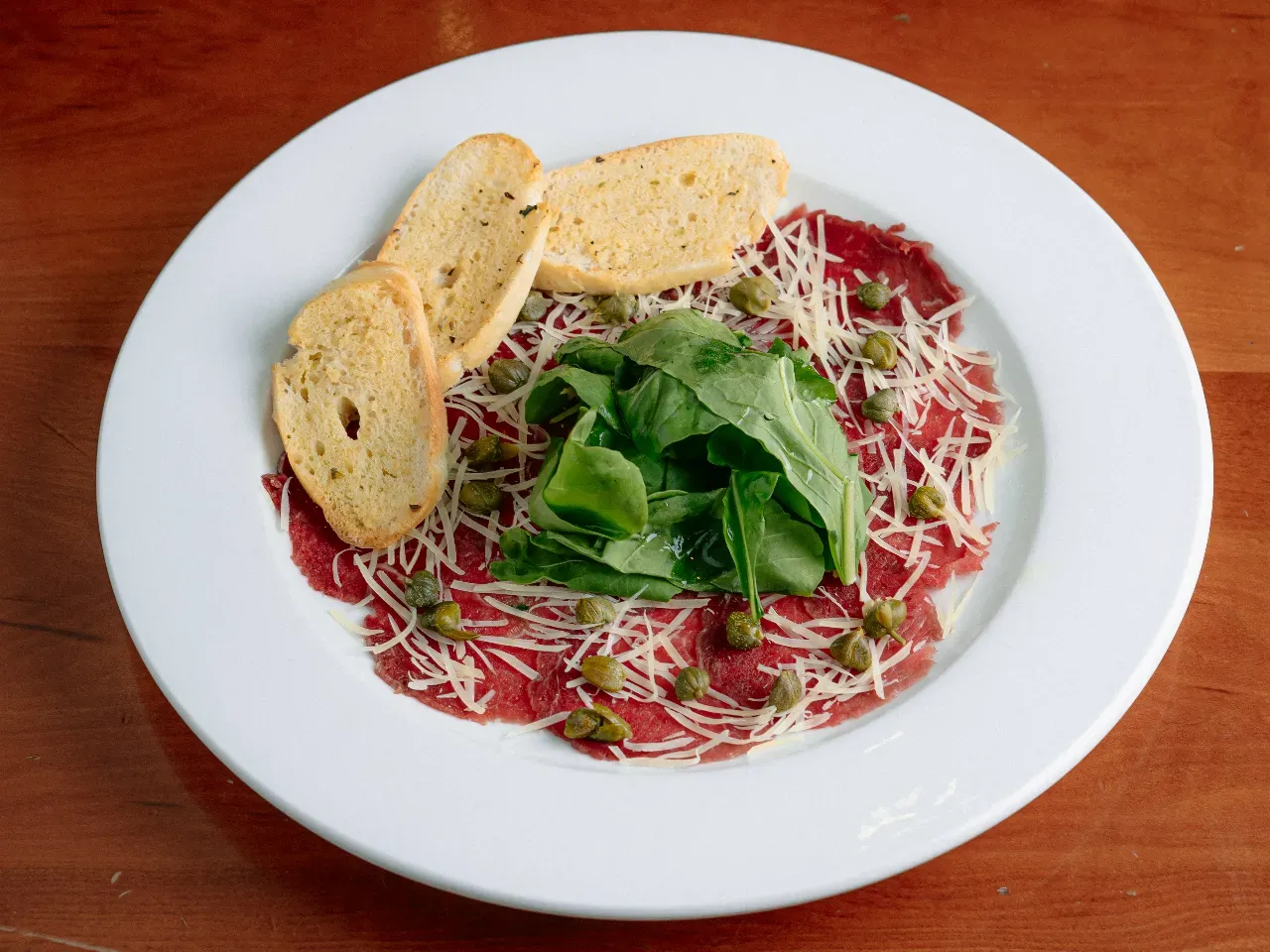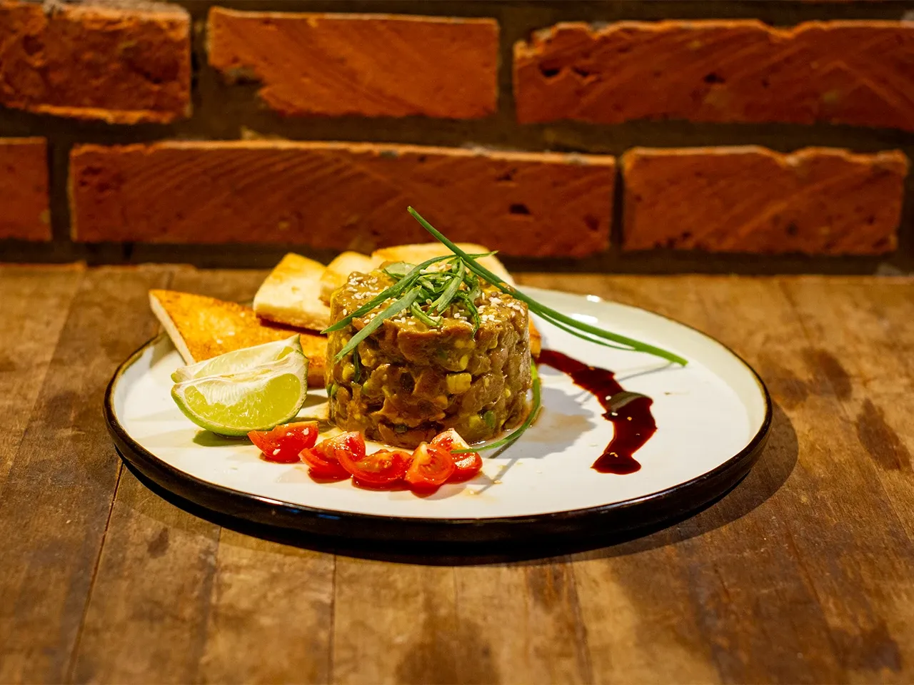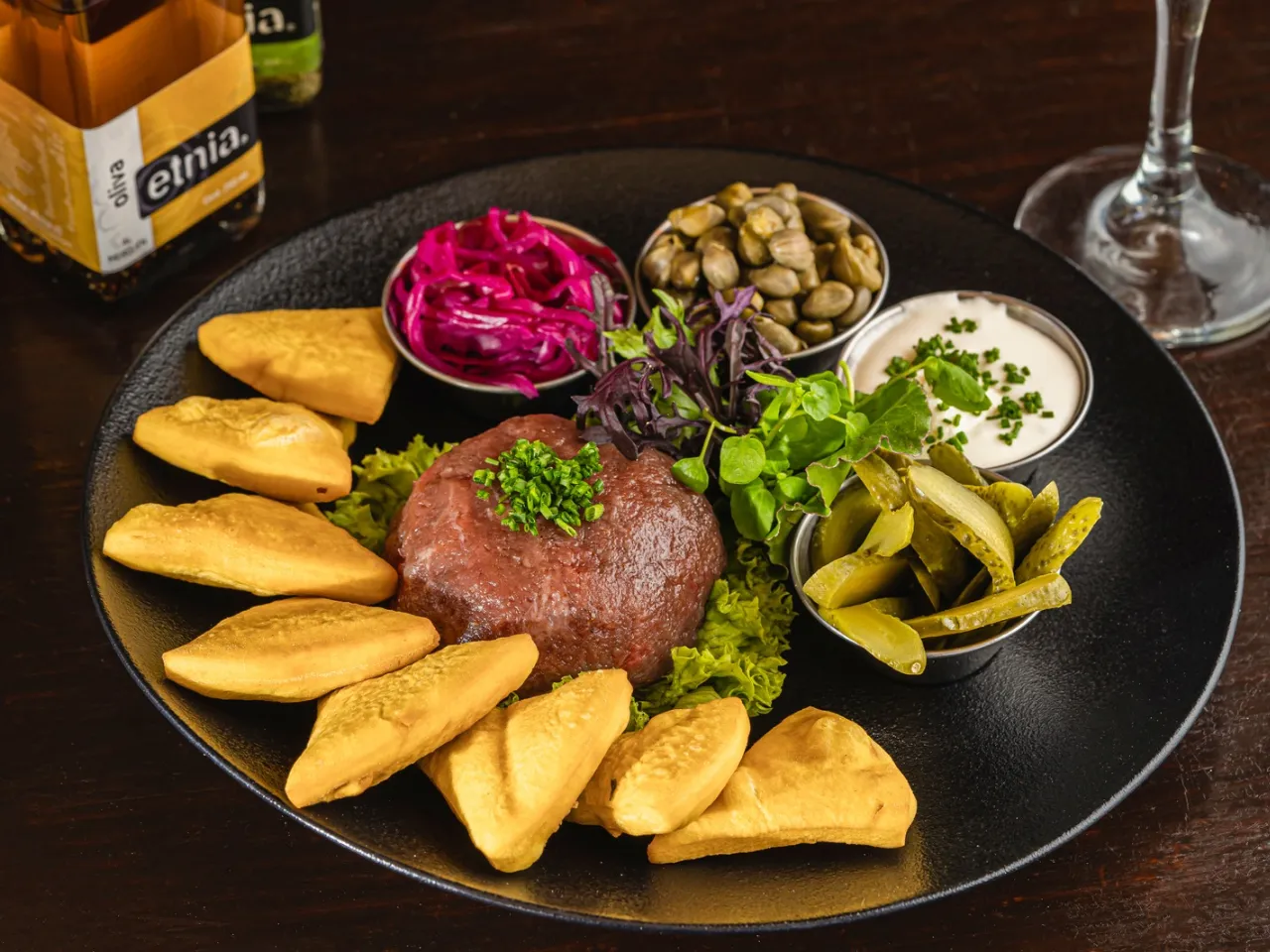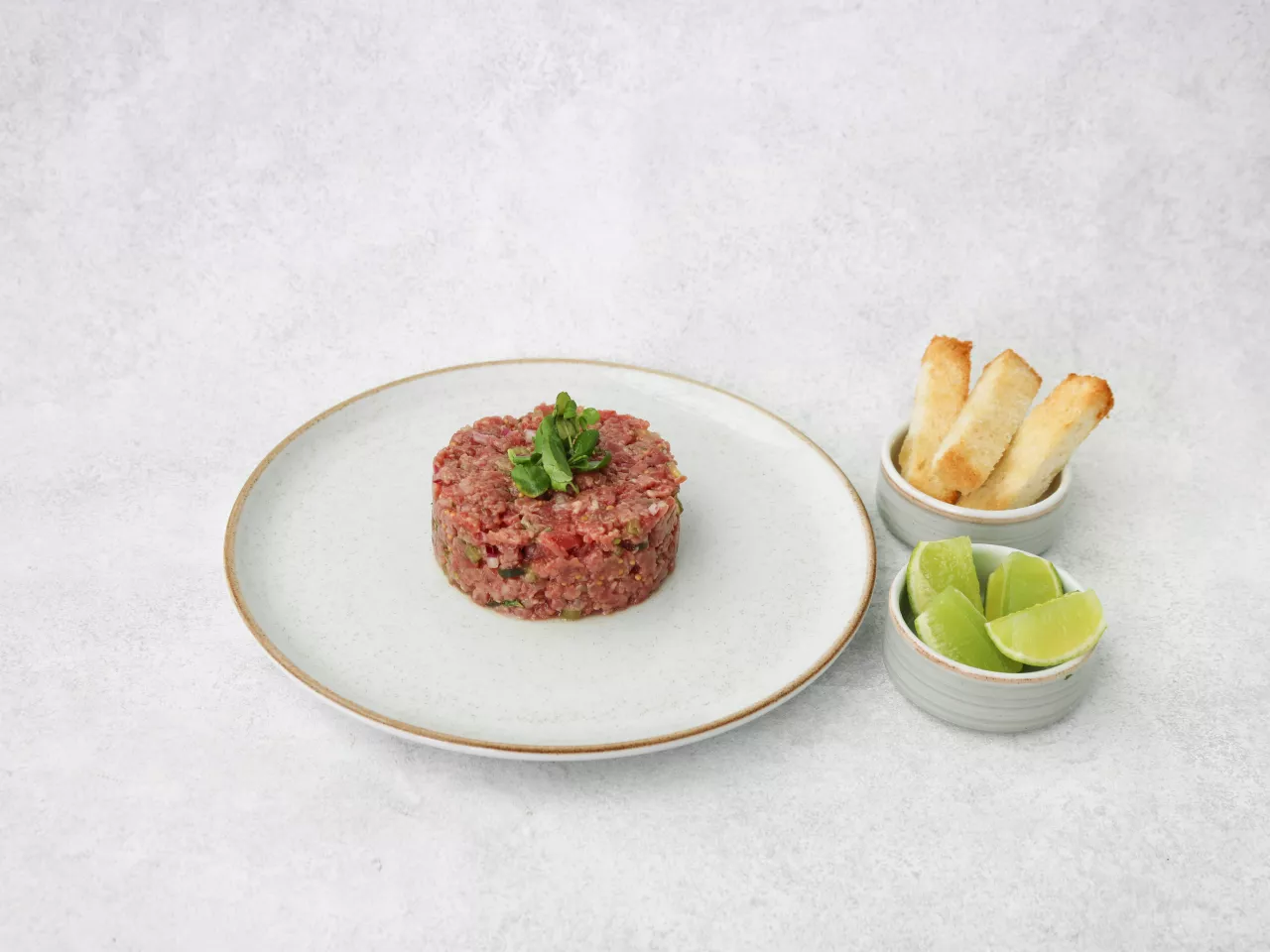 220 grs. de carne de res, acompañada de cebolla morada, mostaza dijon, alcaparras, pepinillos y tostadas