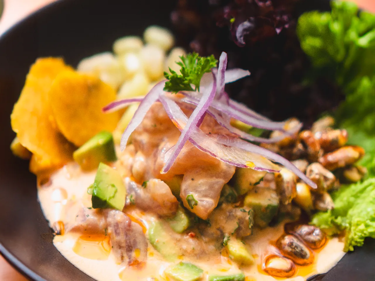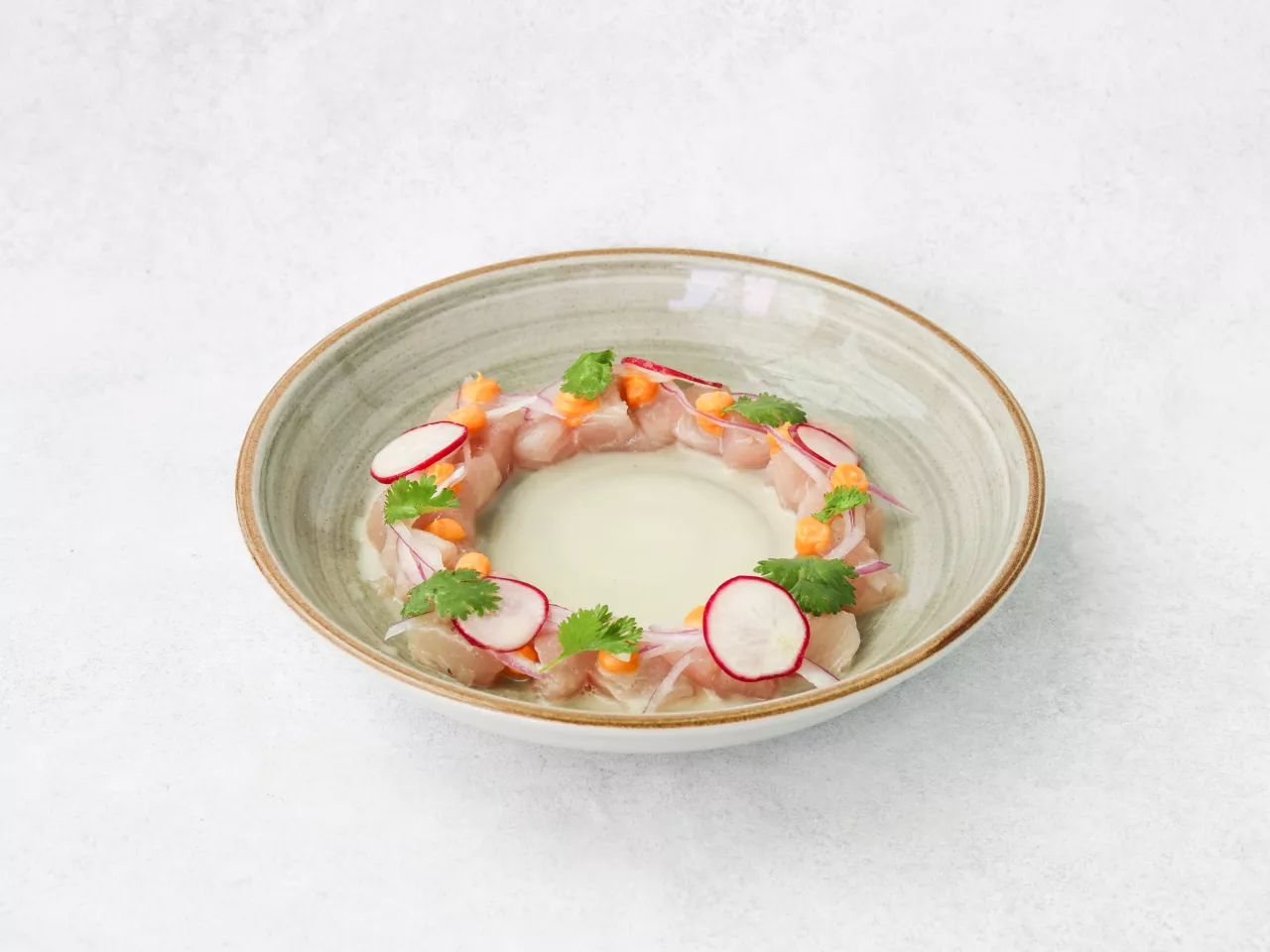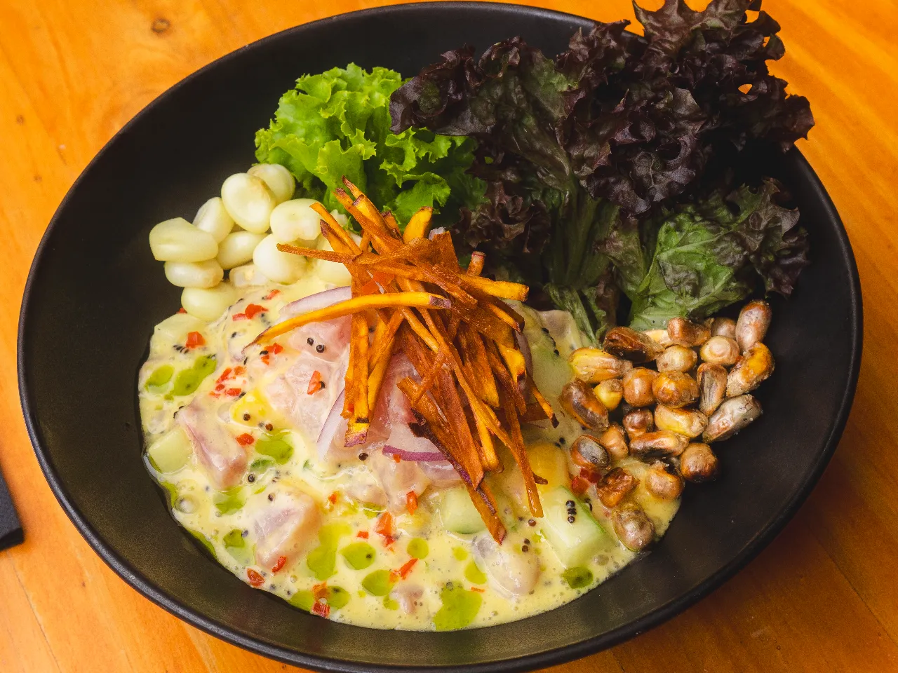 Finas laminas de pescado fresco del día, bañadas en una cremosa salsa de ají amarillo con toques cítricos, acompañado de trozos de palta fresca y tomate cherry