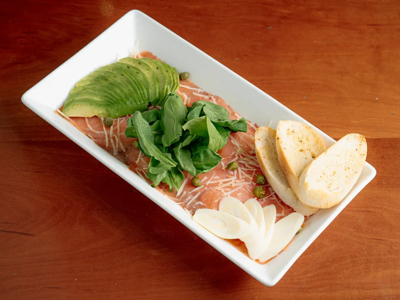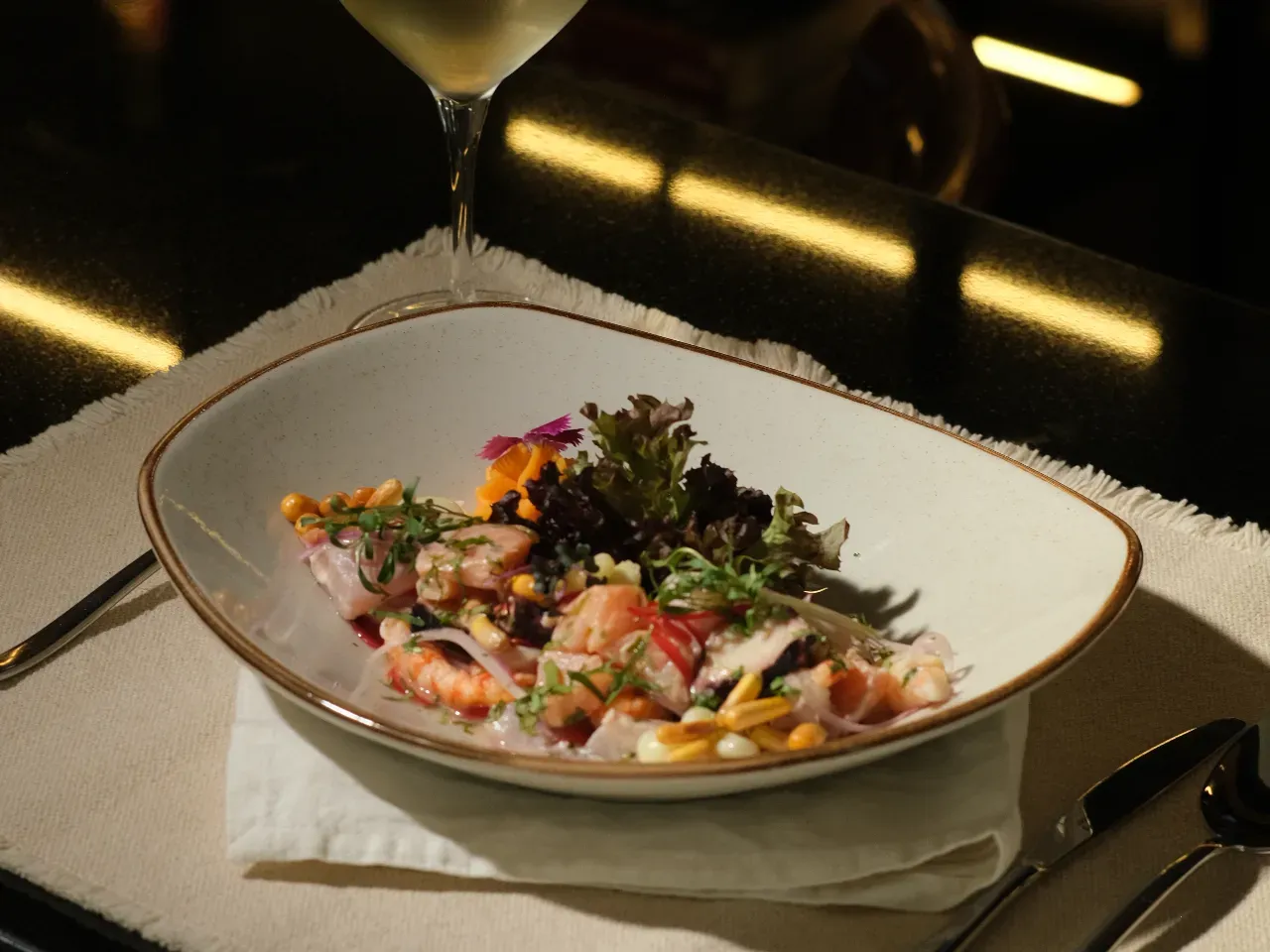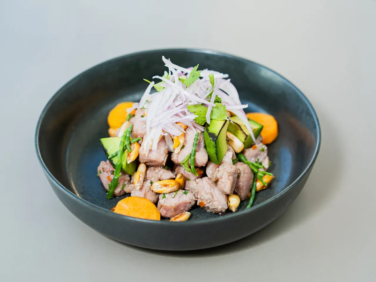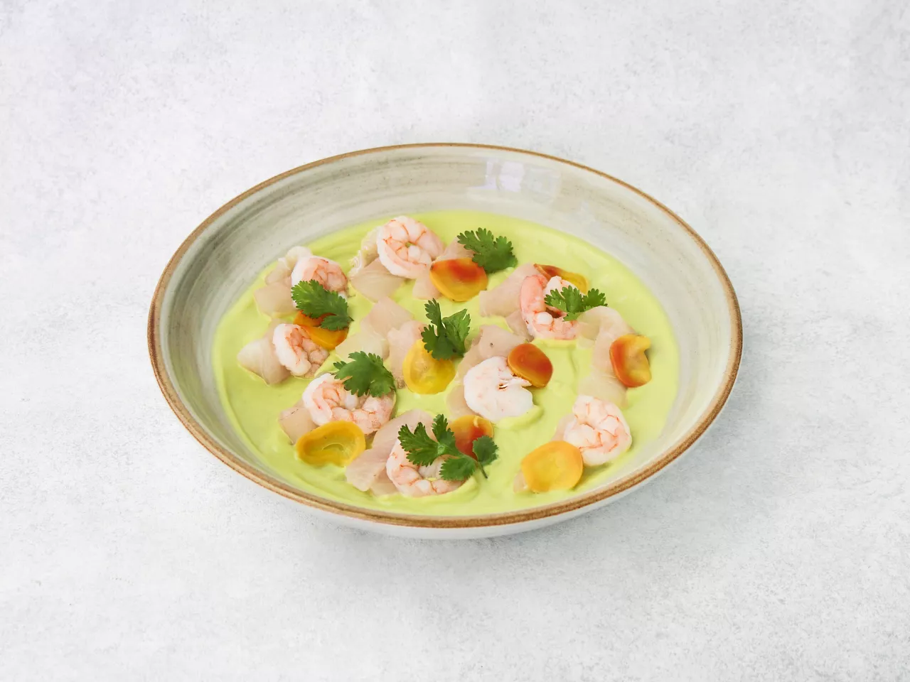 Finas laminas de pescado fresco del día, bañadas en una cremosa salsa de ají amarillo con toques cítricos, acompañado de trozos de palta fresca y tomate cherry