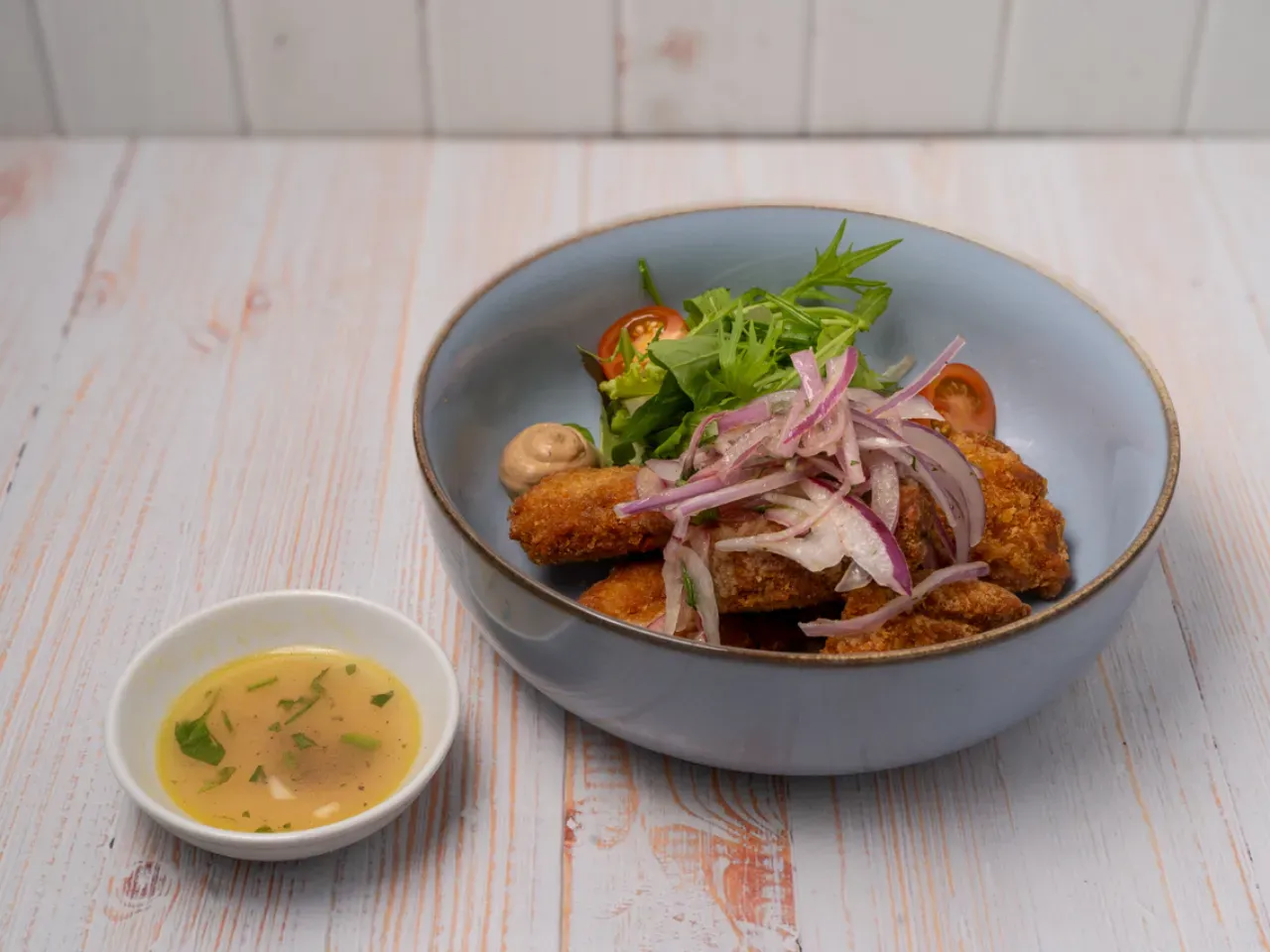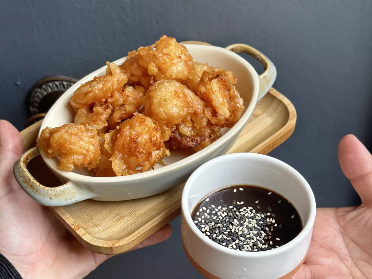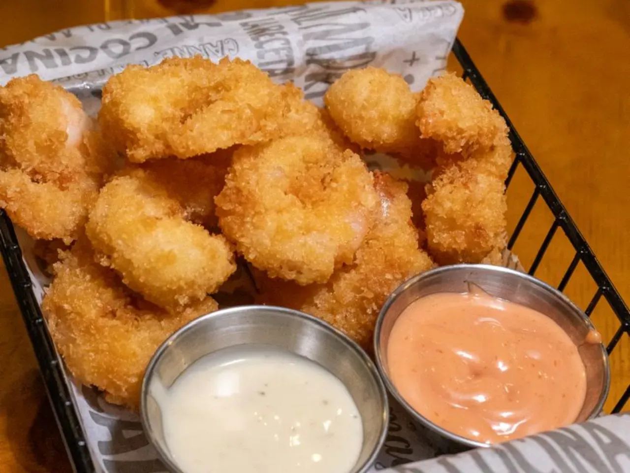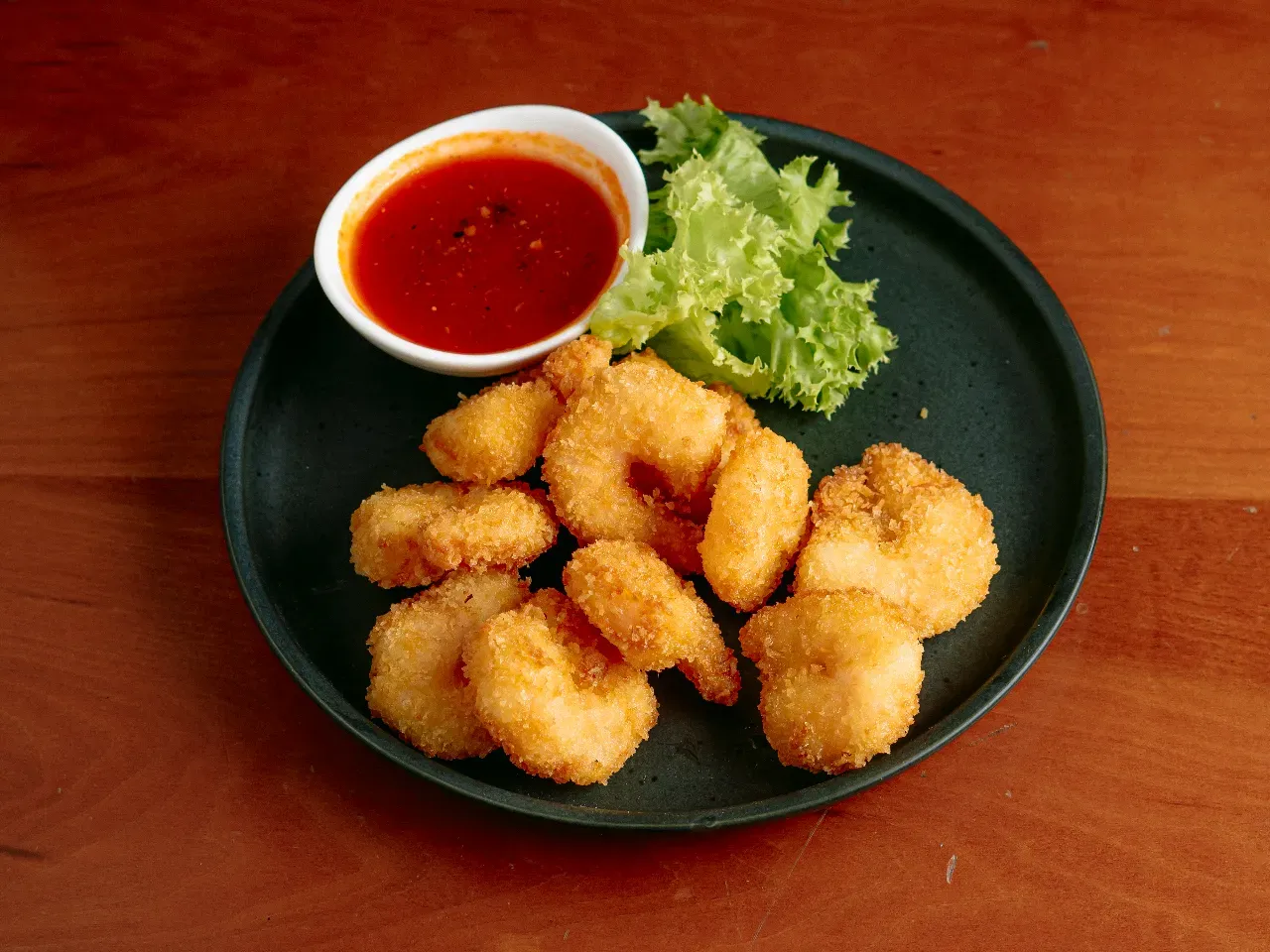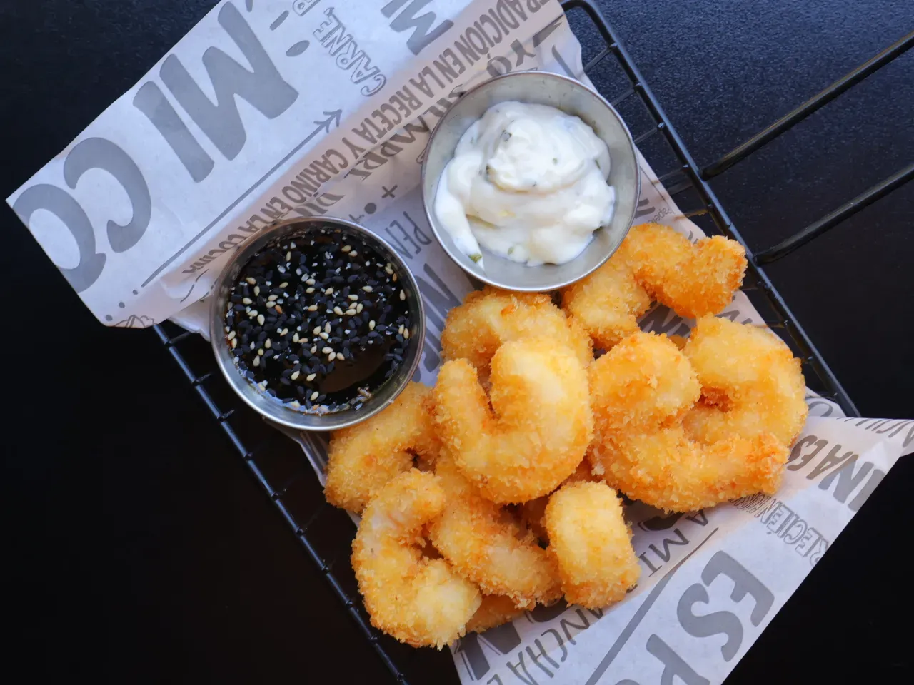 Camarones ecuatorianos empanizados en panko, crocantes por fuera y jugosos por dentro. Acompañados de una salsa agridulce casera y una salsa de soya.