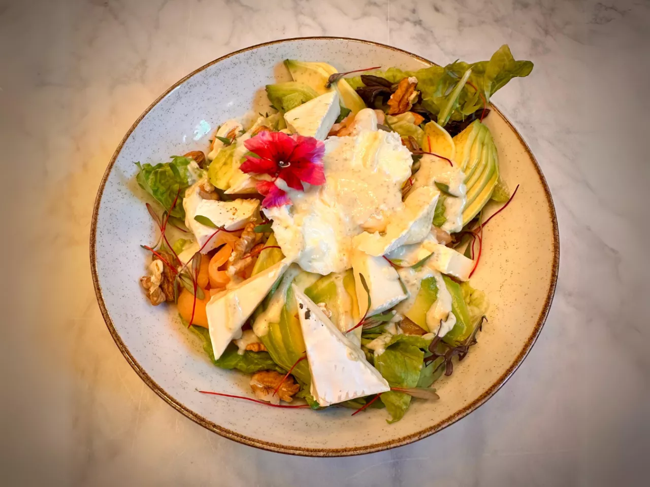 Camembert frito sobre mix de hojas verdes, brotes de mostaza, castañas de cajú, naranja, manzana y vinagreta de miel con mostaza