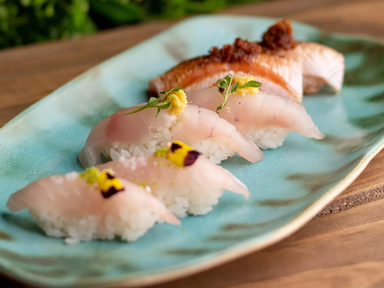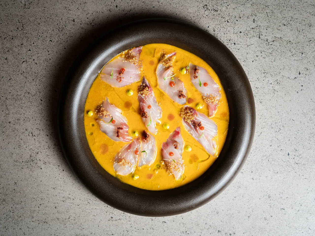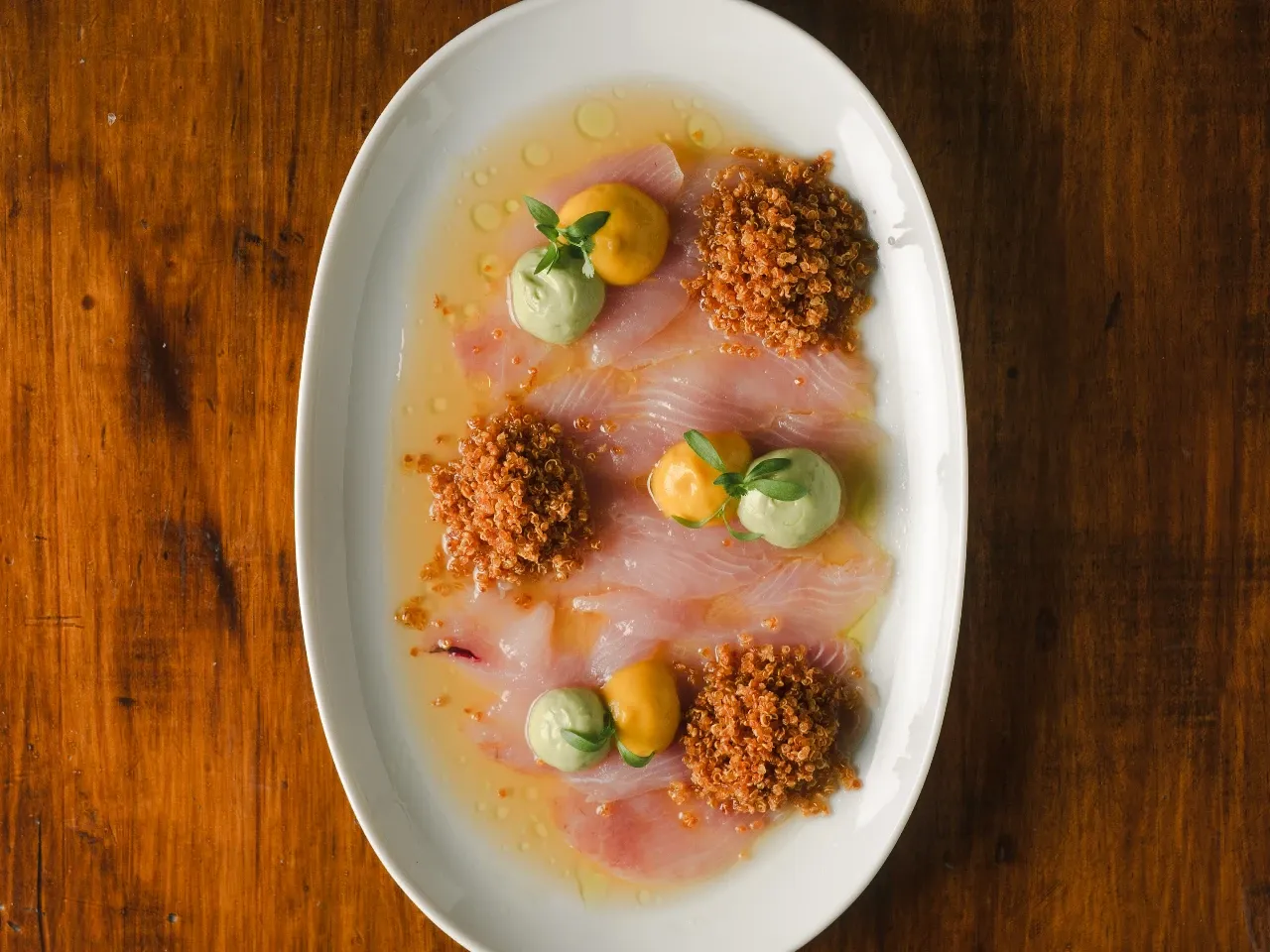 Finas láminas con crema ácida de leche de tigre y salsa de maracuyá, crocantes de quinua y masago.