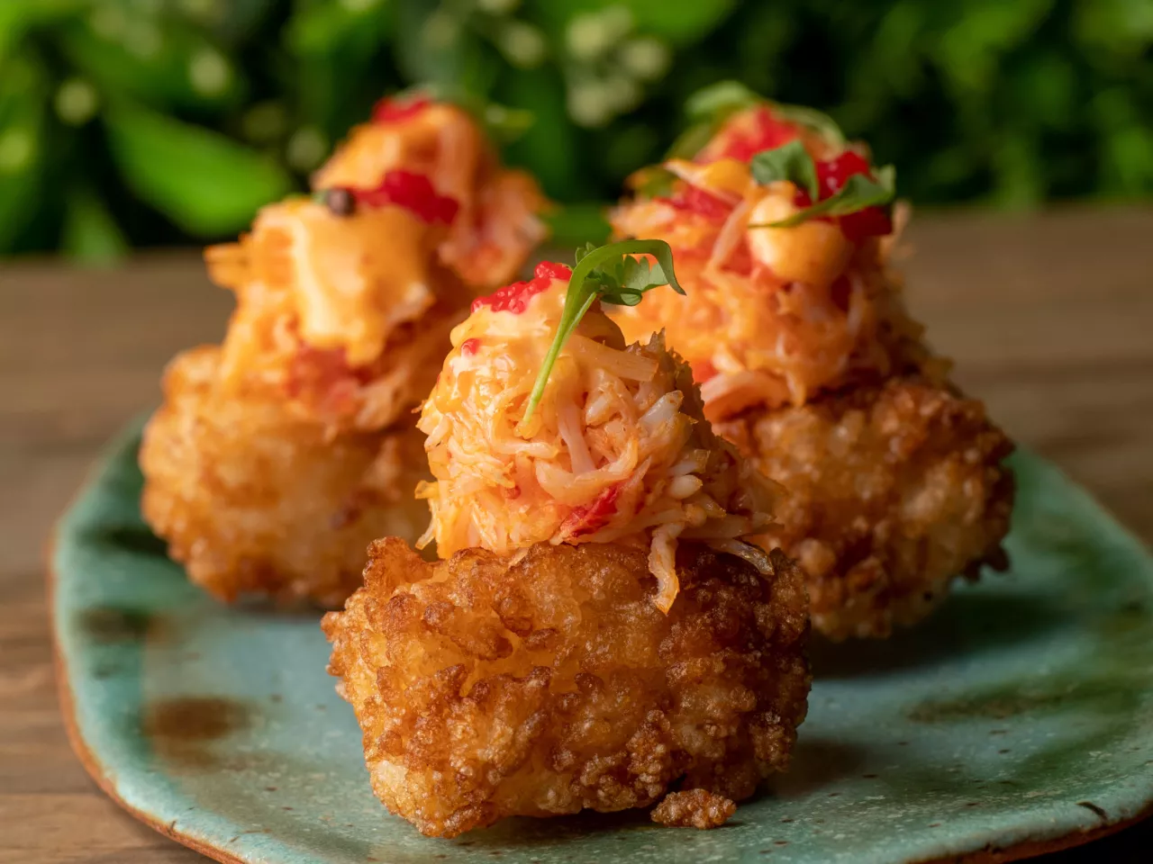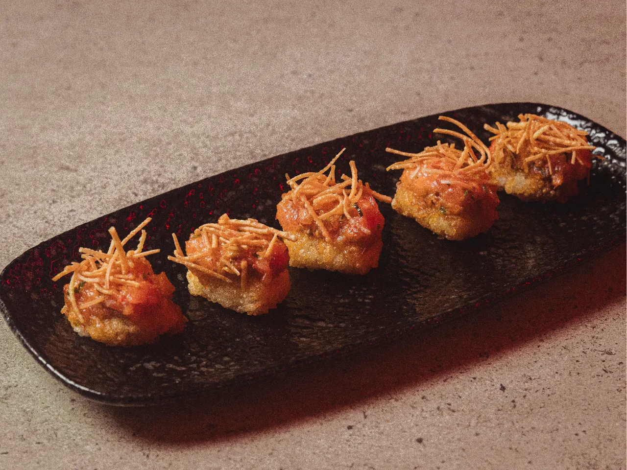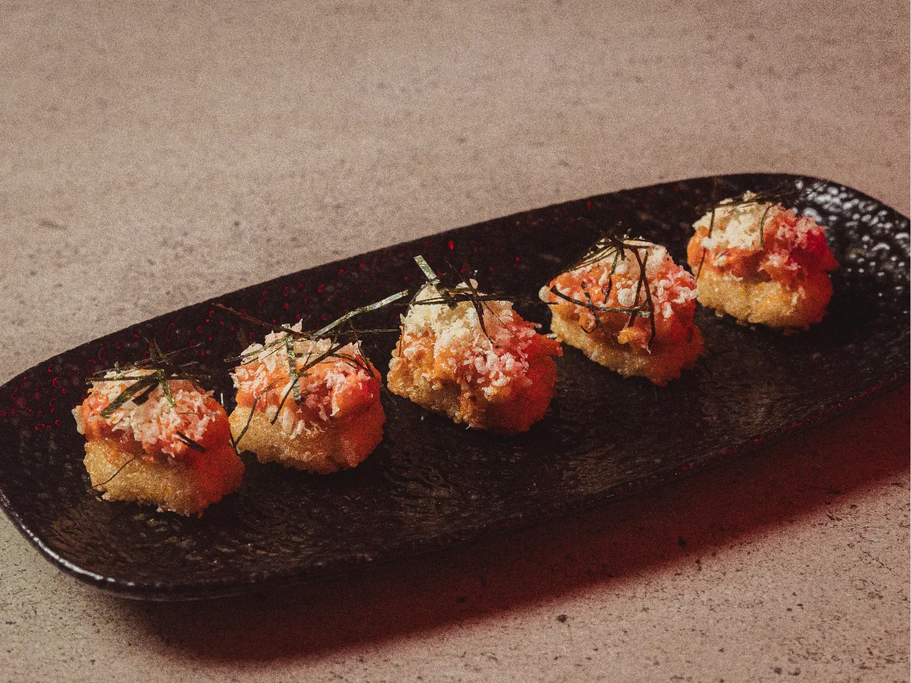 Croqueta rellena de camarón, con top de mayo spicy, furikake y katsuobushi (5u)