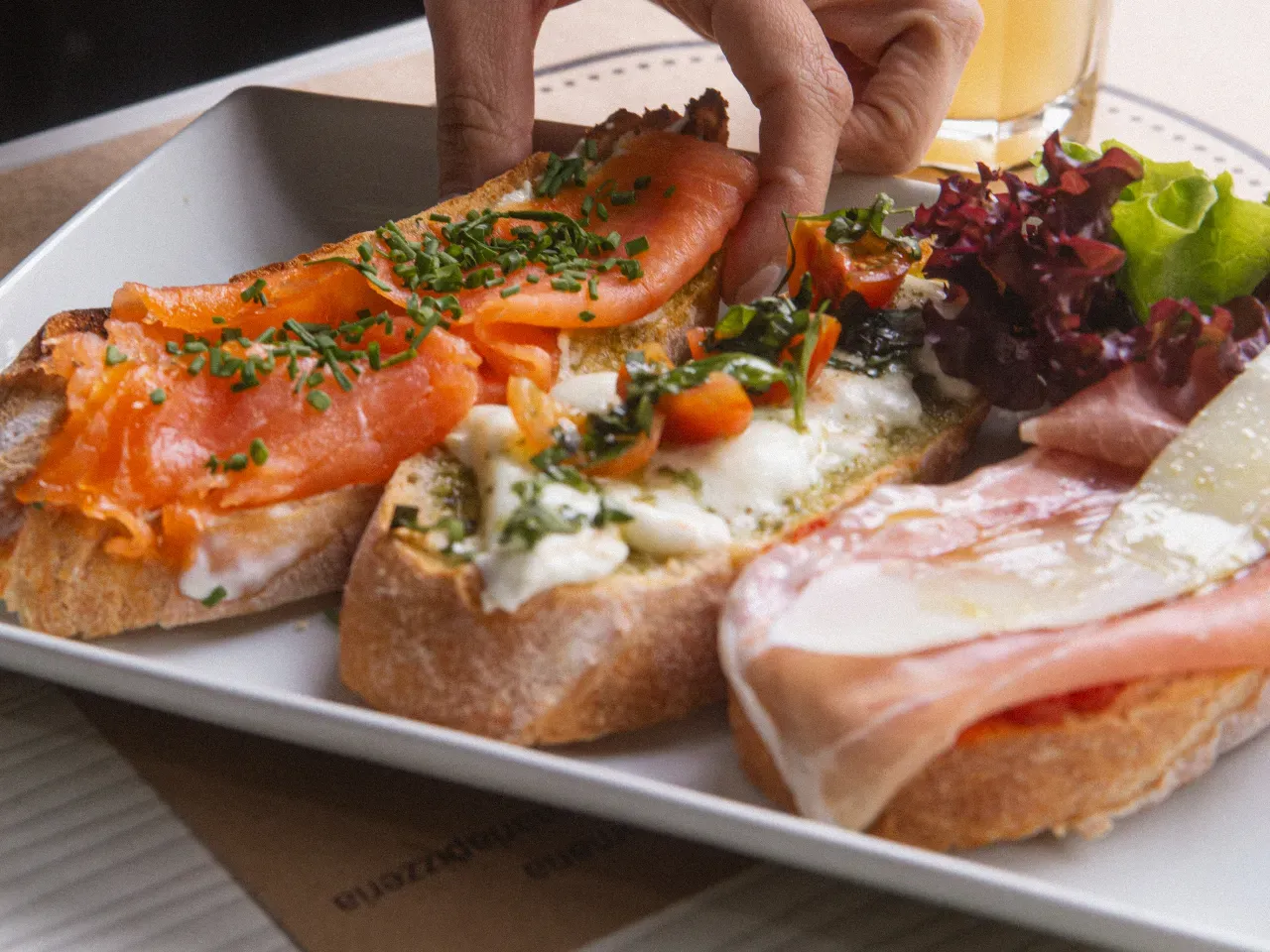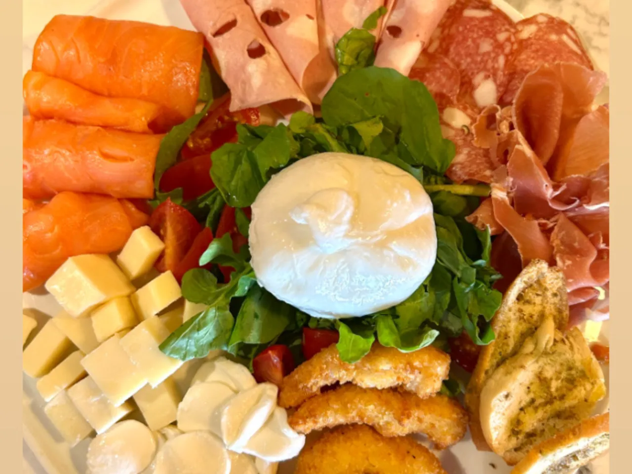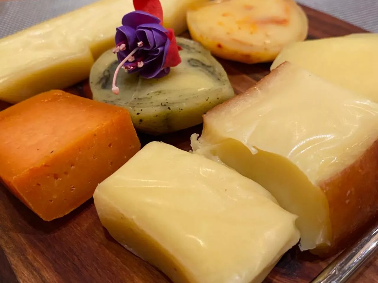 Queso brie al horno, trufas de queso azul y ricotta apanadas en almendras garrapiñadas, ciliegine di búfala, jamón serrano, chorizo vela, compota de tomates cherrys, pesto de albahaca, uchuvas, almendras acompañados de baguette.