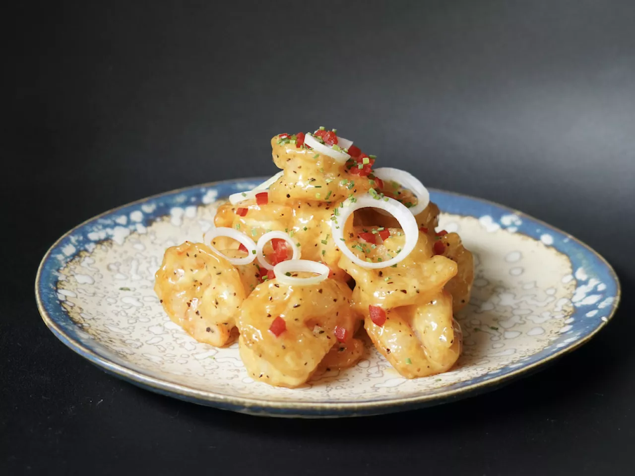 Camarones melosos bañados en miel de maracuyá, rocoto y salsa tobanjan