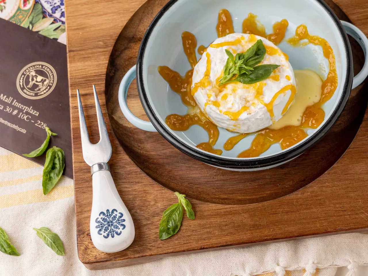 Camembert sopleteado, acompañado de frutas de la estación confitadasen azúcar y suave mantequilla con rucula