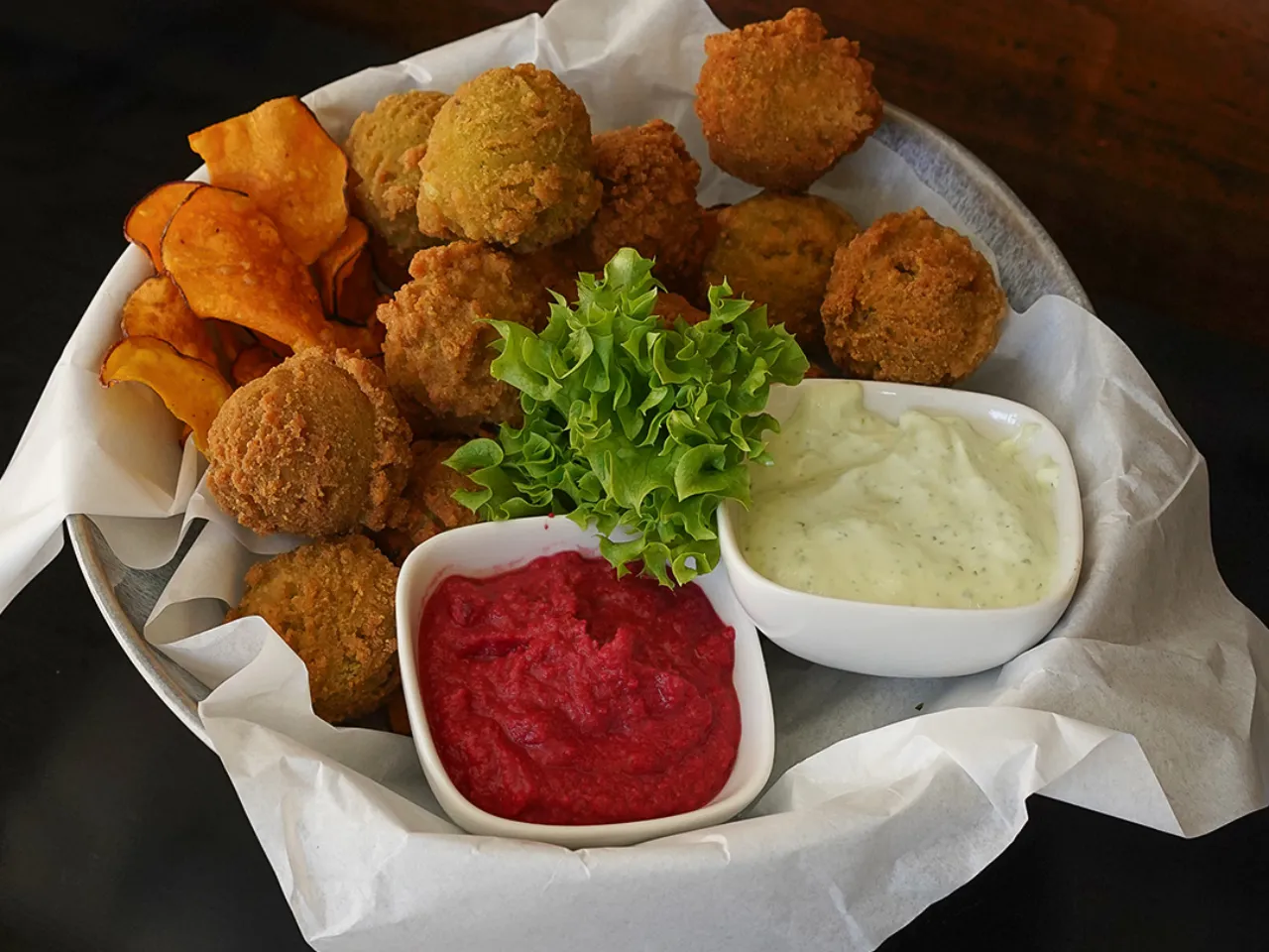 Donuts saladas de masa densa a base de harina de garbanzos acompañada de ligera y fresca salsa de menta