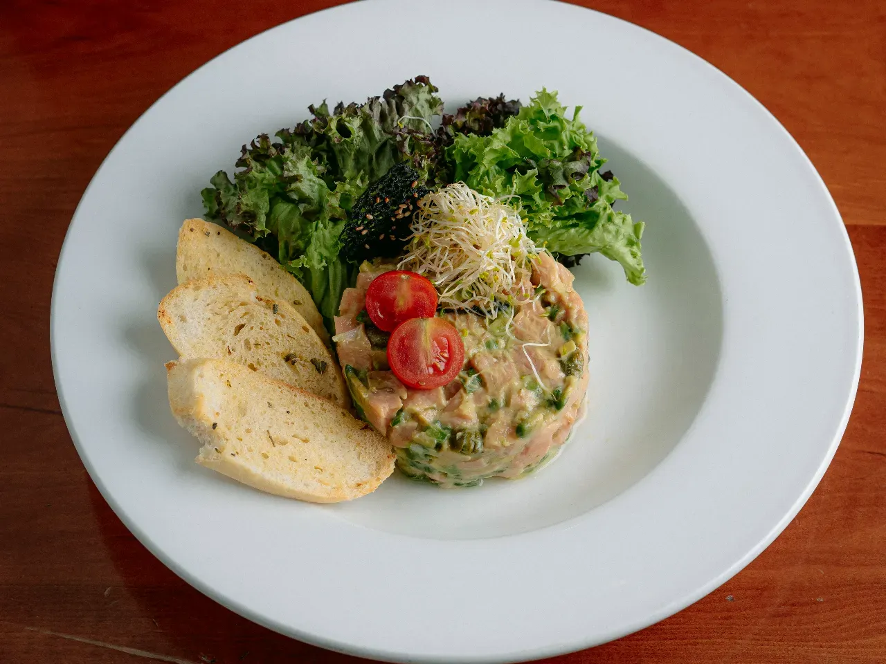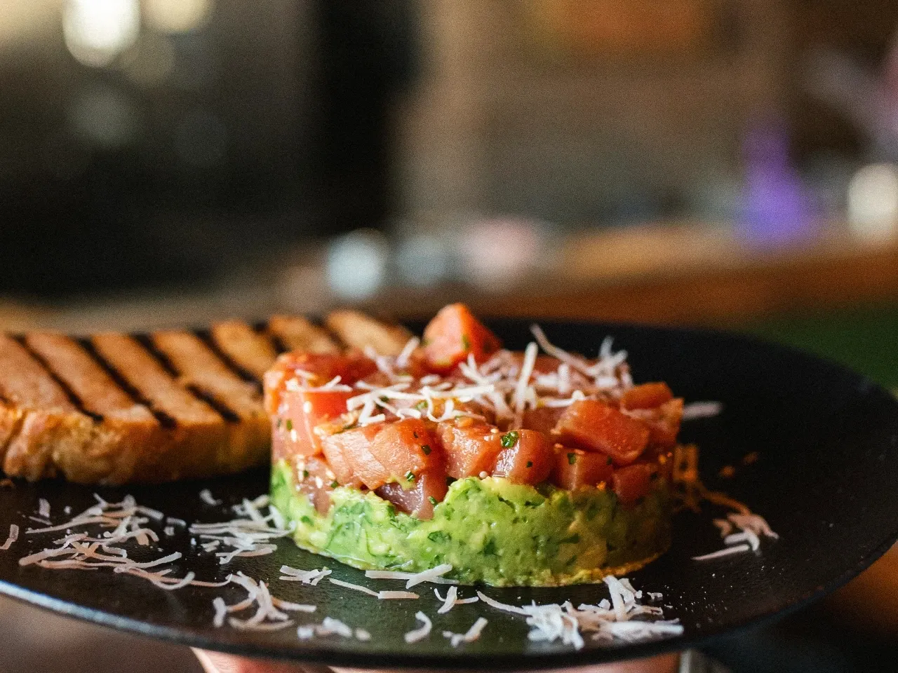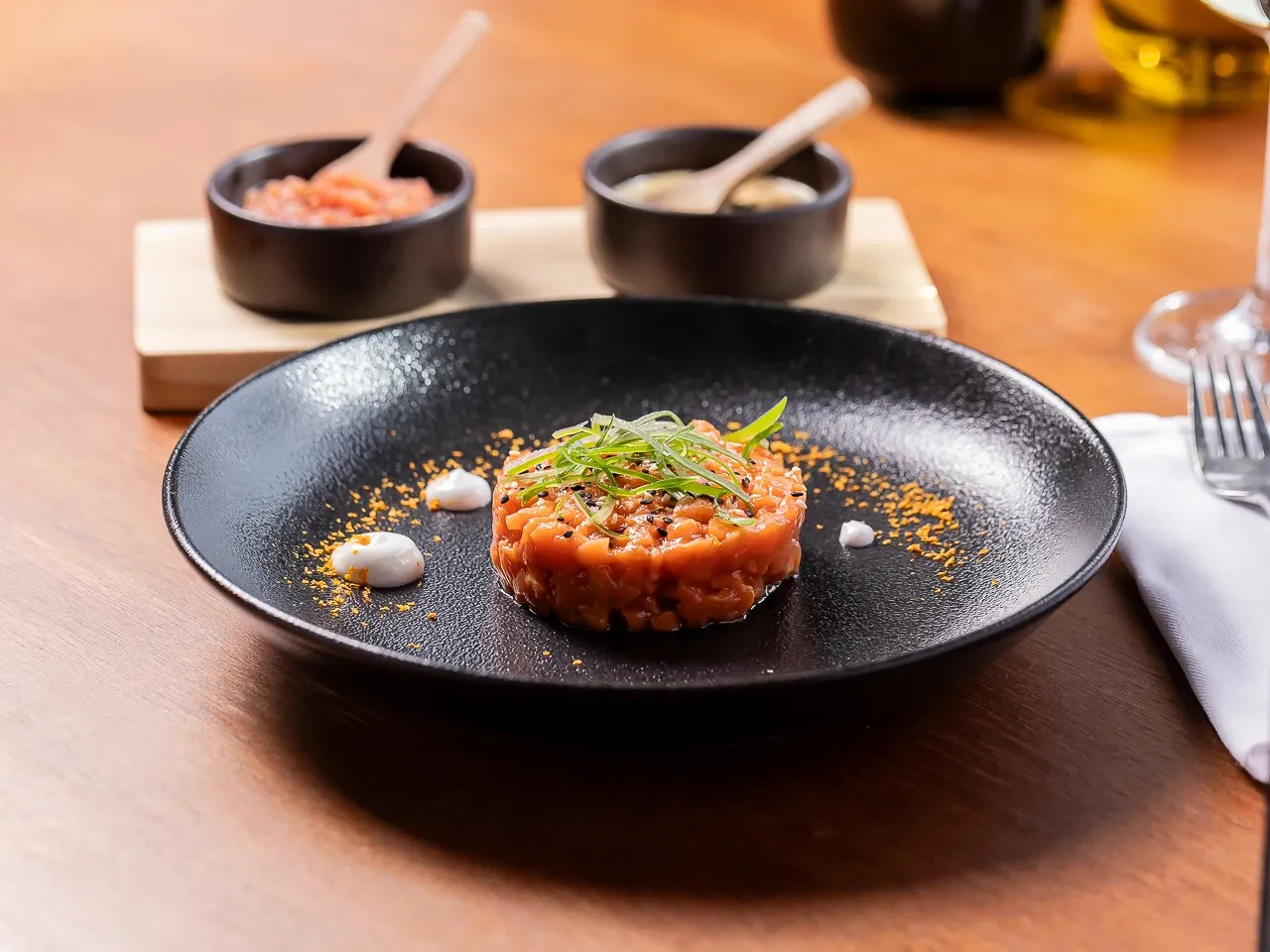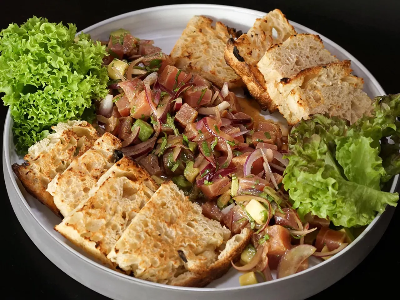 Salmón con palta y sésamo sazonado con un aliño cítrico, acompañados de cebollín y tostadas