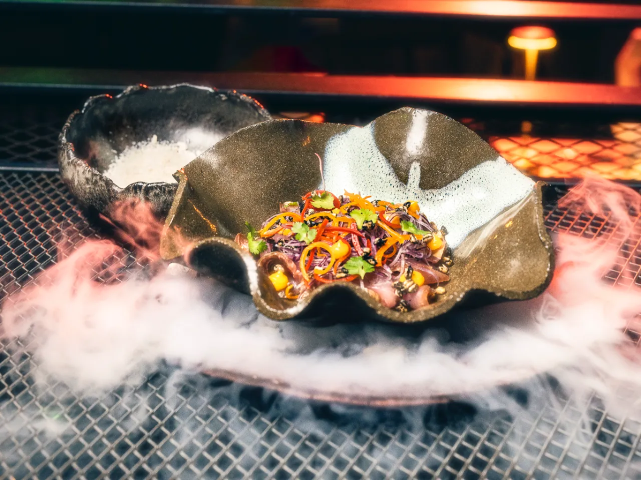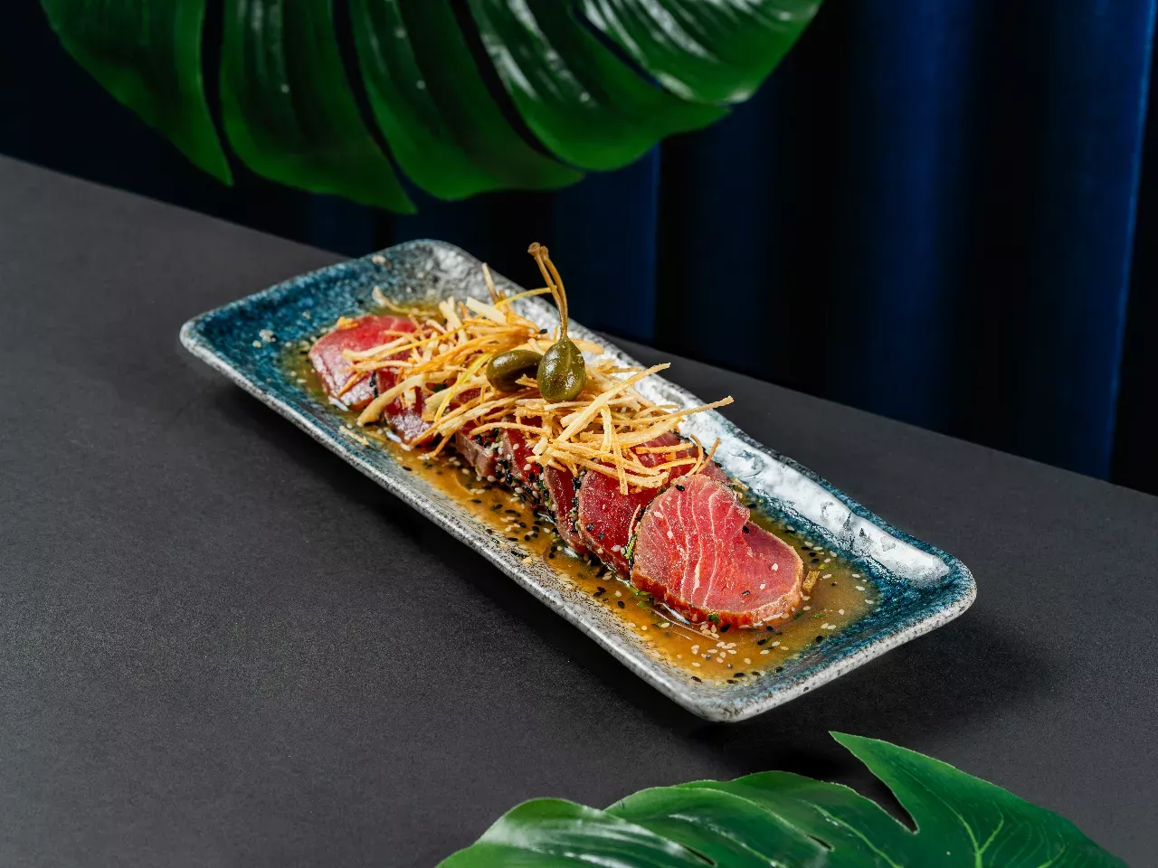 Atún tataki, emulsión de cilantro, sriracha, pico de gallo, salsa ponzu ahumada y salsa de ají amarillo