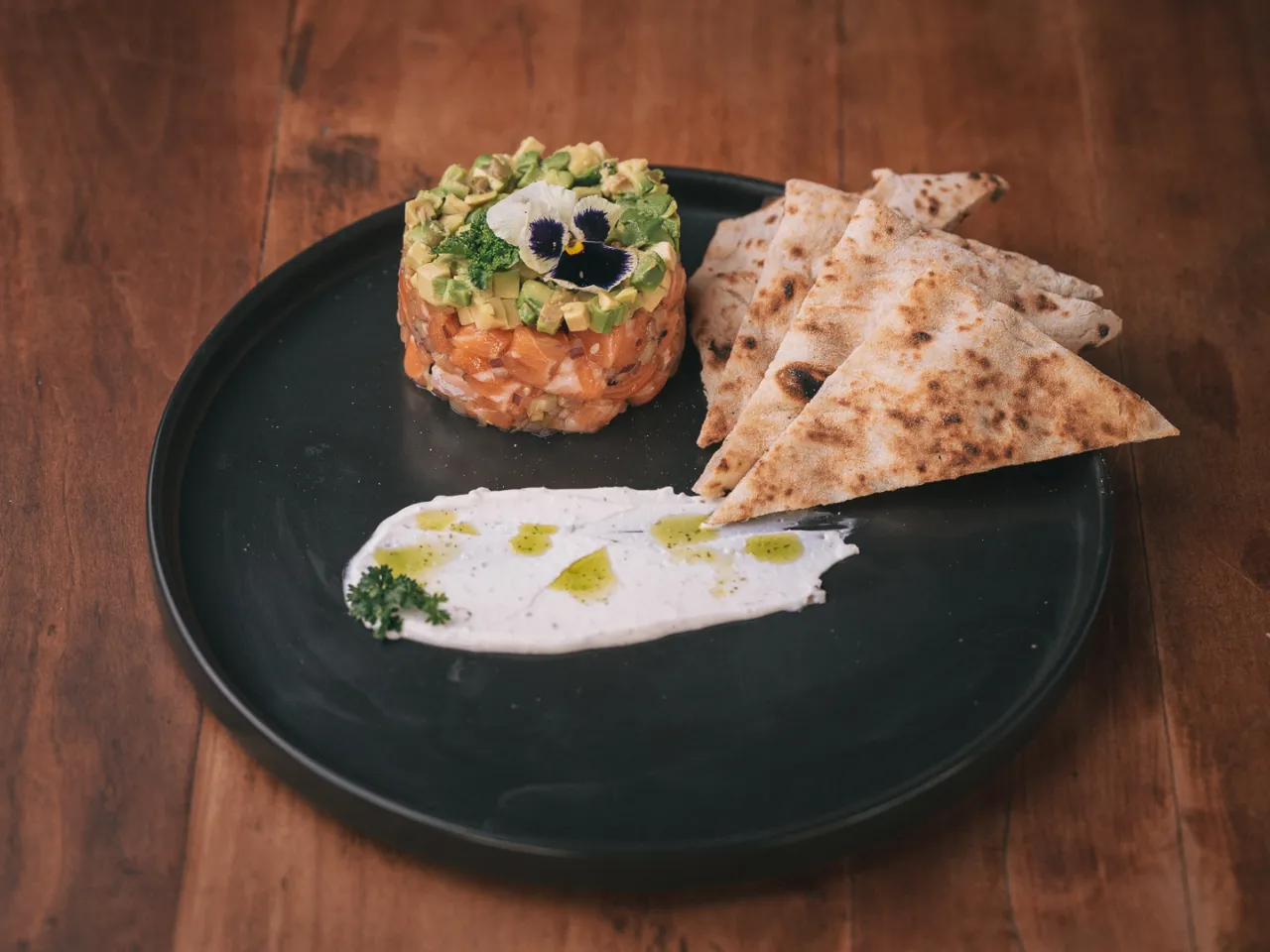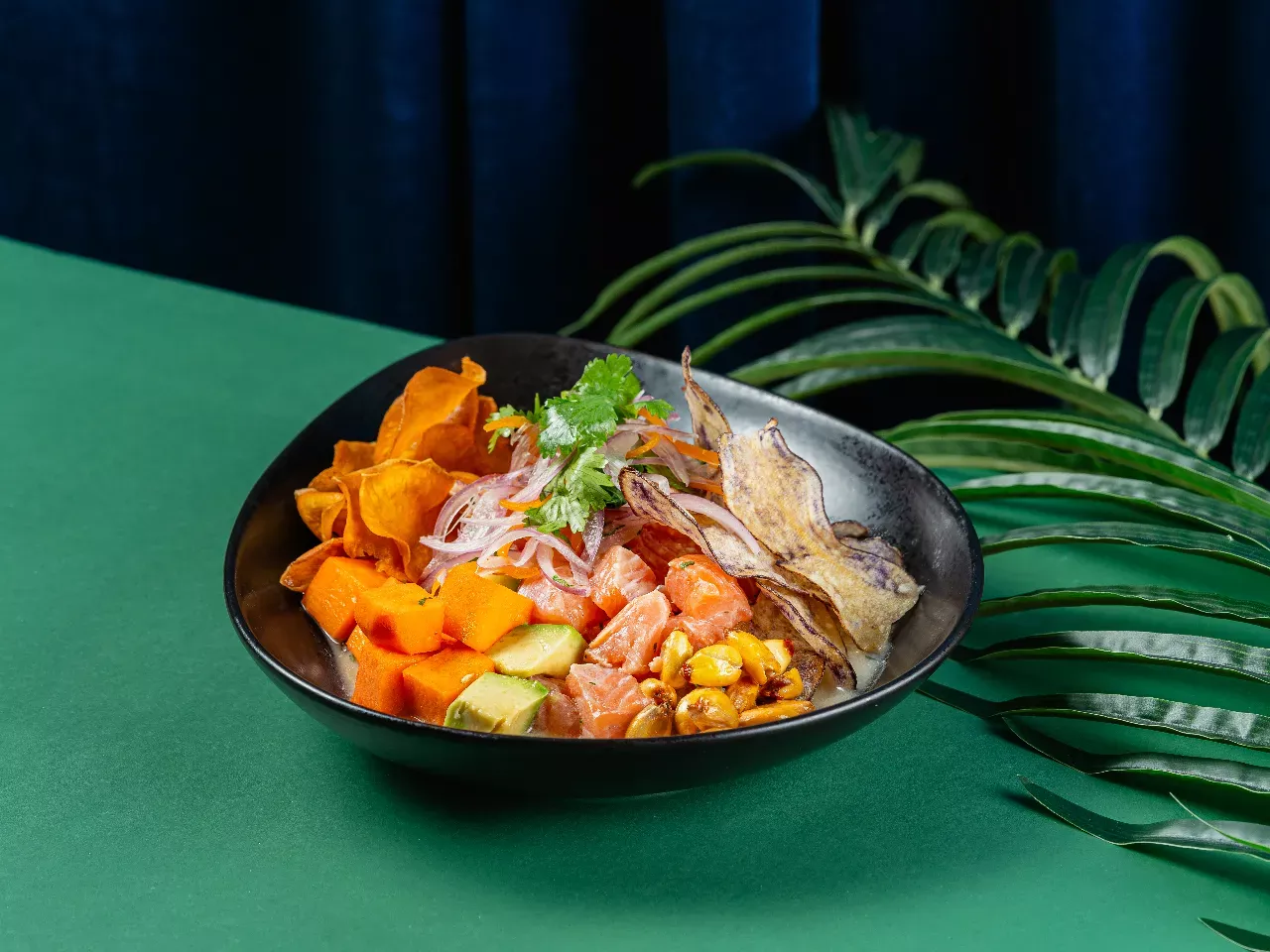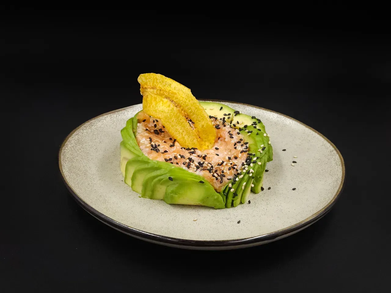 Salmon marinado en nuestra leche de tigre con el toque perfecto de acidez, coronado con palta y acompañado a parte de crujientes tortillas y plátano verde frito.