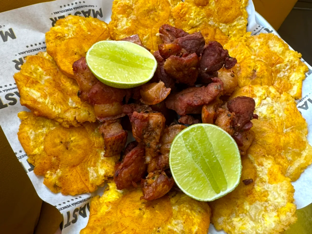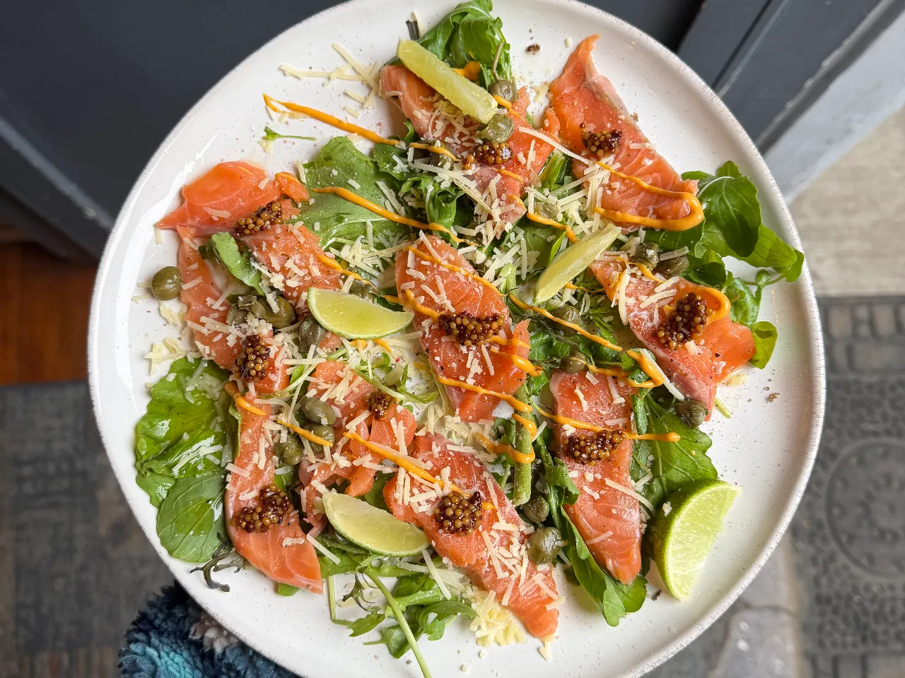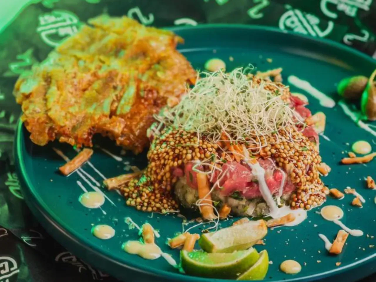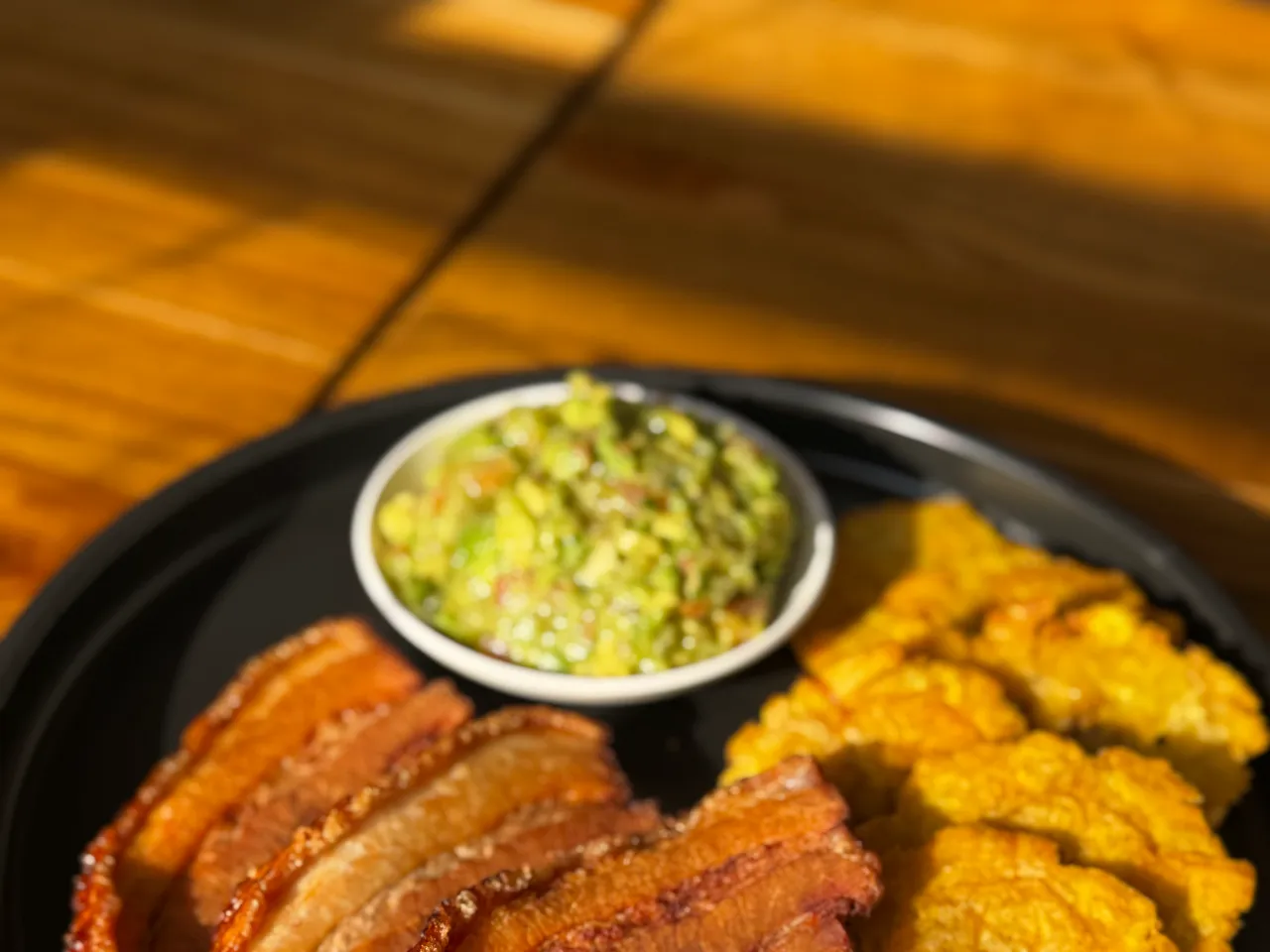 Salmon marinado en nuestra leche de tigre con el toque perfecto de acidez, coronado con palta y acompañado a parte de crujientes tortillas y plátano verde frito.