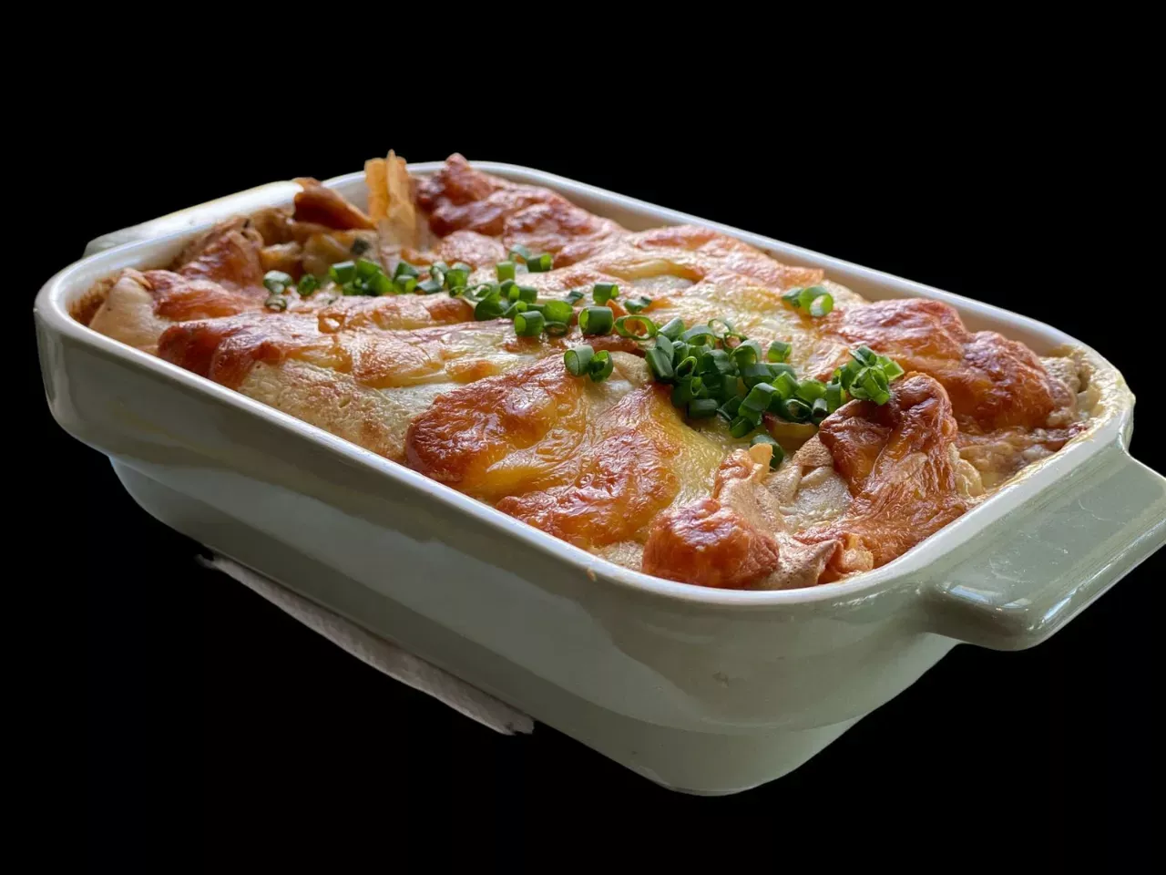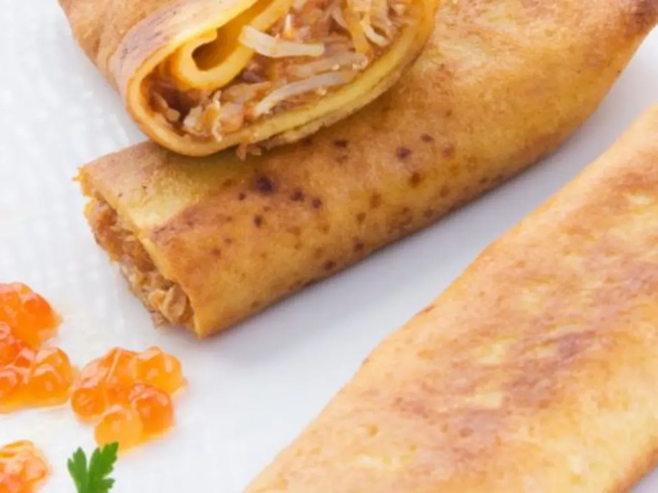 Suaves crêpes rellenos con pollo desmechado, salsa bechamel y gratinados en queso mantecoso.