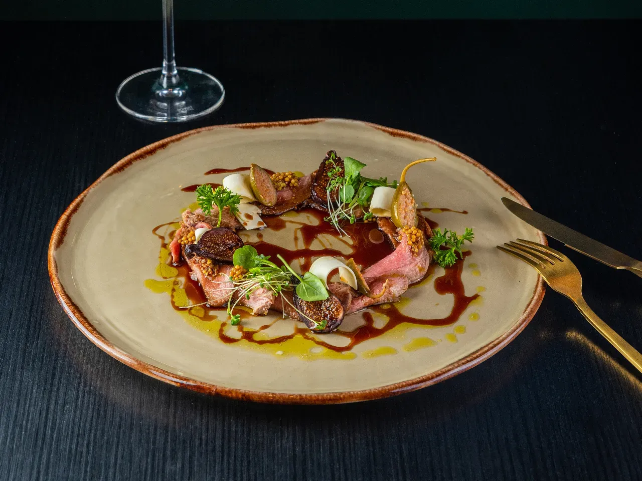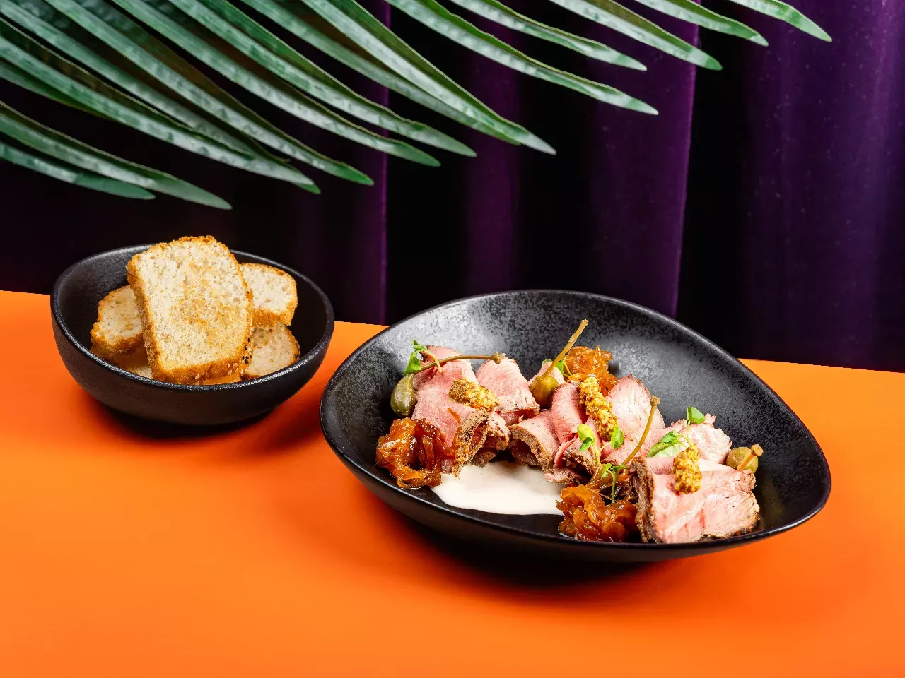 Lomo de res sellado y acompañado de crema de palta, salsa de olivo, salsa tonkatsu y hojas verdes