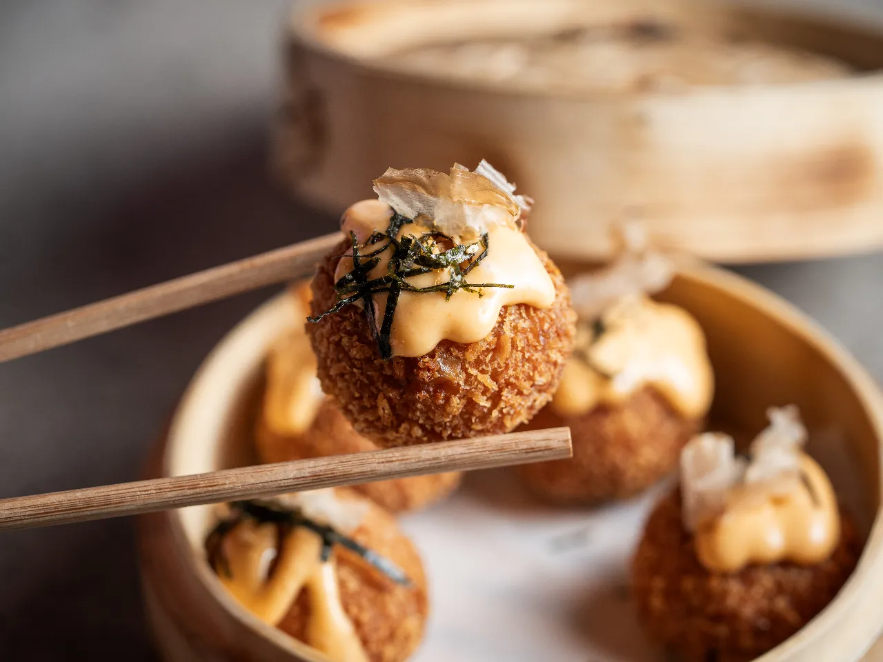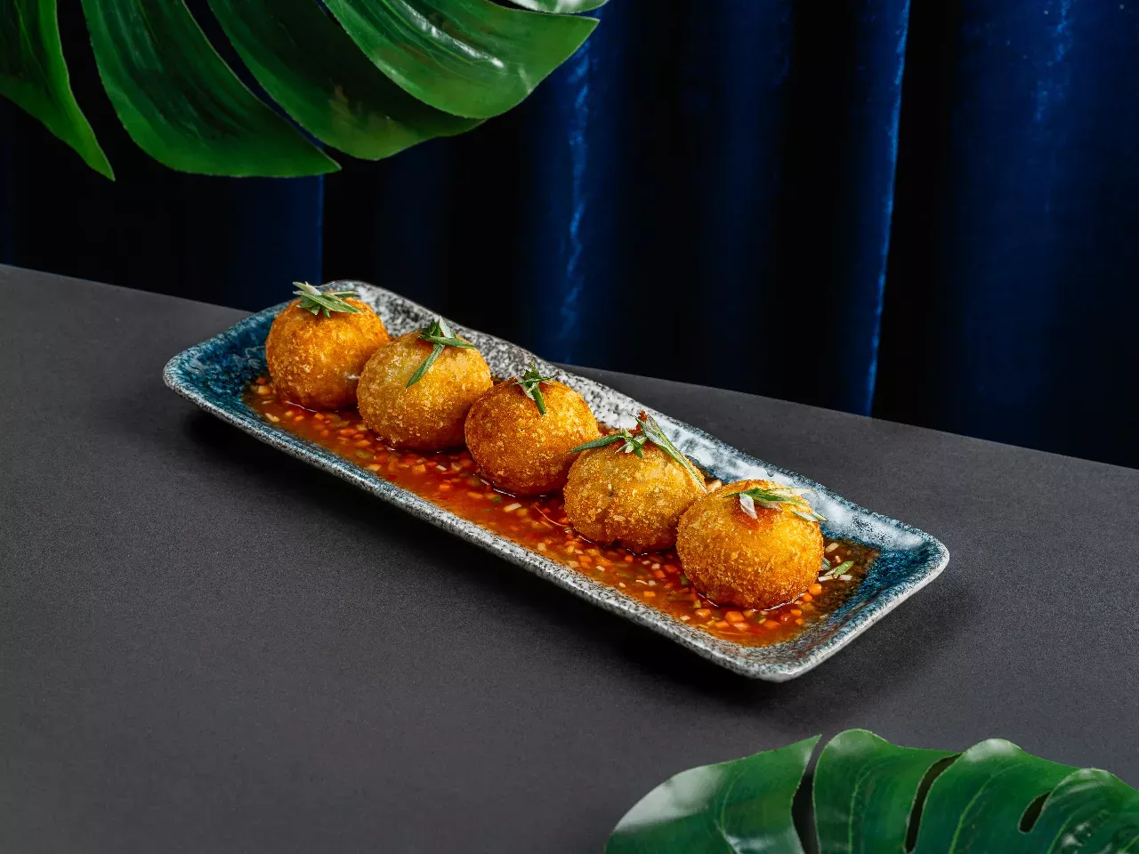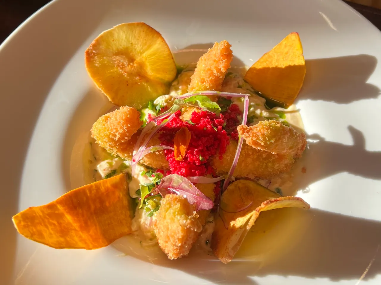 Bolitas de camaron fritas con topping de ceviche, crema de palta, salsa tare y batata frita