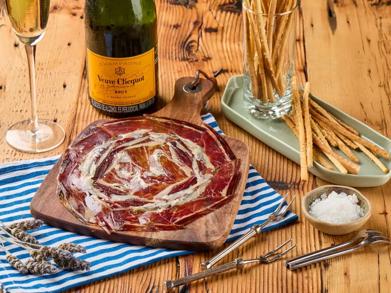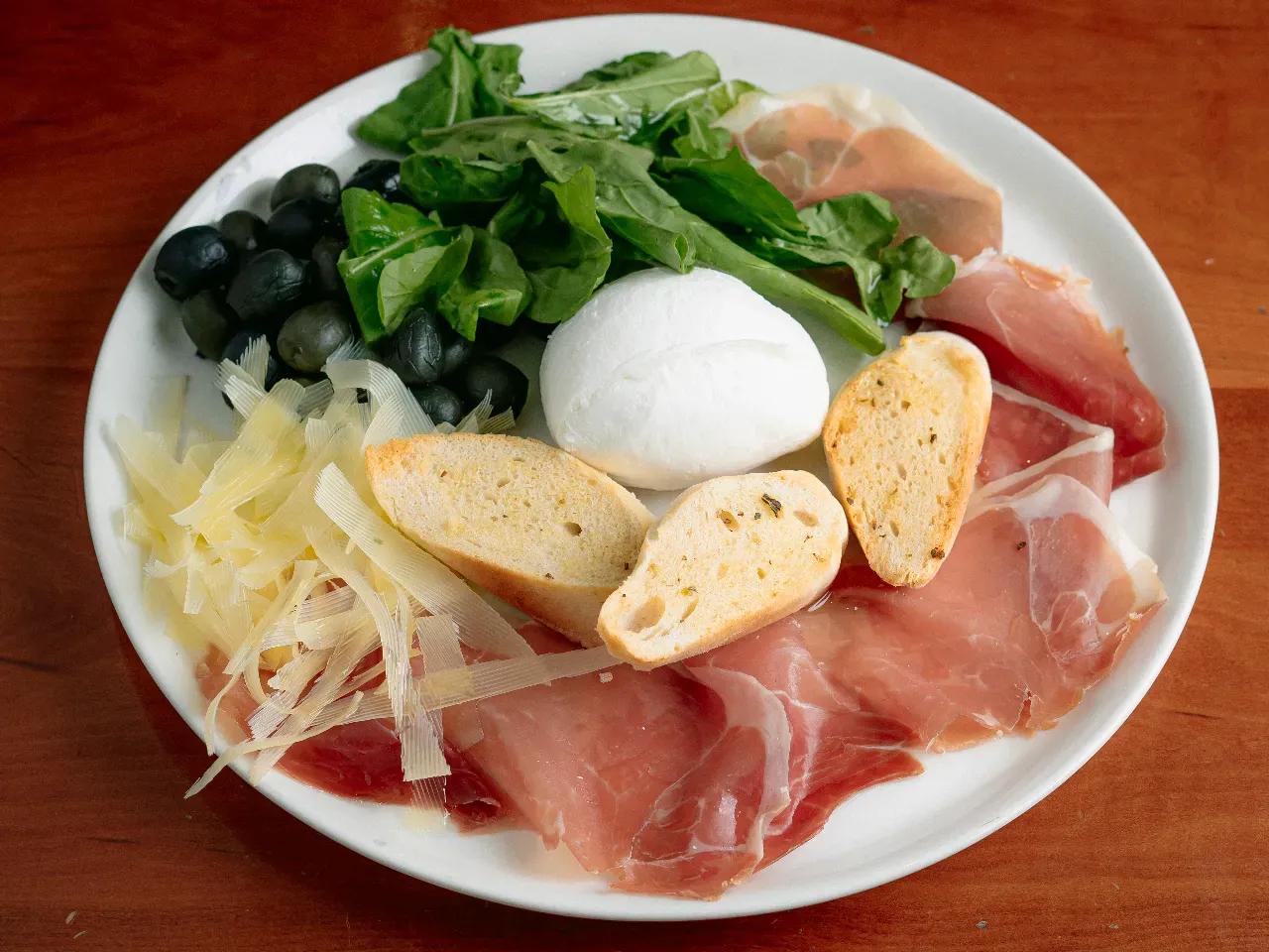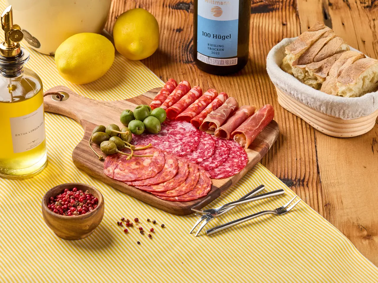 Jamón serrano, arrollado de huaso, arrollado de marambre, champiñones salteados, aceitunas y queso de la zona.