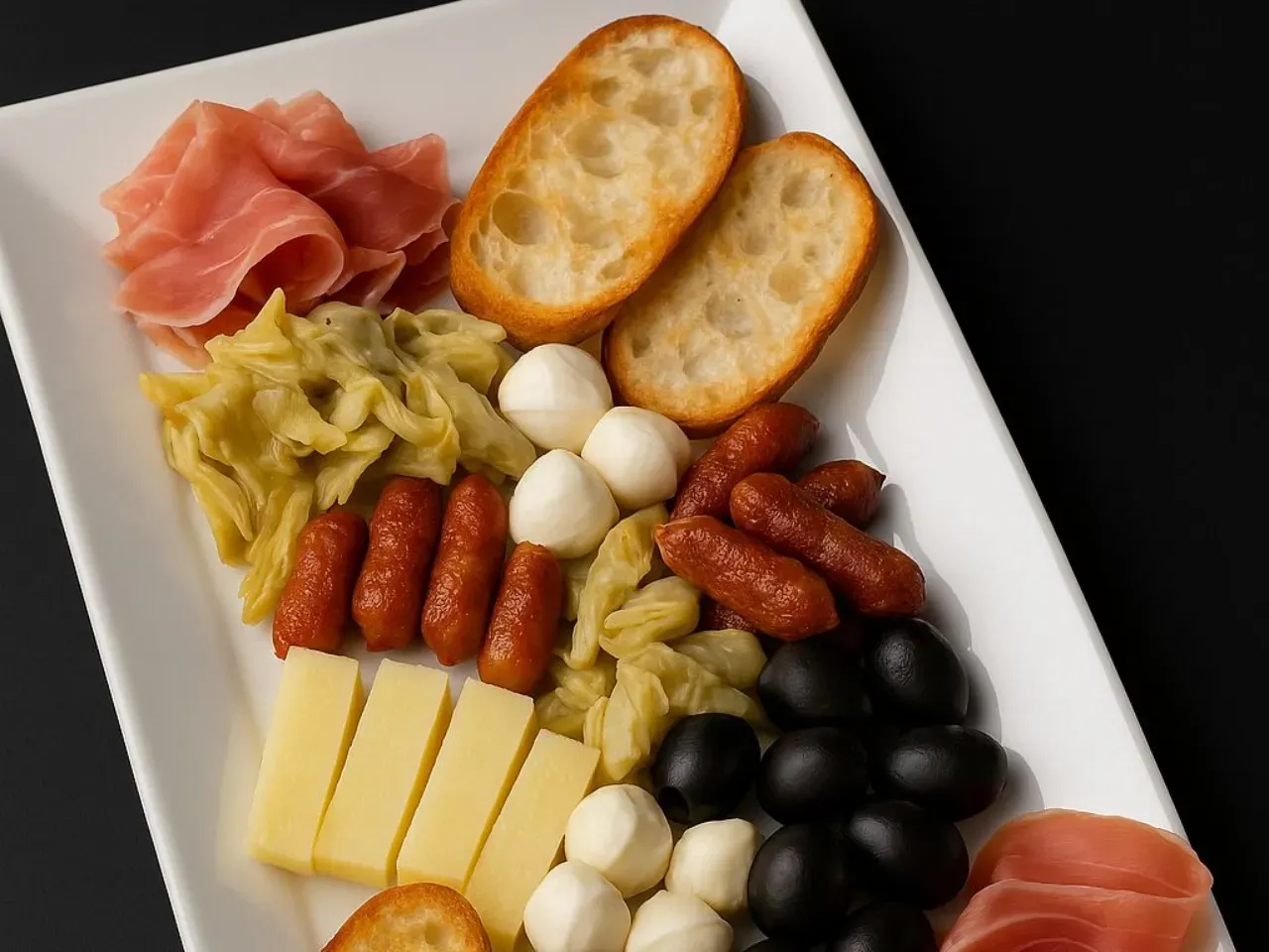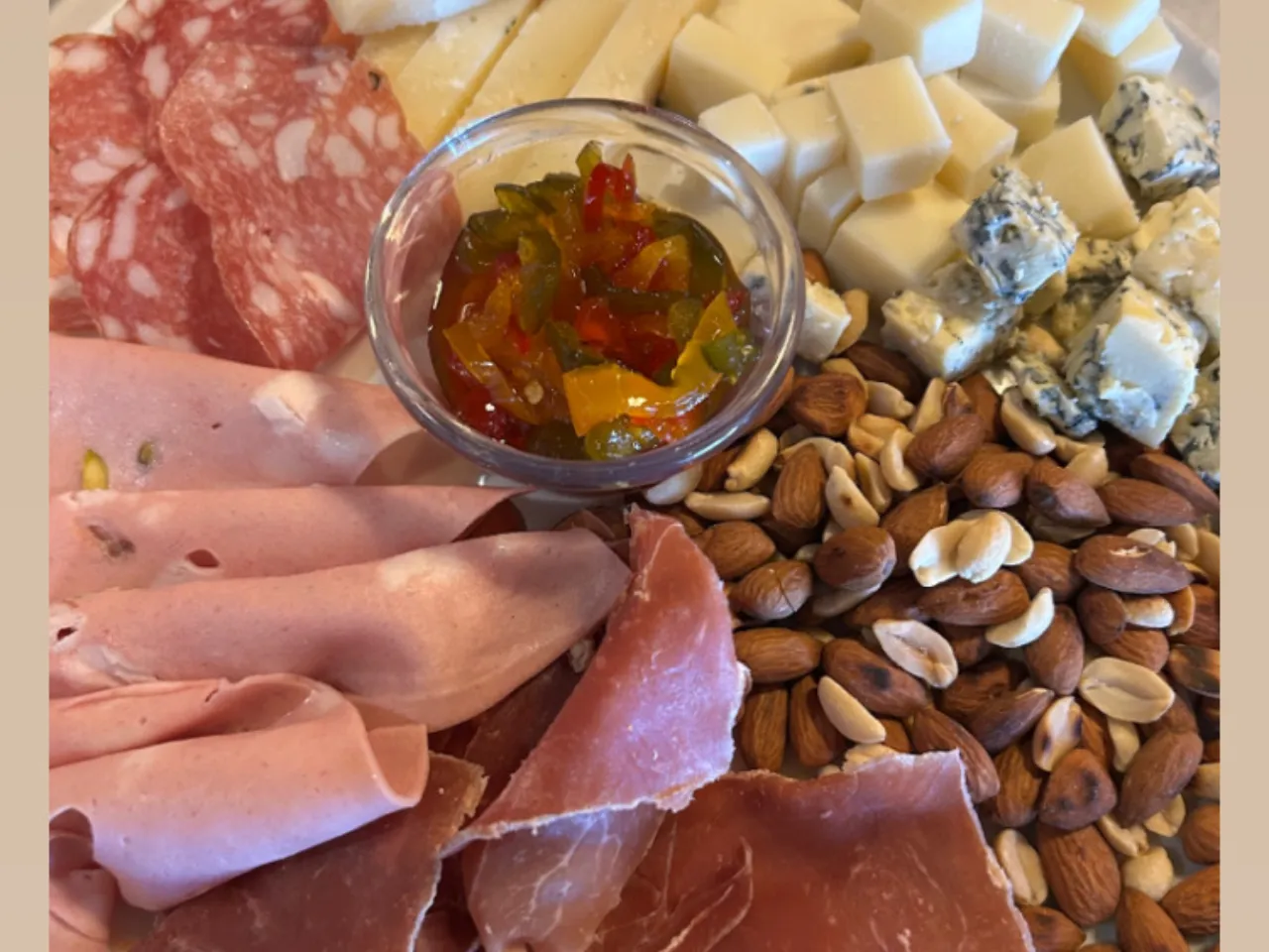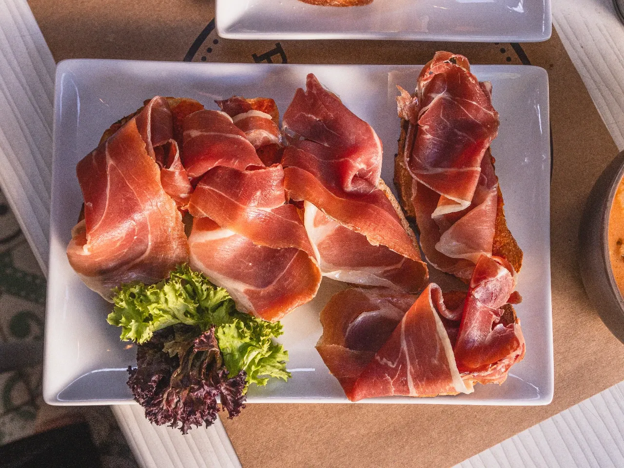 Jamón serrano, arrollado de huaso, arrollado de marambre, champiñones salteados, aceitunas y queso de la zona.