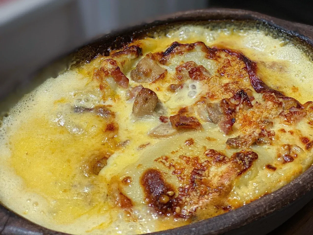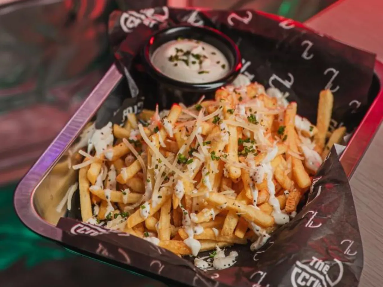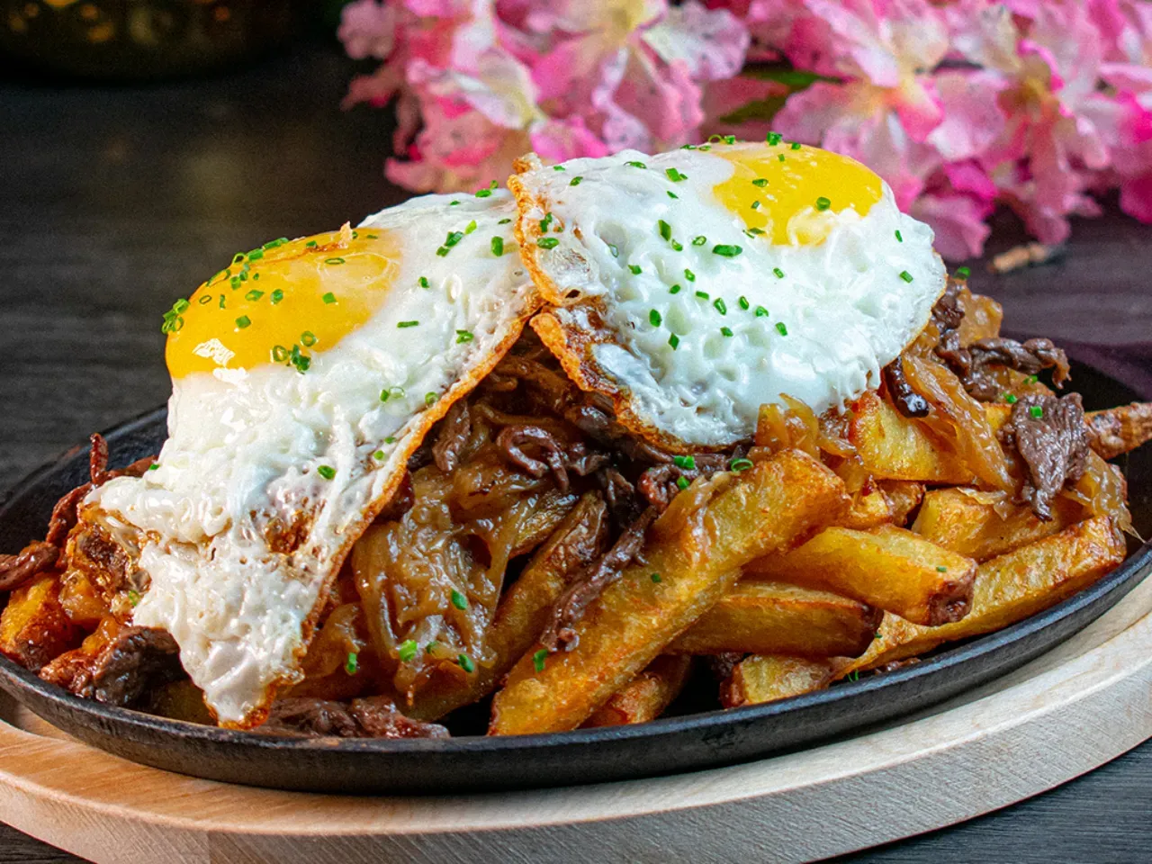 Papas fritas con queso cheddar, tocino, champiñones salteados y ciboulette acompañadas de una crema acida