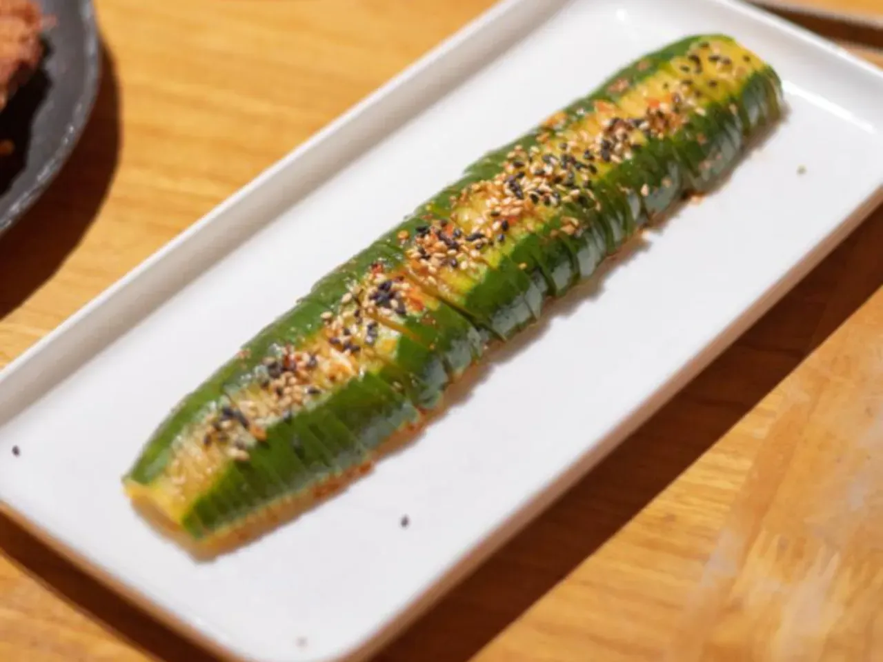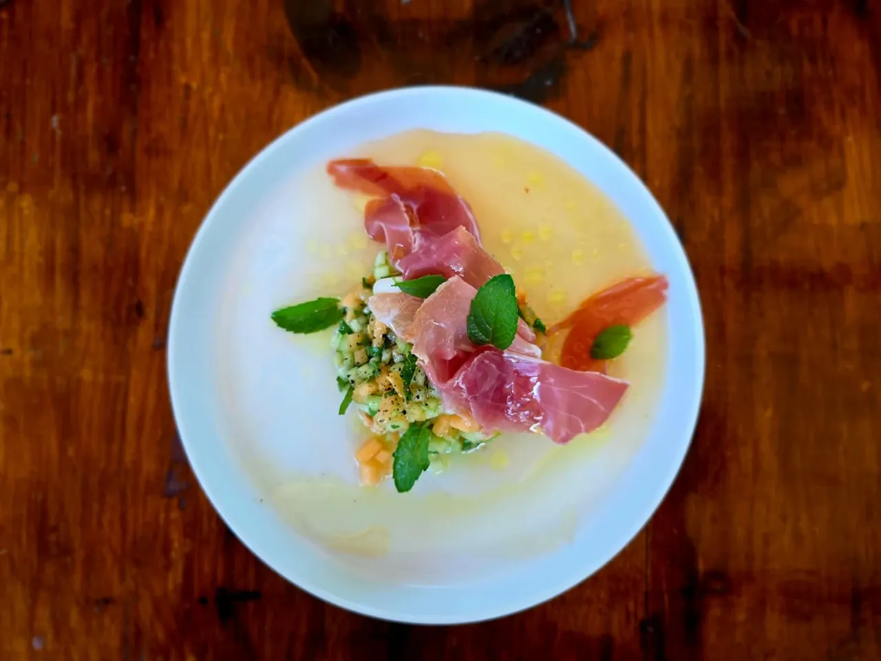 Melón laminado con pepinos laminados con aceto, miel, dressing y almendras garrapiñadas.