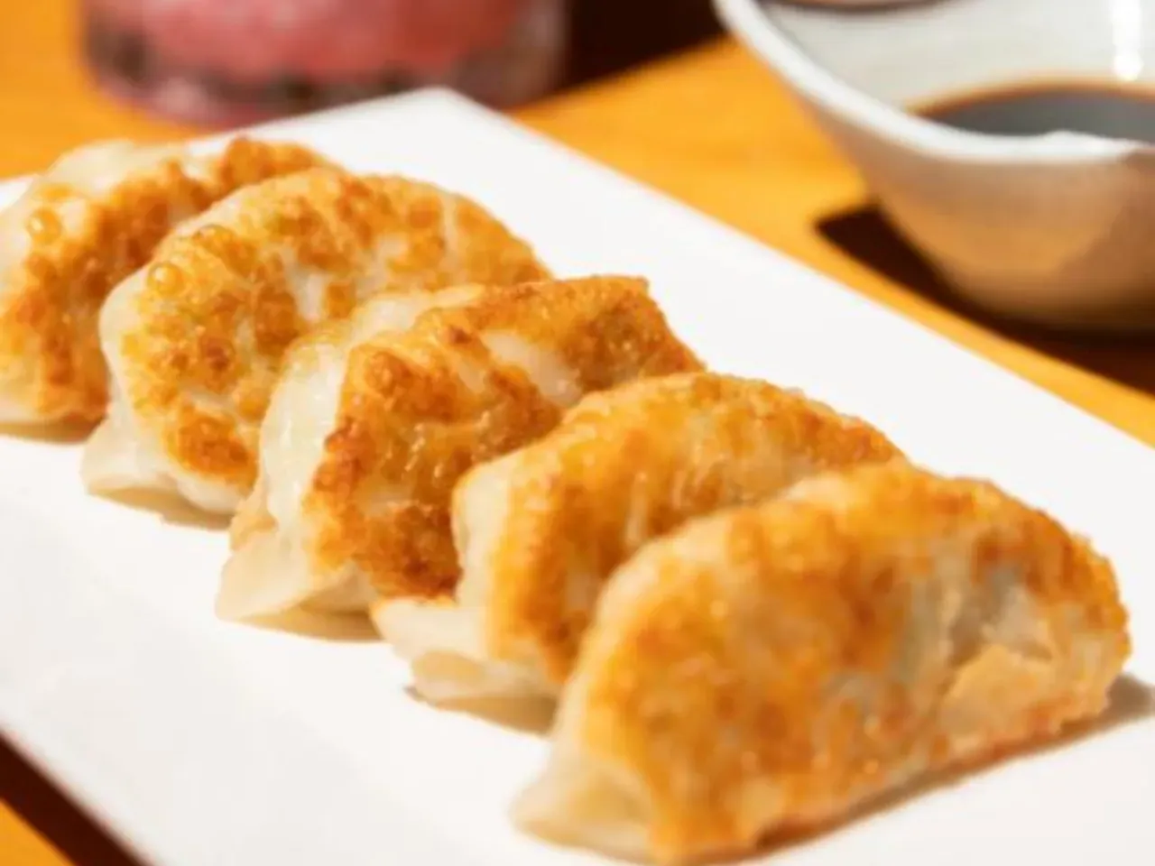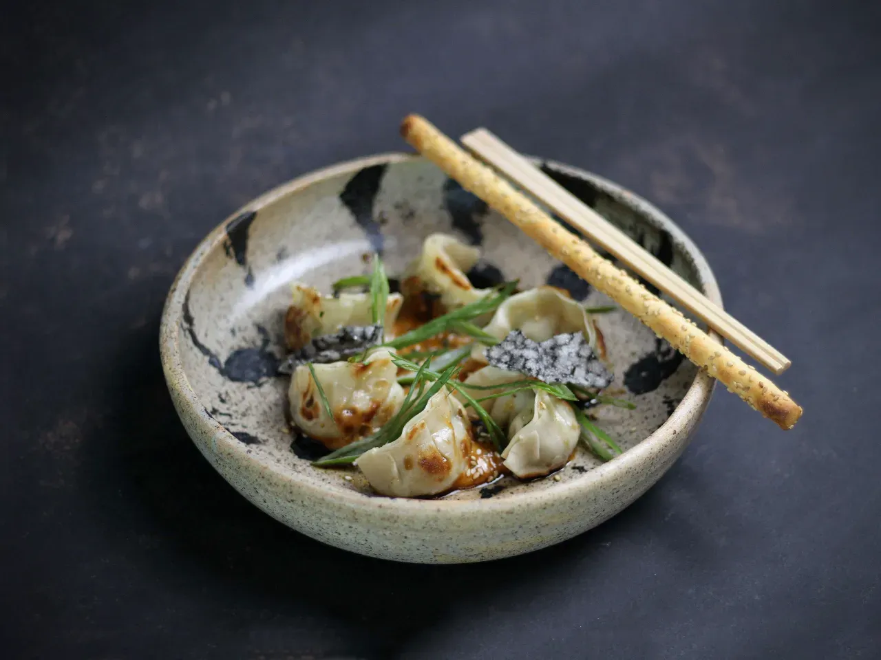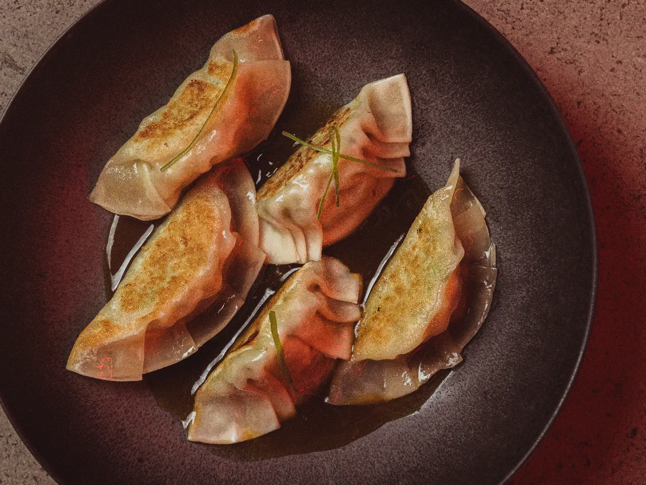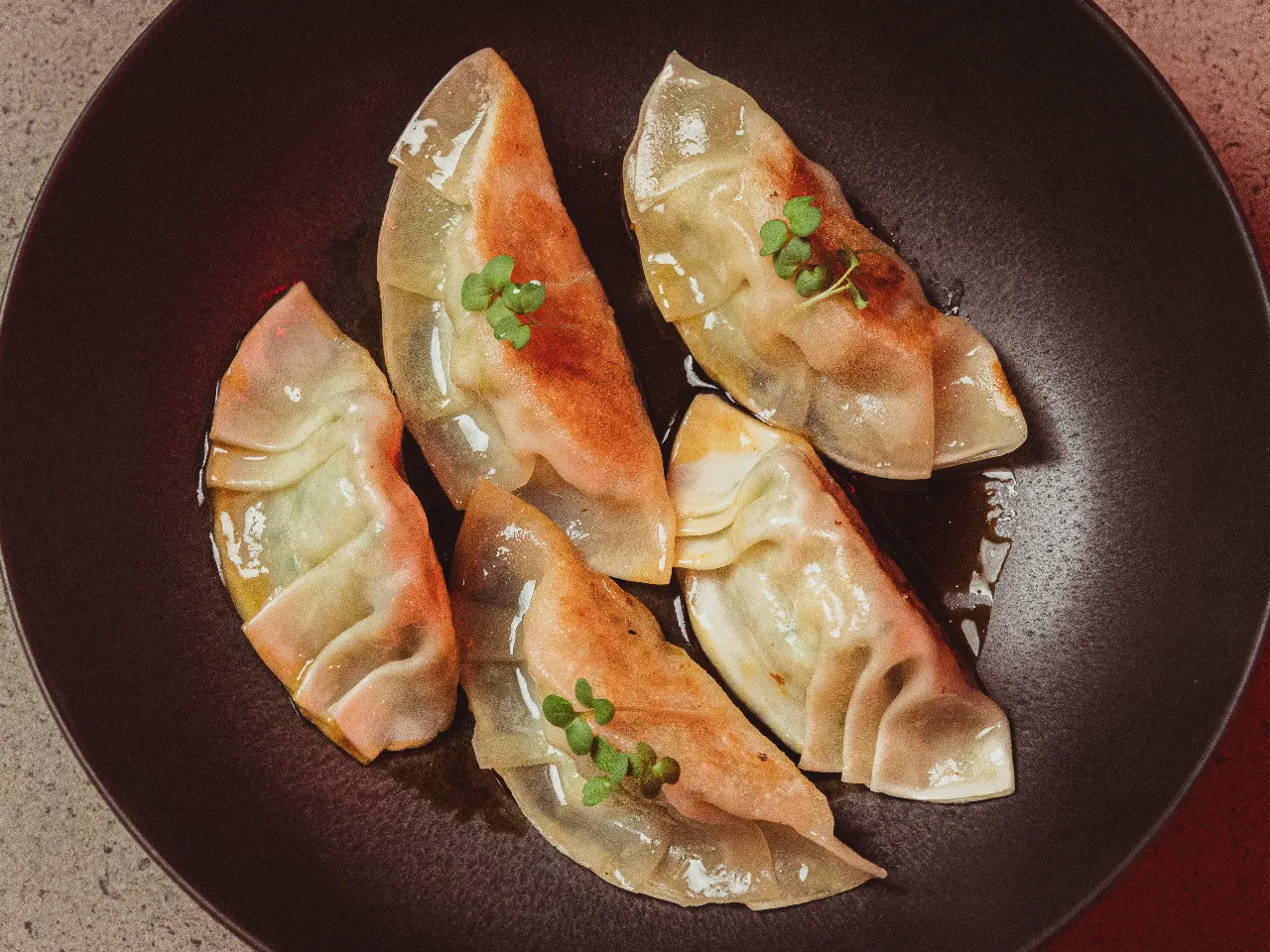 Rellenas de panceta de cerdo, camarones y verduras en salsa oriental
