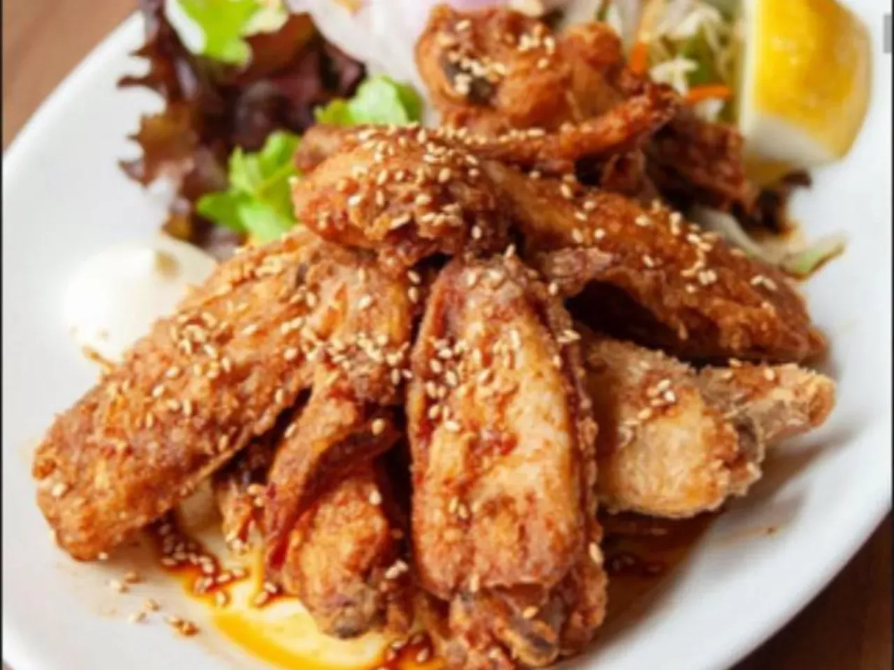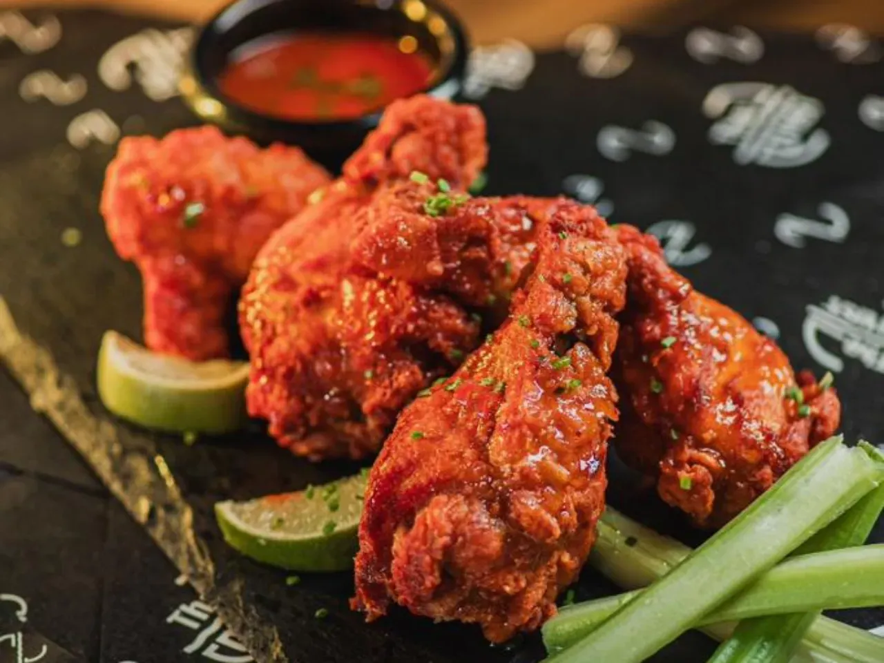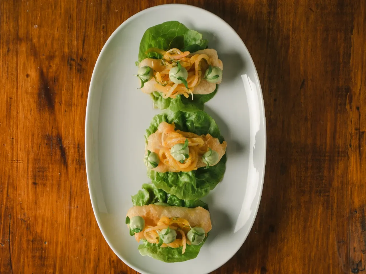 Con miel de maracuyá, chili garlic con papa hilo, cebolla de verdeo, brunoise de pimentón rojo y polvos de maní tostado.