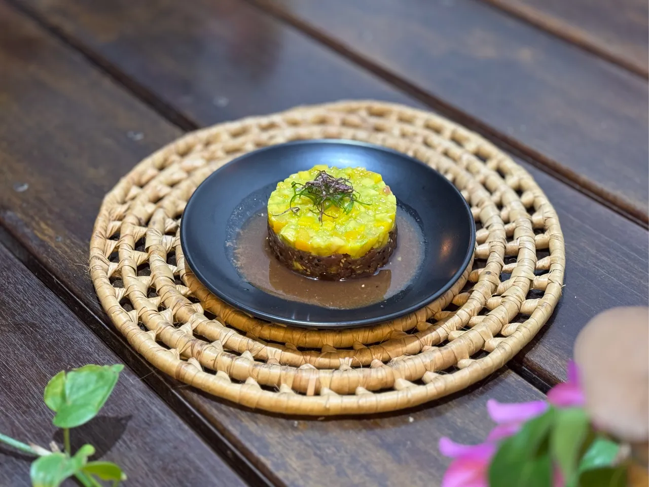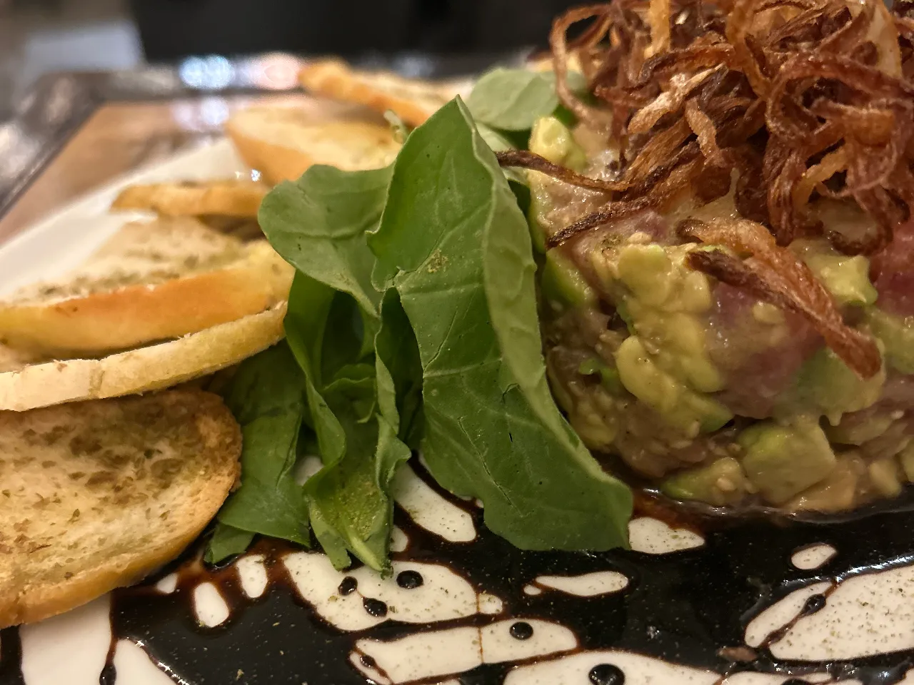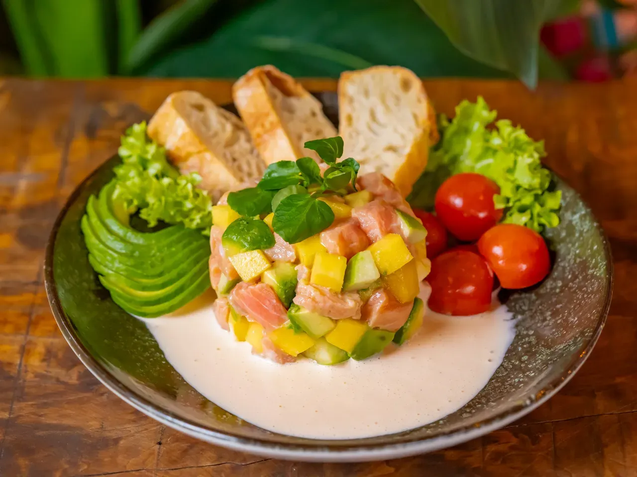 Trocitos de atún marinados en salsa de soya y aceite de sésamo con mango, aguacate (en temporada) y chips de plátano