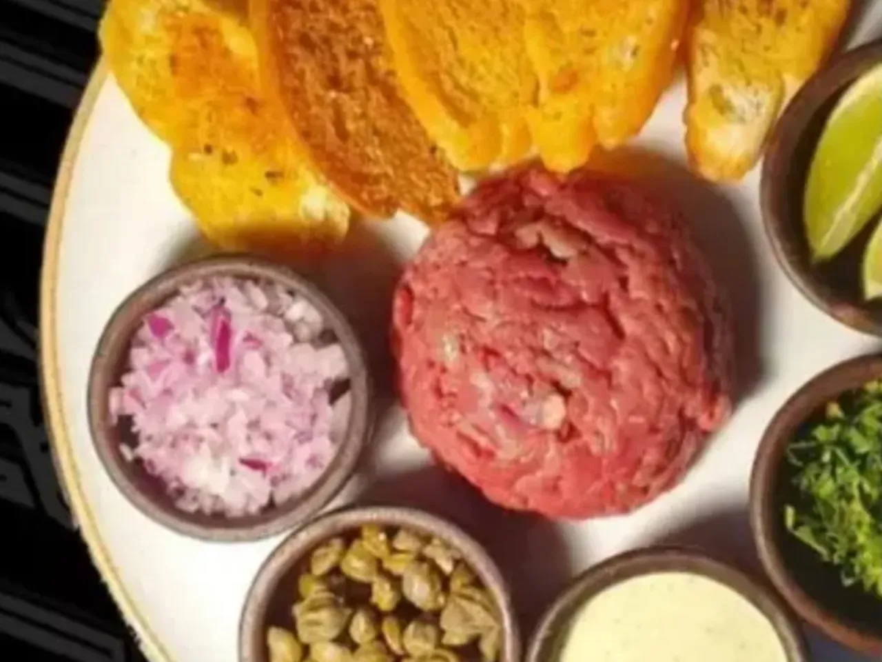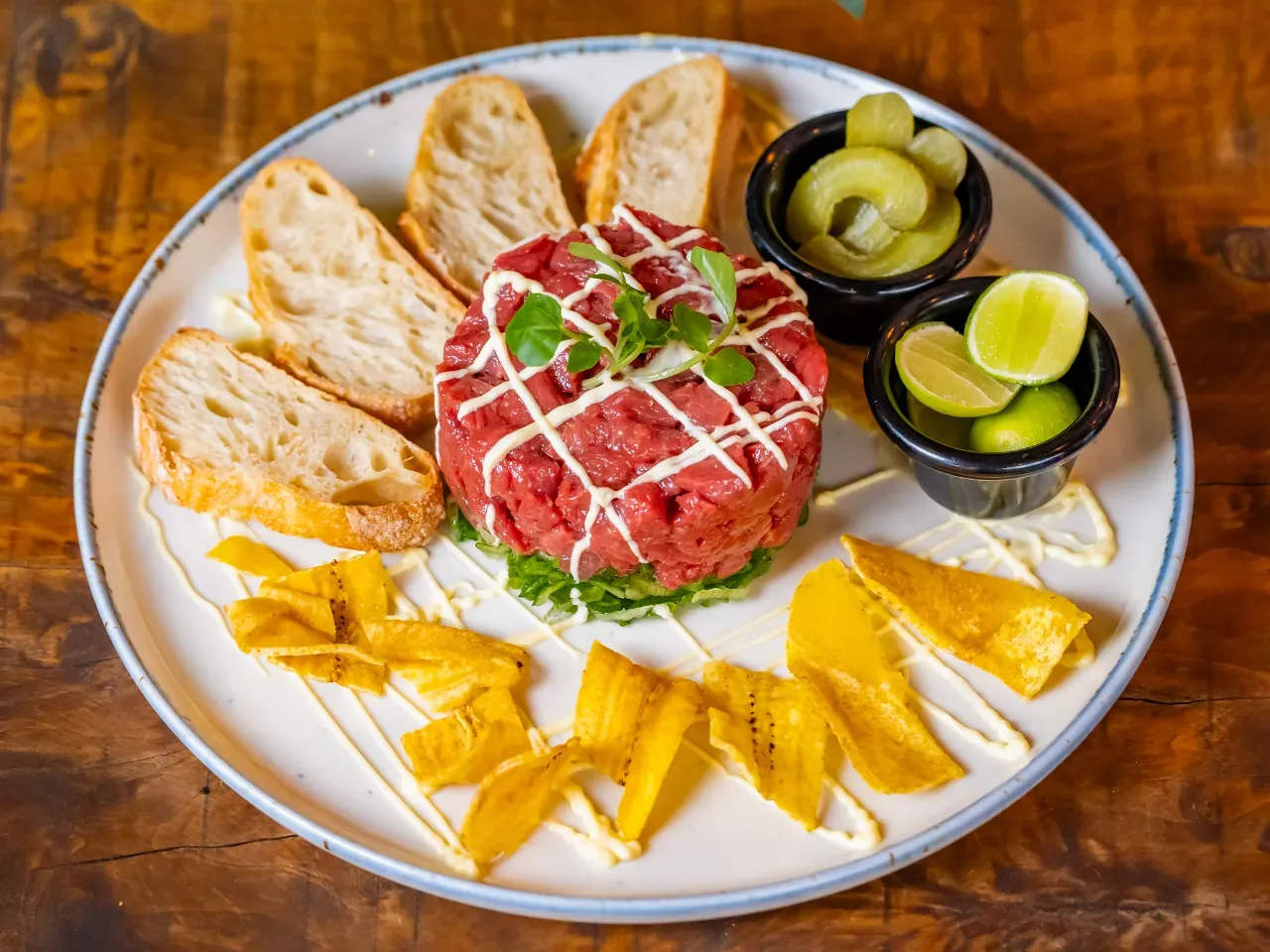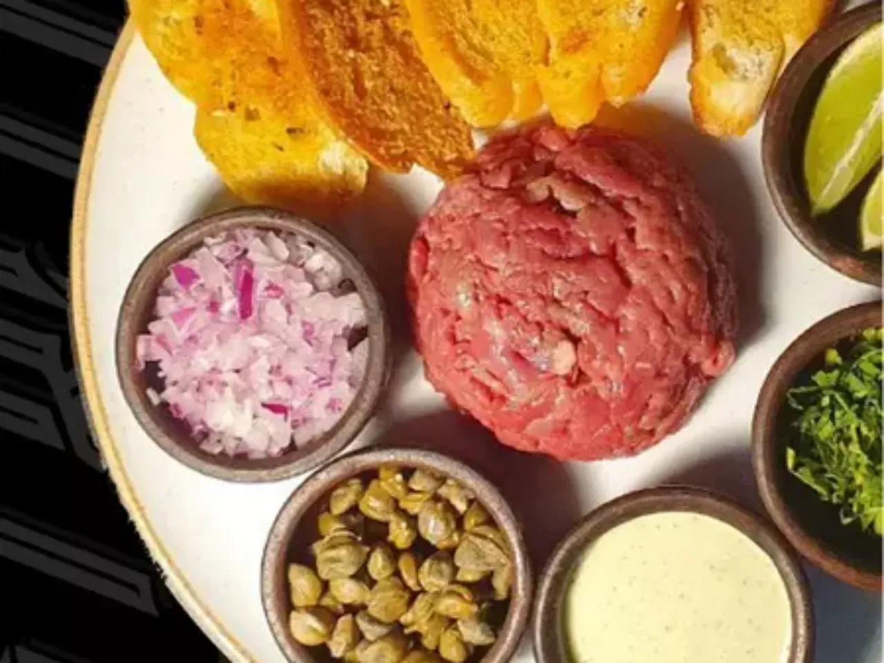 Carne de res molida en el momento, servida con pepinillos, cebolla perla, tostadas y Ali Oli